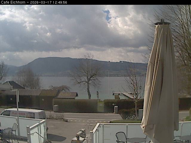- Ein Blick vom Café Eichhorn auf den Attersee, Oberösterreich.