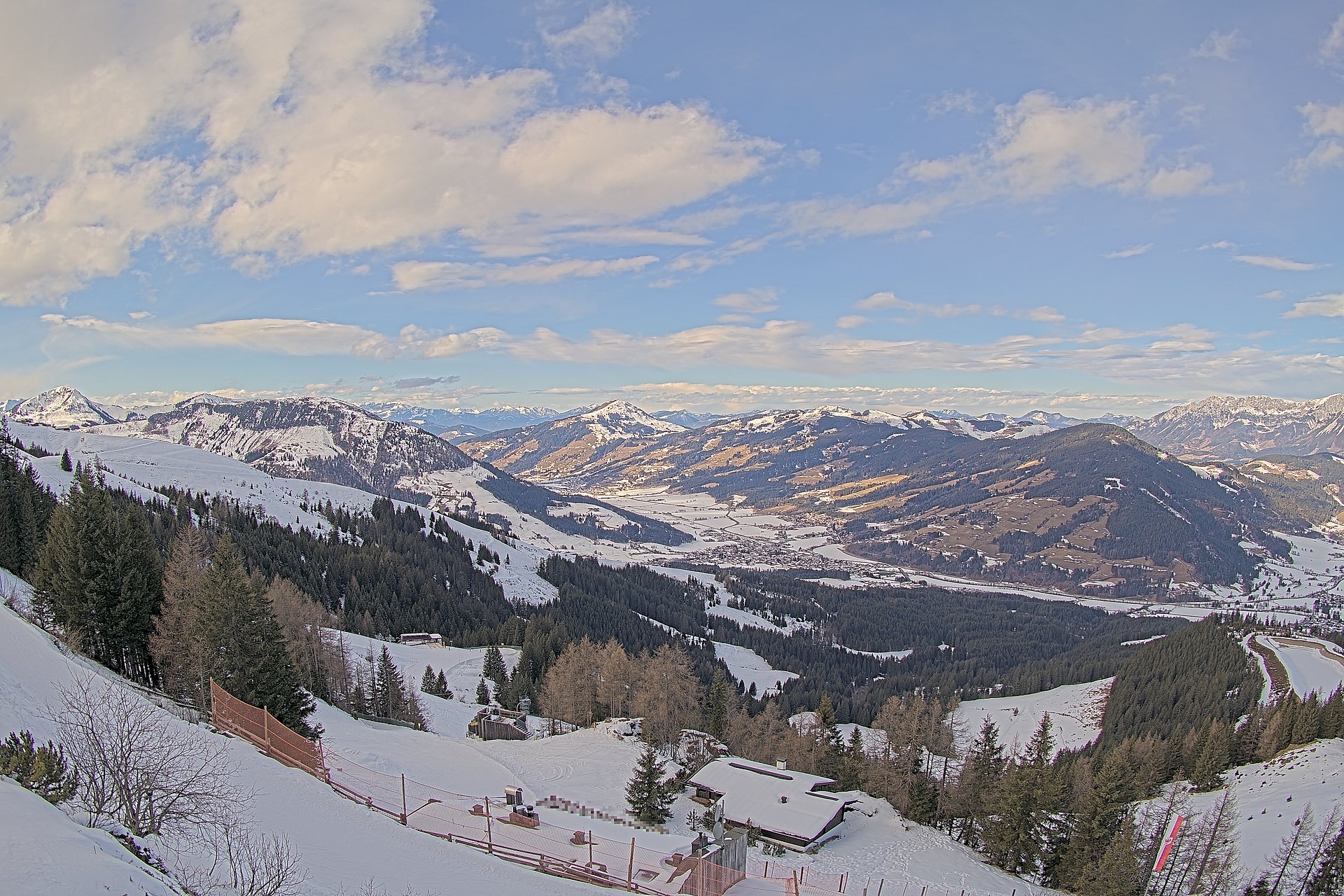- Panoramablick von der Hahnenkammbahn Bergstation in Richtung Brixental nach Kirchberg in Tirol, Brixen im Thale, Westendorf, Hohe Salve