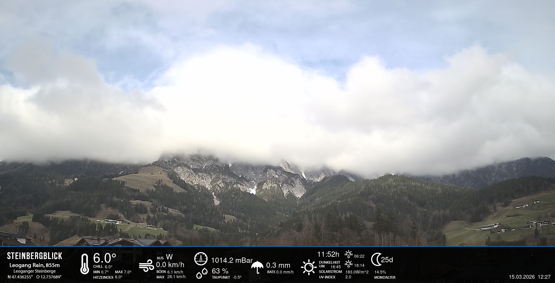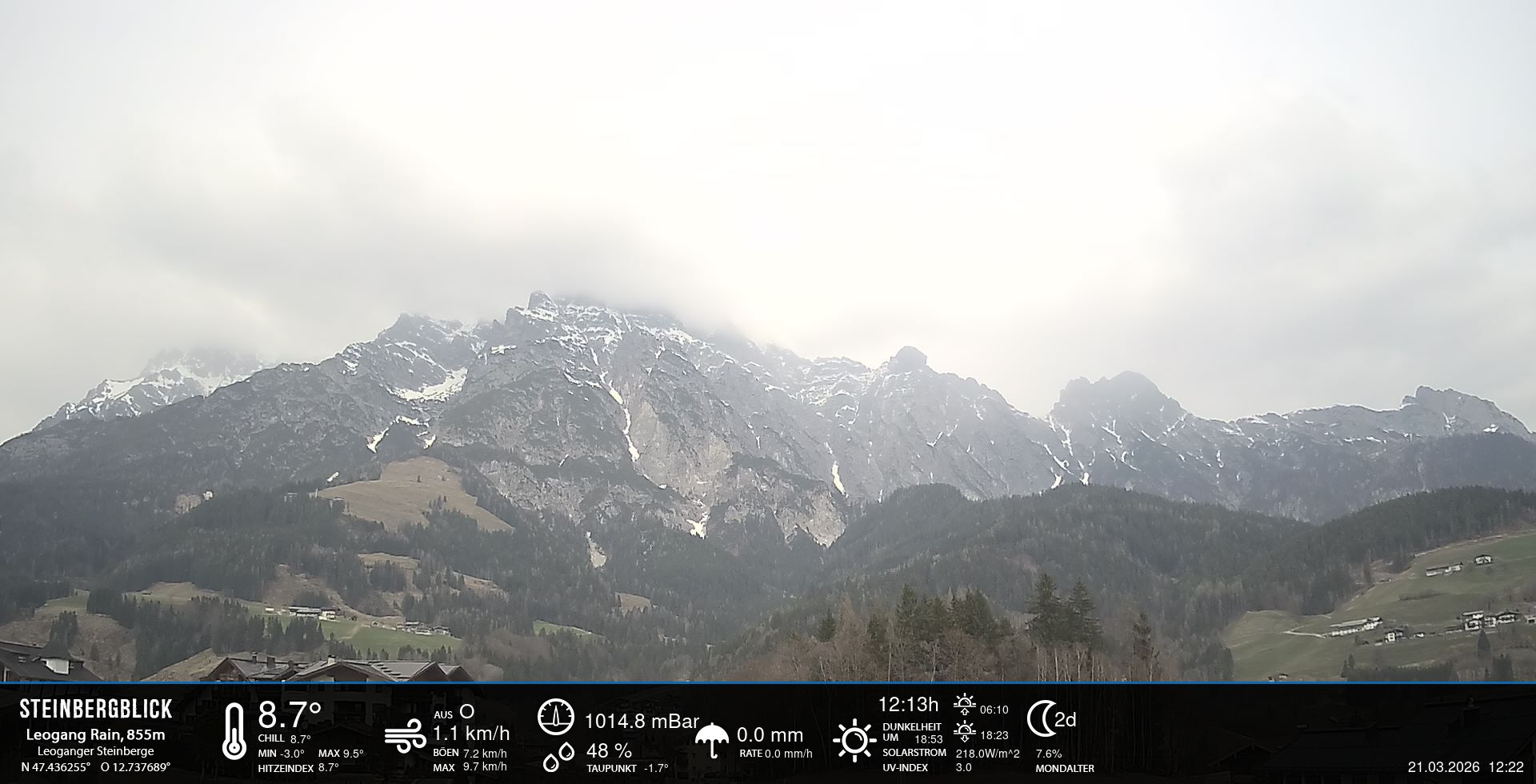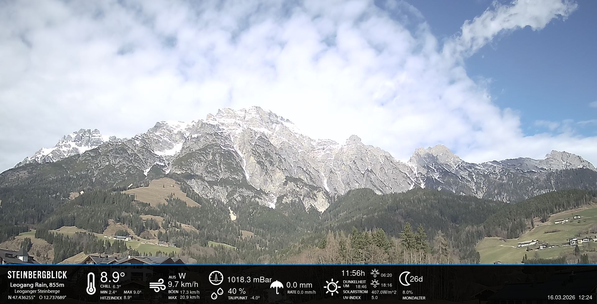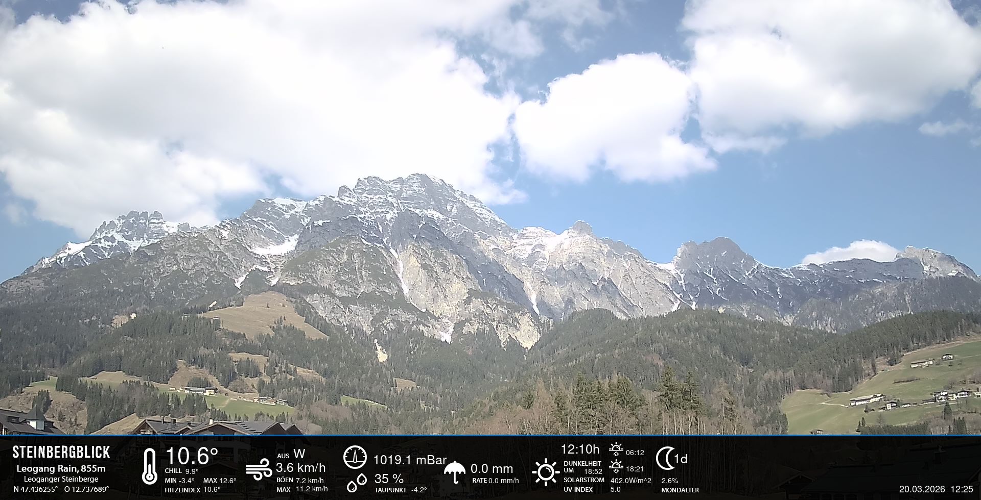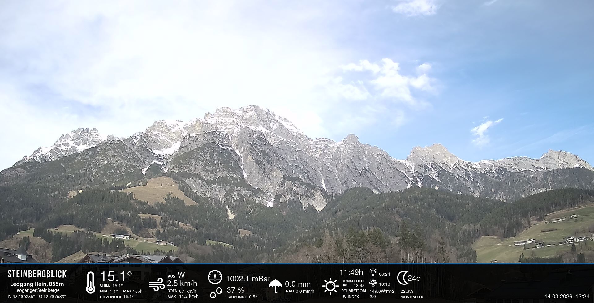 - Blick zu den Leoganger Steinbergen mit aktuellen Wetterwerten.