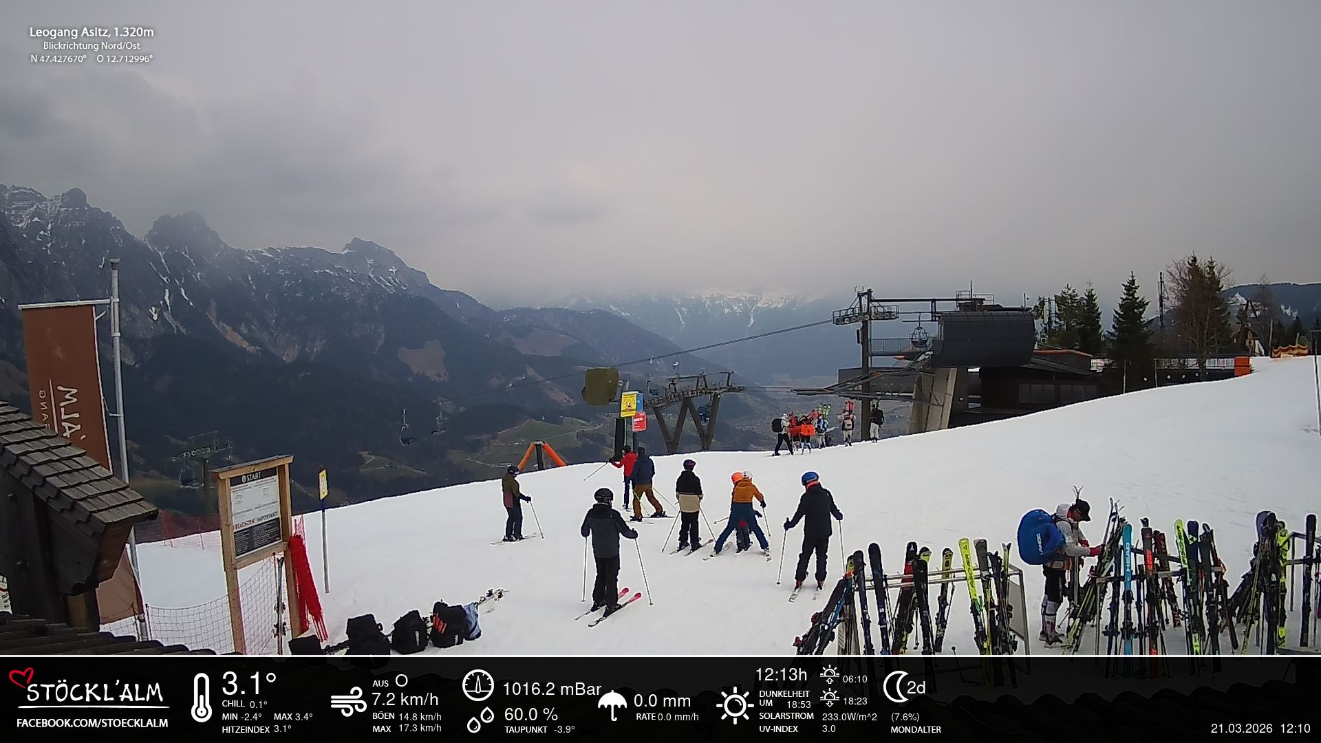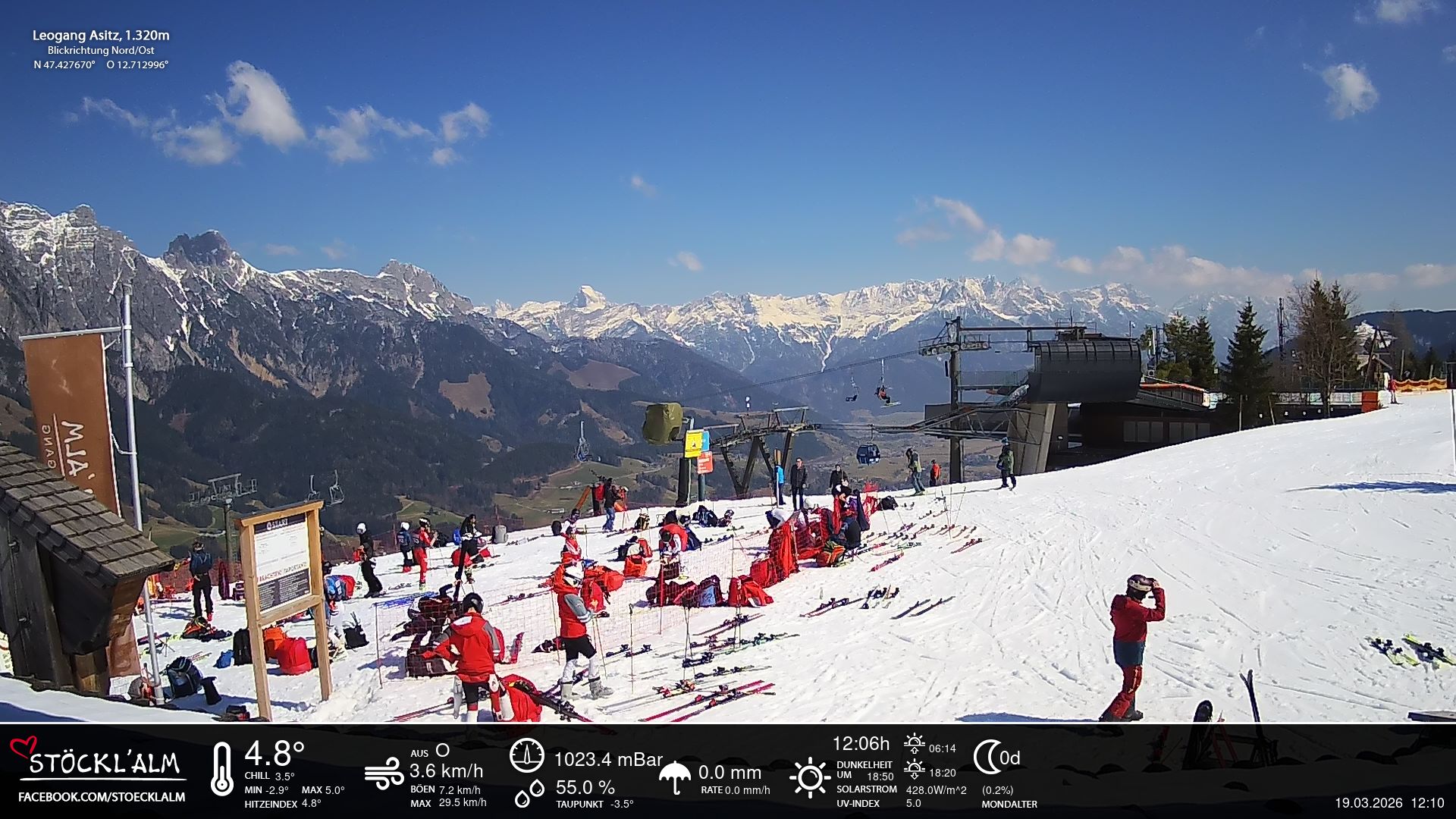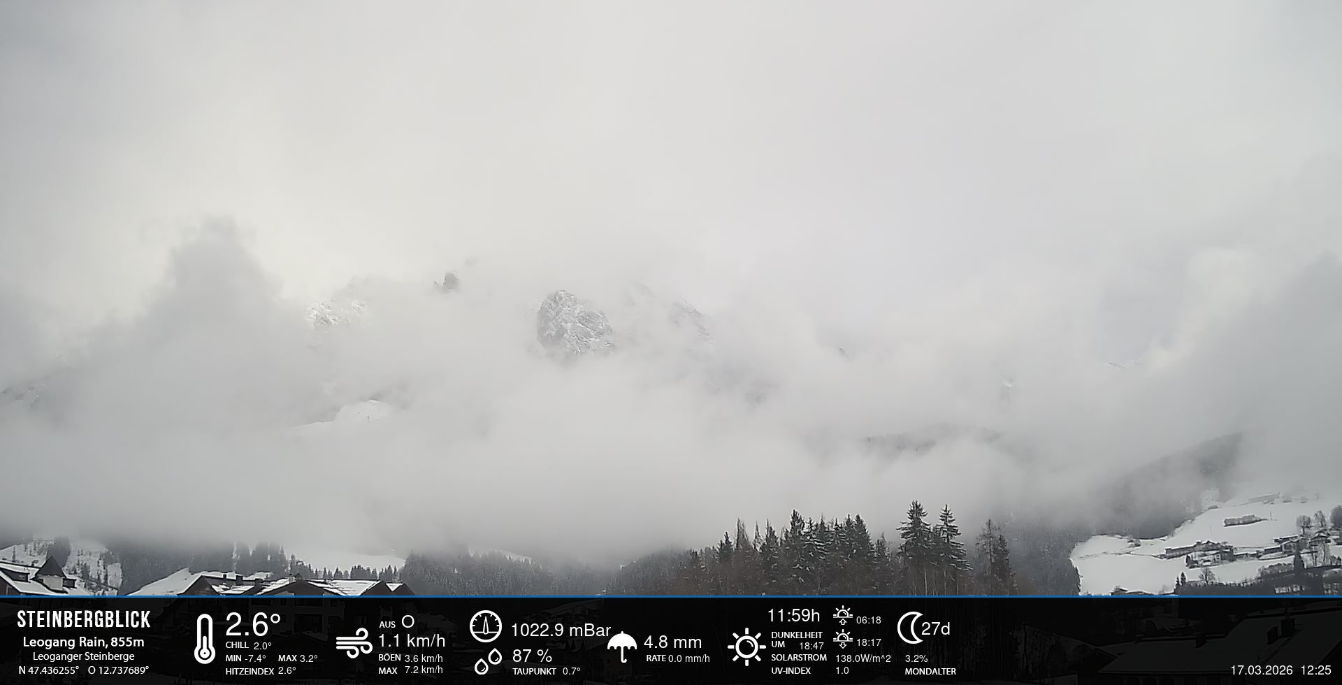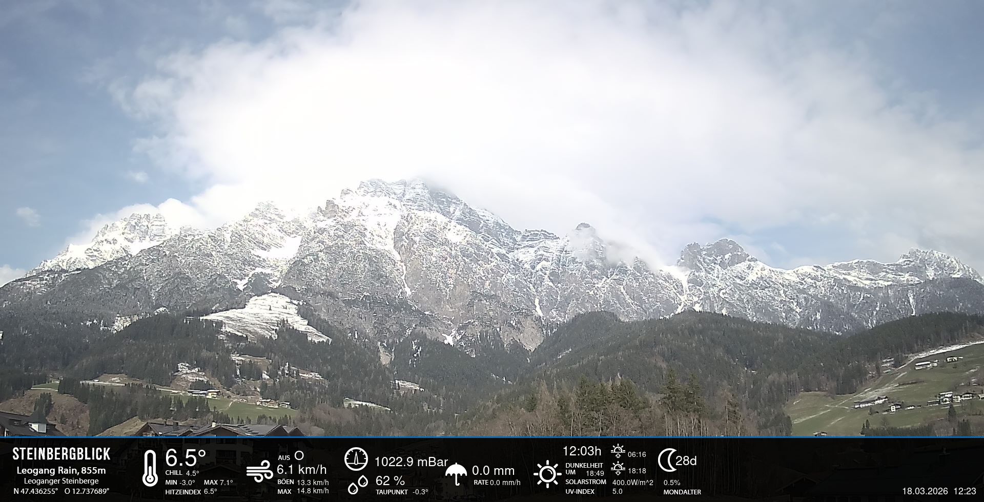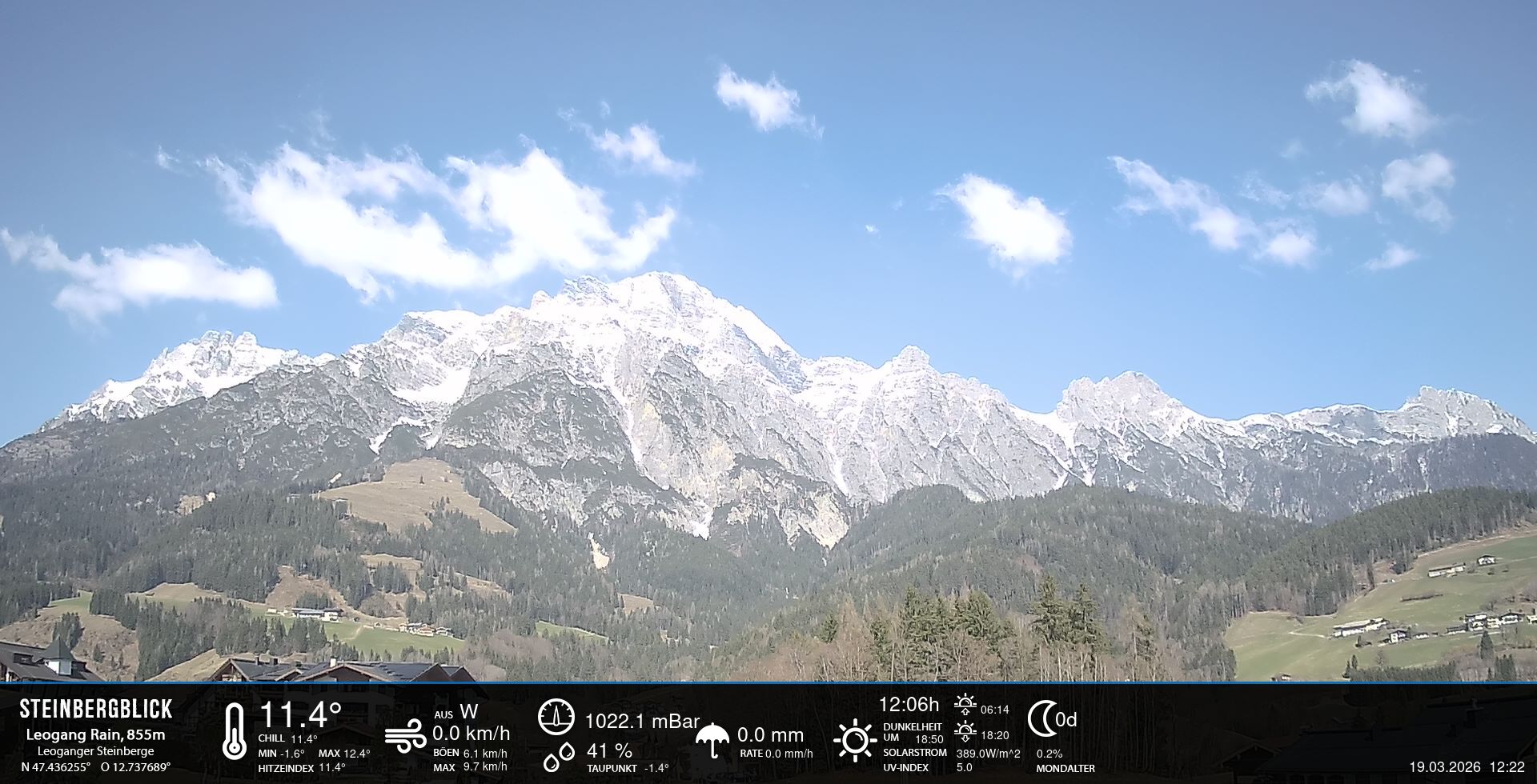 - Blick zu den Leoganger Steinbergen mit aktuellen Wetterwerten.