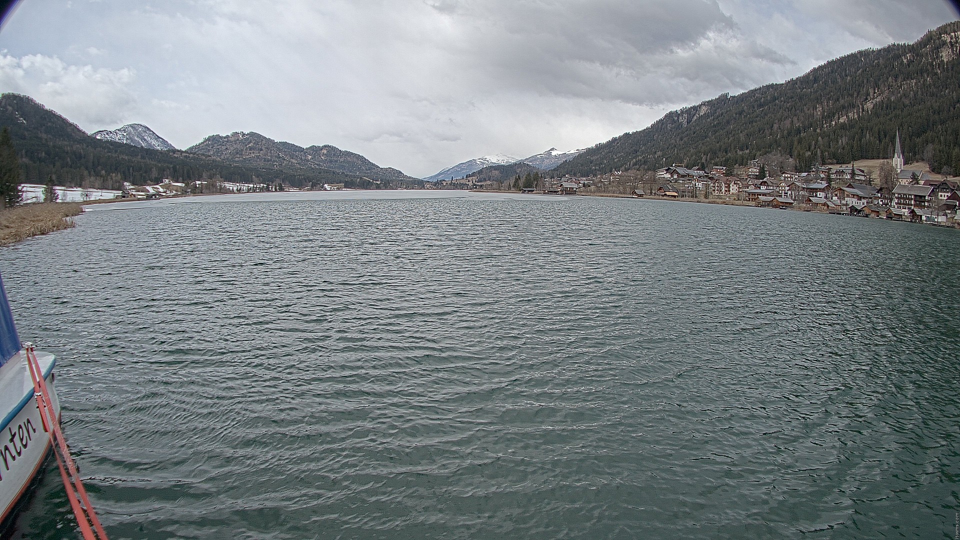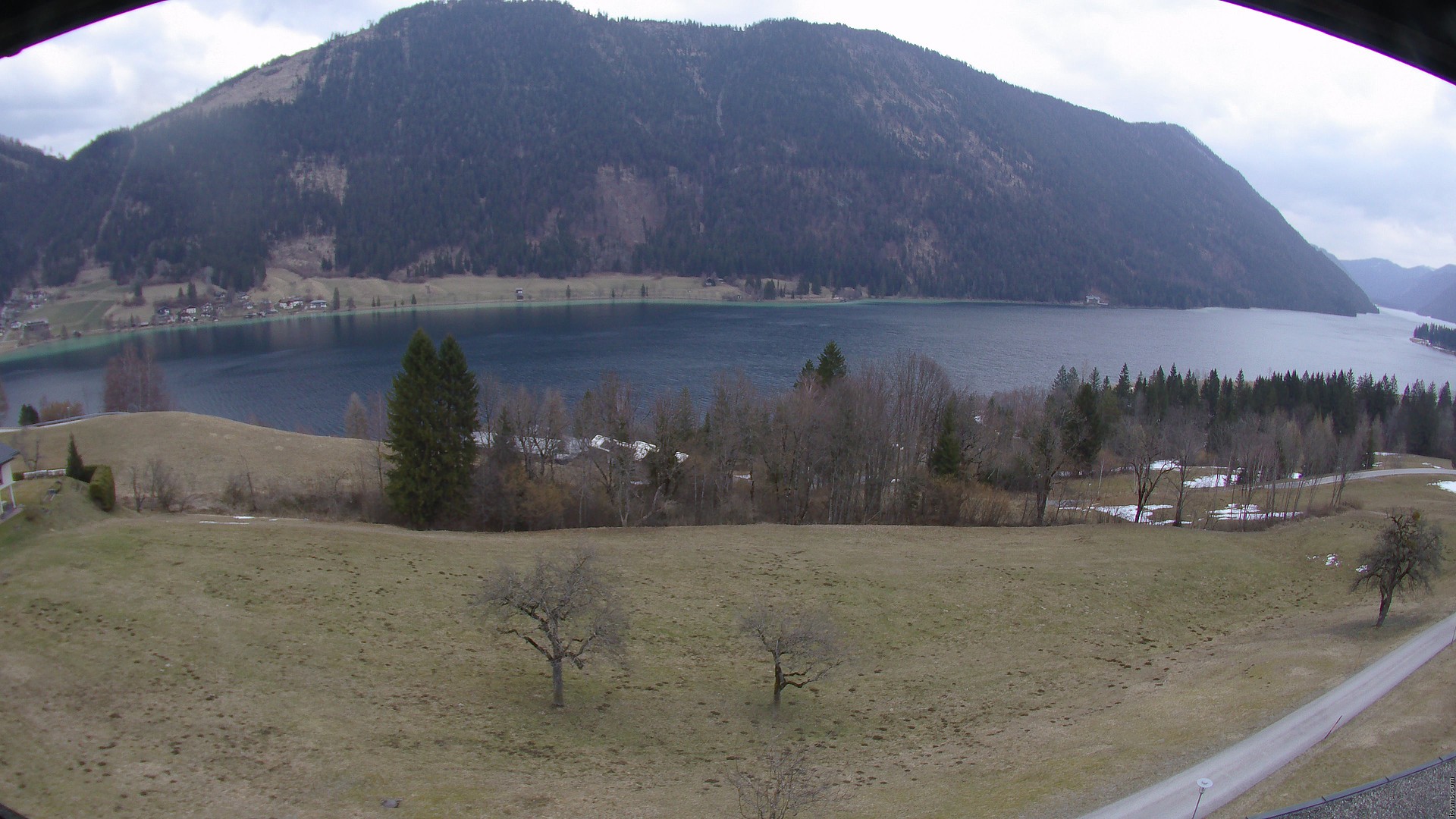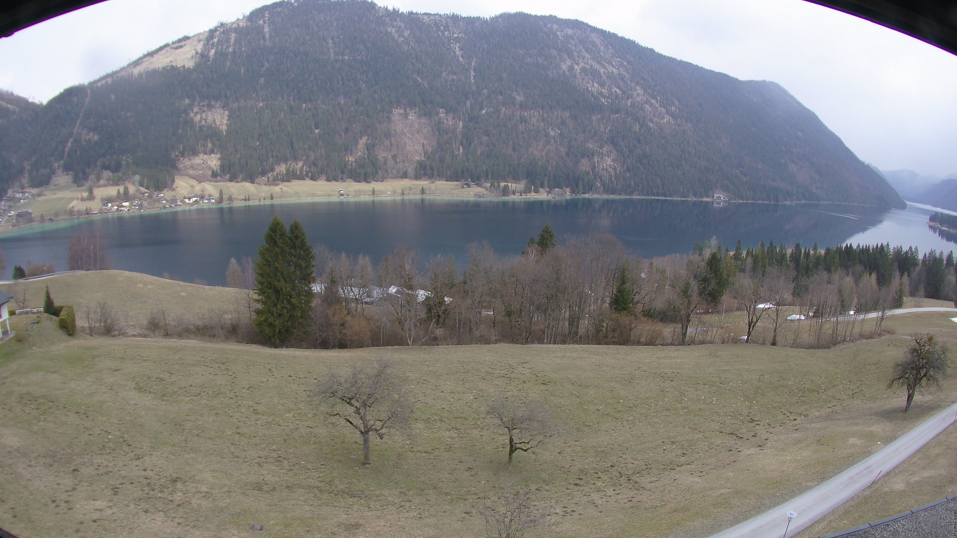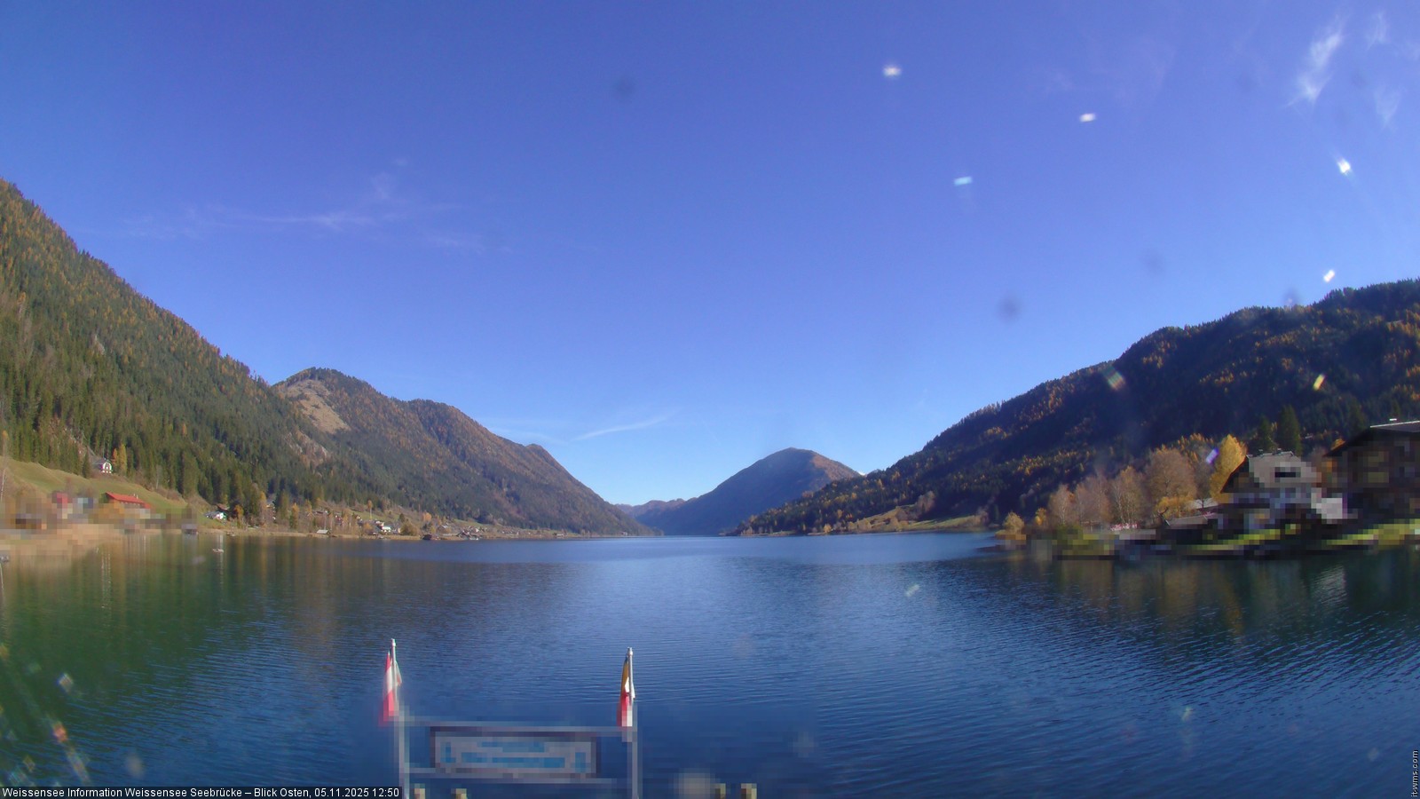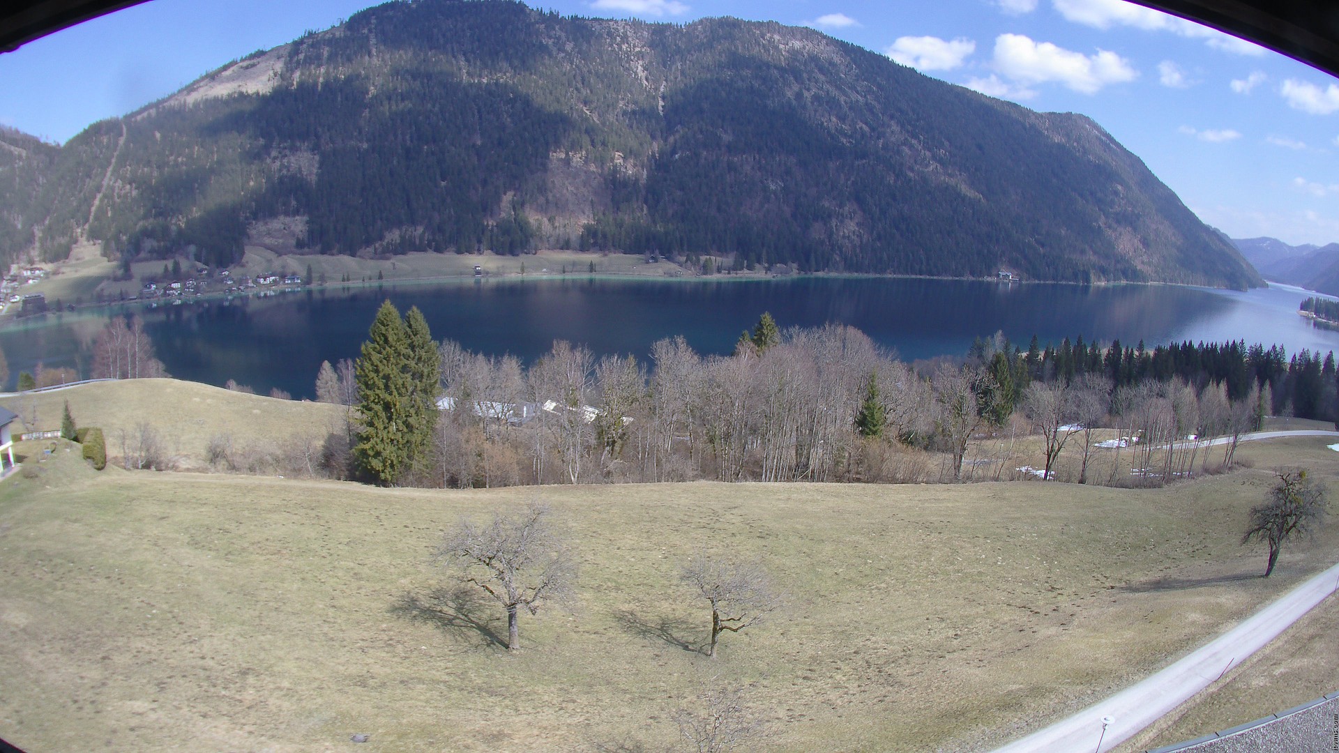 Weißensee, Österreich - 6.8 km von Gerlamoos: Panoramakamera Weissensee - Die Panorama-Livecam befindet sich auf ca. 1300 m Seehöhe am südlichen Seeteil und bietet den besten Blick von der Naggler Alm auf den Brückenbereich rund um das Zentrum Techendorf bis Neusach, sowie auf den Westteil des Weissensees. Die Bilder werden rund um die Uhr live und in HD Qualität übertragen.
