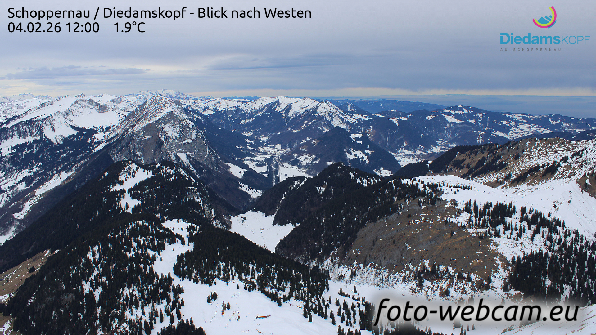 Damuels, Österreich - 9.2 km von Grasalp: Panocam Damüls - 'Die Livecam befindet sich auf dem Dach der Uga-Express-Bergstation, direkt neben dem Gasthaus Elsenalpstube – Ihrem Ausgangspunkt ins Schneereich bzw. Bergreich Damüls-Mellau. Die Livecam zeigt den Blick Richtung Damülser Mittagspitze und rundum das gesamte Bergpanorama von Damüls.