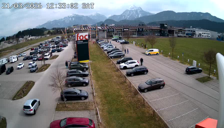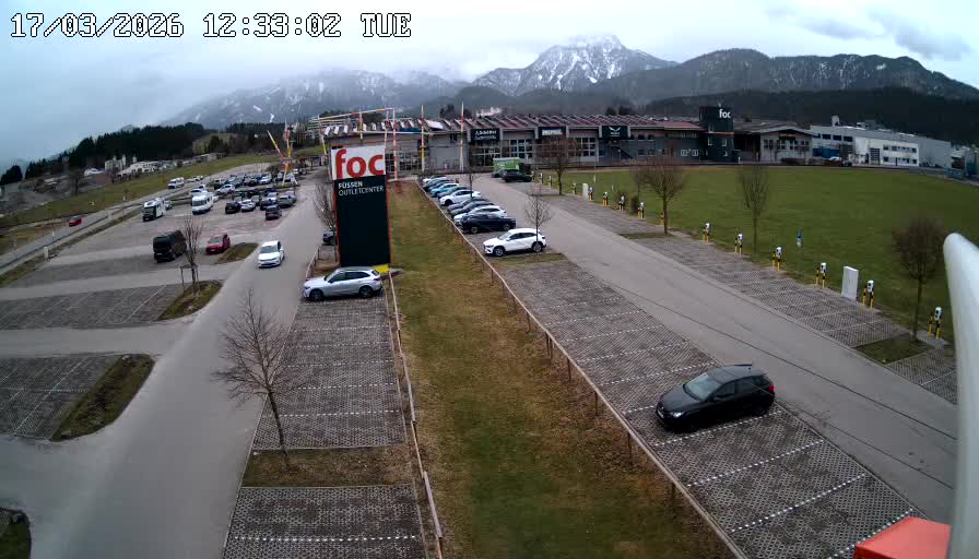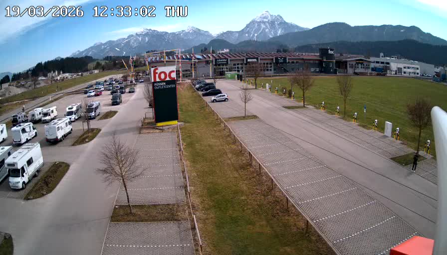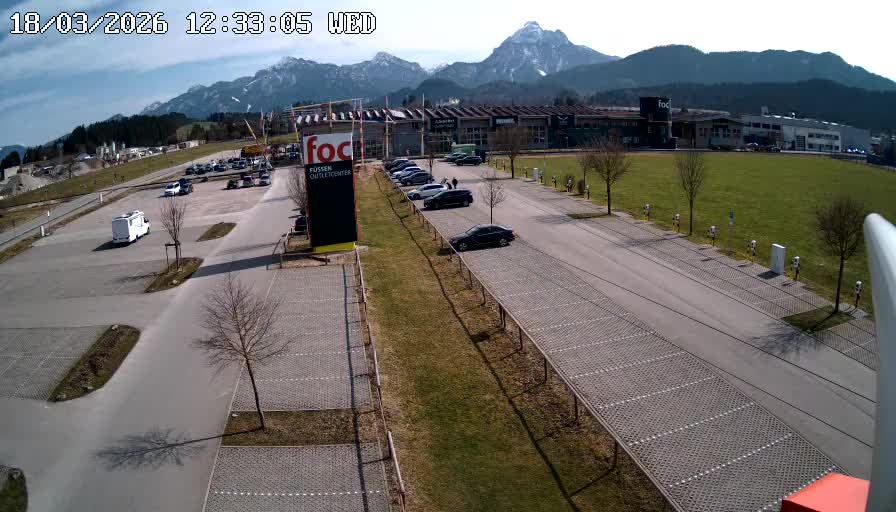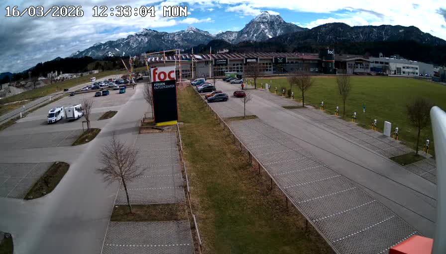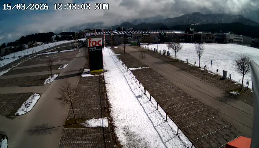 Füssen, Deutschland - 4.5 km von Greng: Füssen - Bad Faulenbach - Die Füssen Webcam zeigt einen Ausschnitt vom Lech, 2,8 Km vor der Einmündung in den Forggensee. Die Blickrichtung der Webcam in Füssen - Bad Faulenbach ist auf das Hohe Schloss zu Füssen und auf die Klosterkirche St. Mang gerichtet. Im Herbst und im Winter, wenn das Laub von den Bäumen gefallen ist, ist ein Teil des ehemaligen Areals der Hanfwerke von Füssen sichtbar.