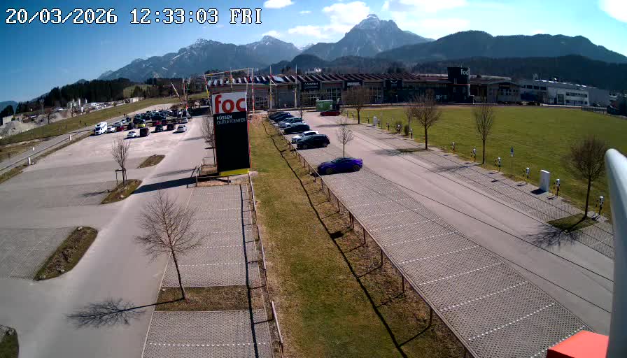 Füssen, Deutschland - 4.5 km von Greng: Panocam Kinker - Die Kamera zeigt das Allgäu von seiner schönsten Seite. Der Blick streicht vom Berghof Kinker über das liebliche Voralpenland bis zum Forggensee. Im Hintergrund erheben sich majestätisch die Allgäuer- und Lechtaler Alpen. Bekannte Sehenswürdigkeiten sind das Schloss Neuschwanstein, das Schloss Hohenschwangau und das Hohe Schloss von Füssen.