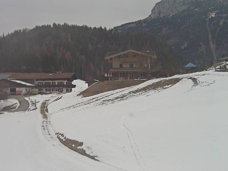 Lofer, Österreich - 0.7 km von Gumping: Panoramakamera Skigebiet Lofer - Die Livecam steht in der Almenwelt Lofer auf dem Dach der Almbahn II– Bergstation (1350 m) und zeigt das herrliche Wandereldorado im Sommer und das Top – Familienskigebiet im Winter. Im Bild die Talstationen der neuen Kindericheren 8 er – Almen 8 er Schwarzeck und der 6er Sesselbahn Family Express.