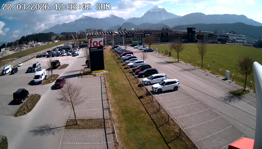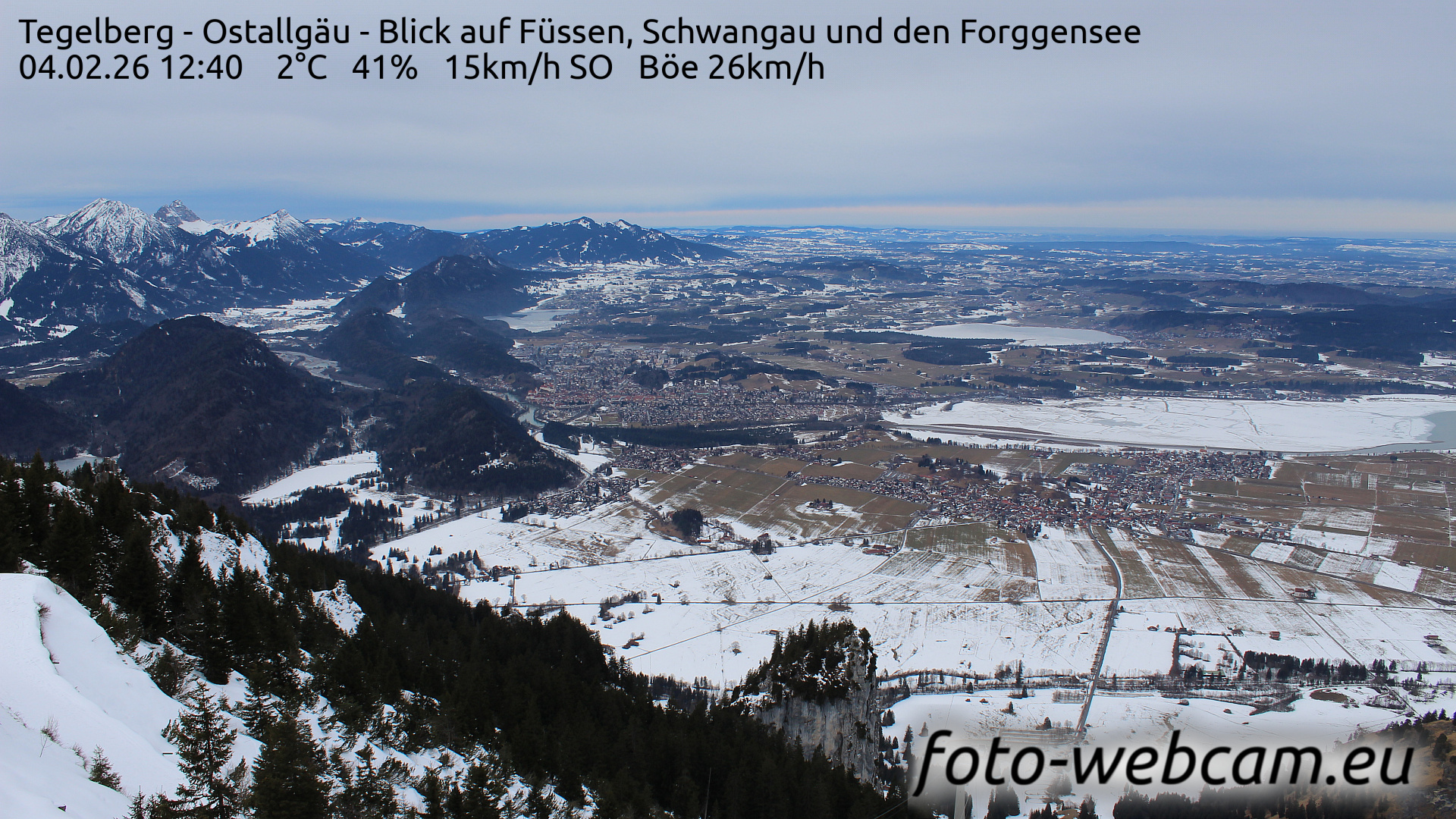 Füssen, Deutschland - 4.2 km von Oberpinswang: Panocam Kinker - Die Kamera zeigt das Allgäu von seiner schönsten Seite. Der Blick streicht vom Berghof Kinker über das liebliche Voralpenland bis zum Forggensee. Im Hintergrund erheben sich majestätisch die Allgäuer- und Lechtaler Alpen. Bekannte Sehenswürdigkeiten sind das Schloss Neuschwanstein, das Schloss Hohenschwangau und das Hohe Schloss von Füssen.