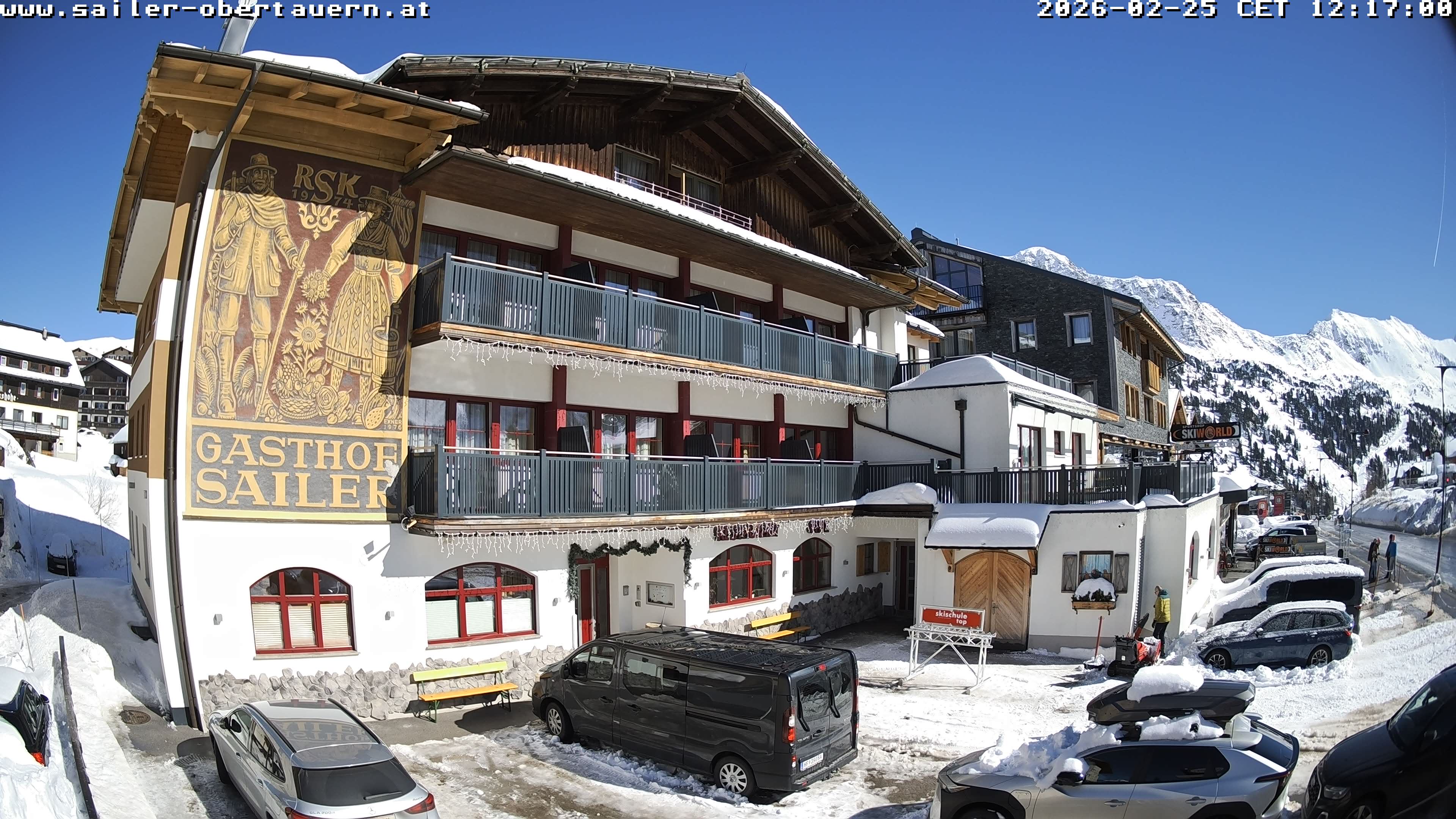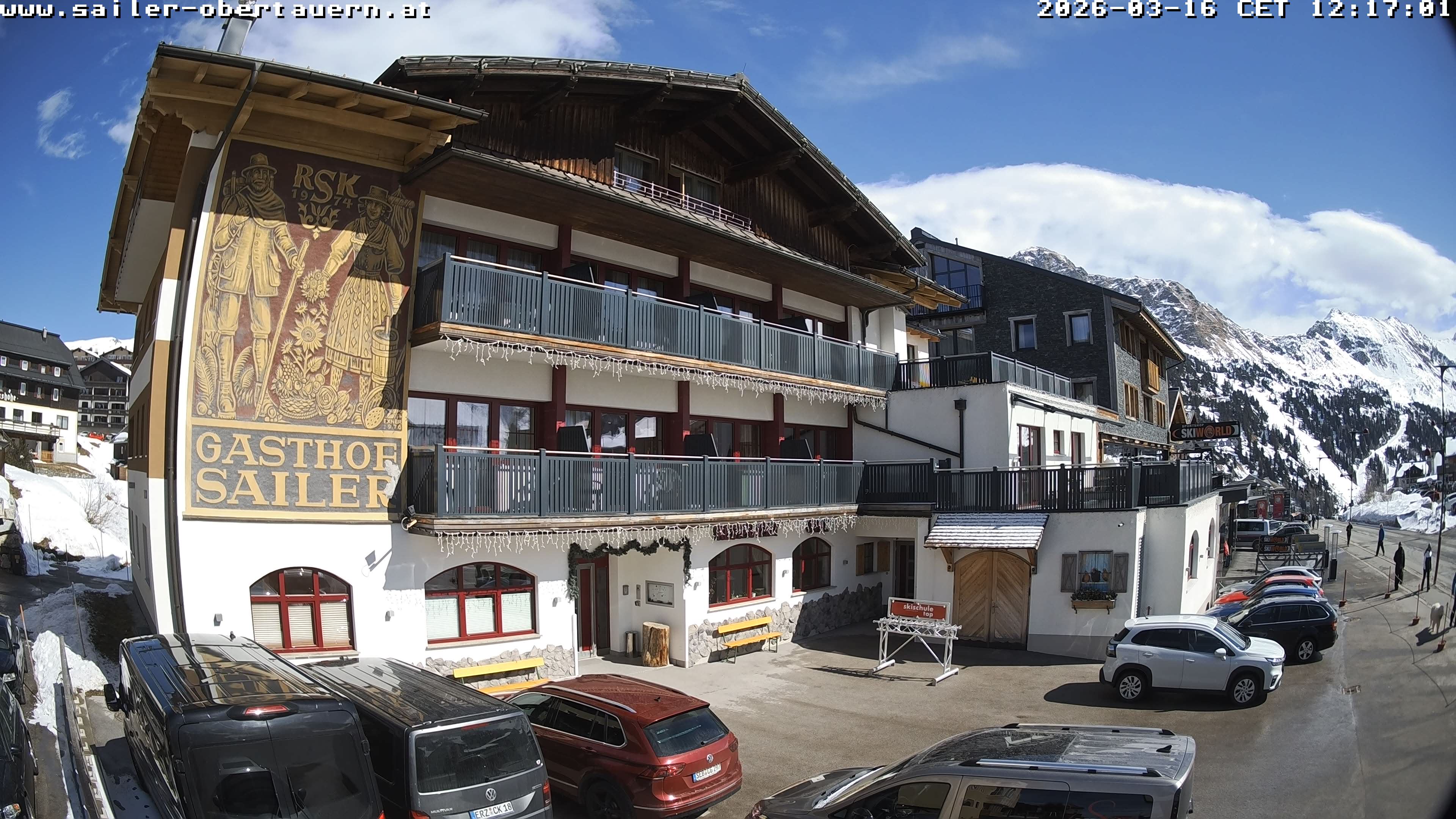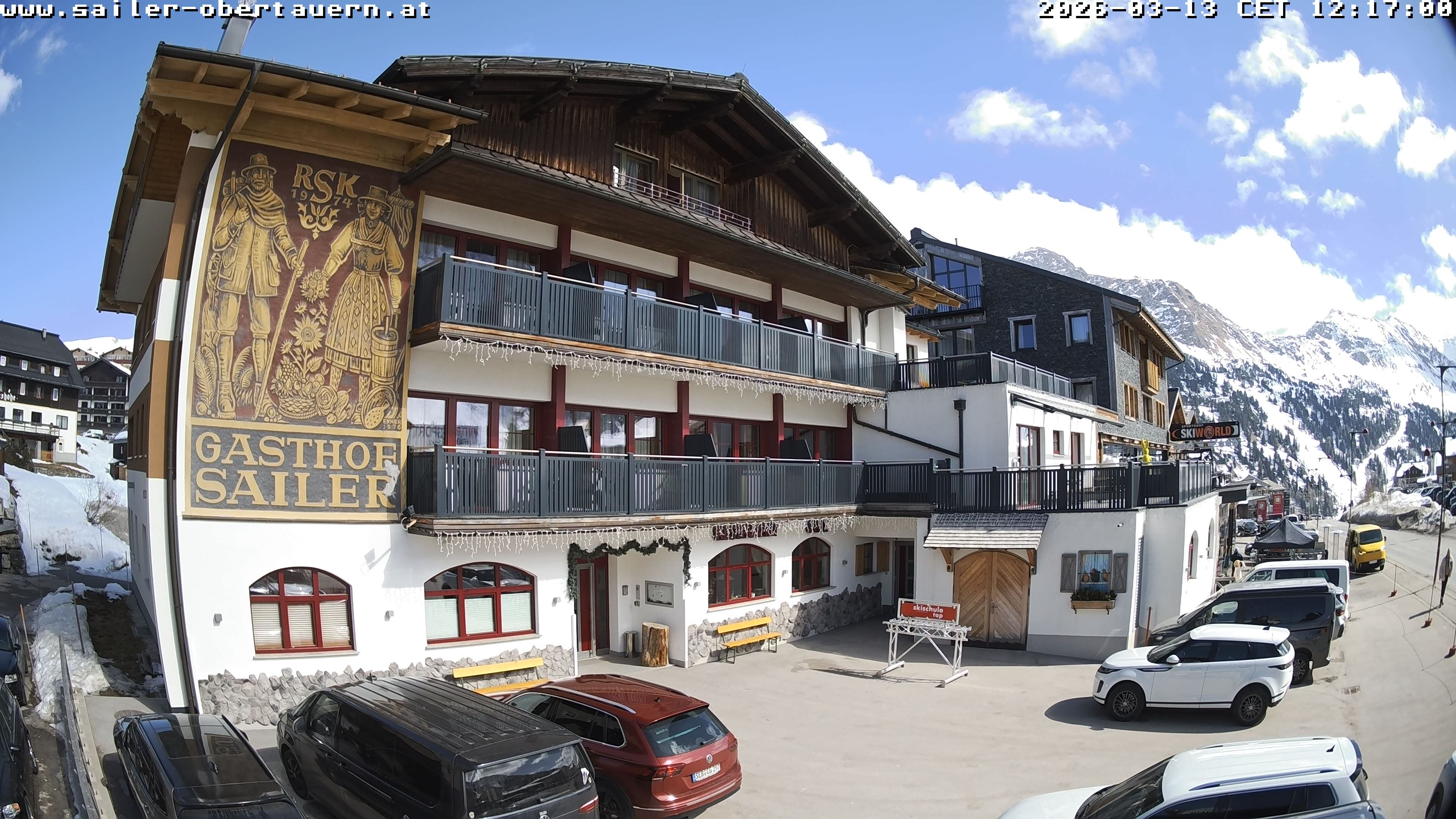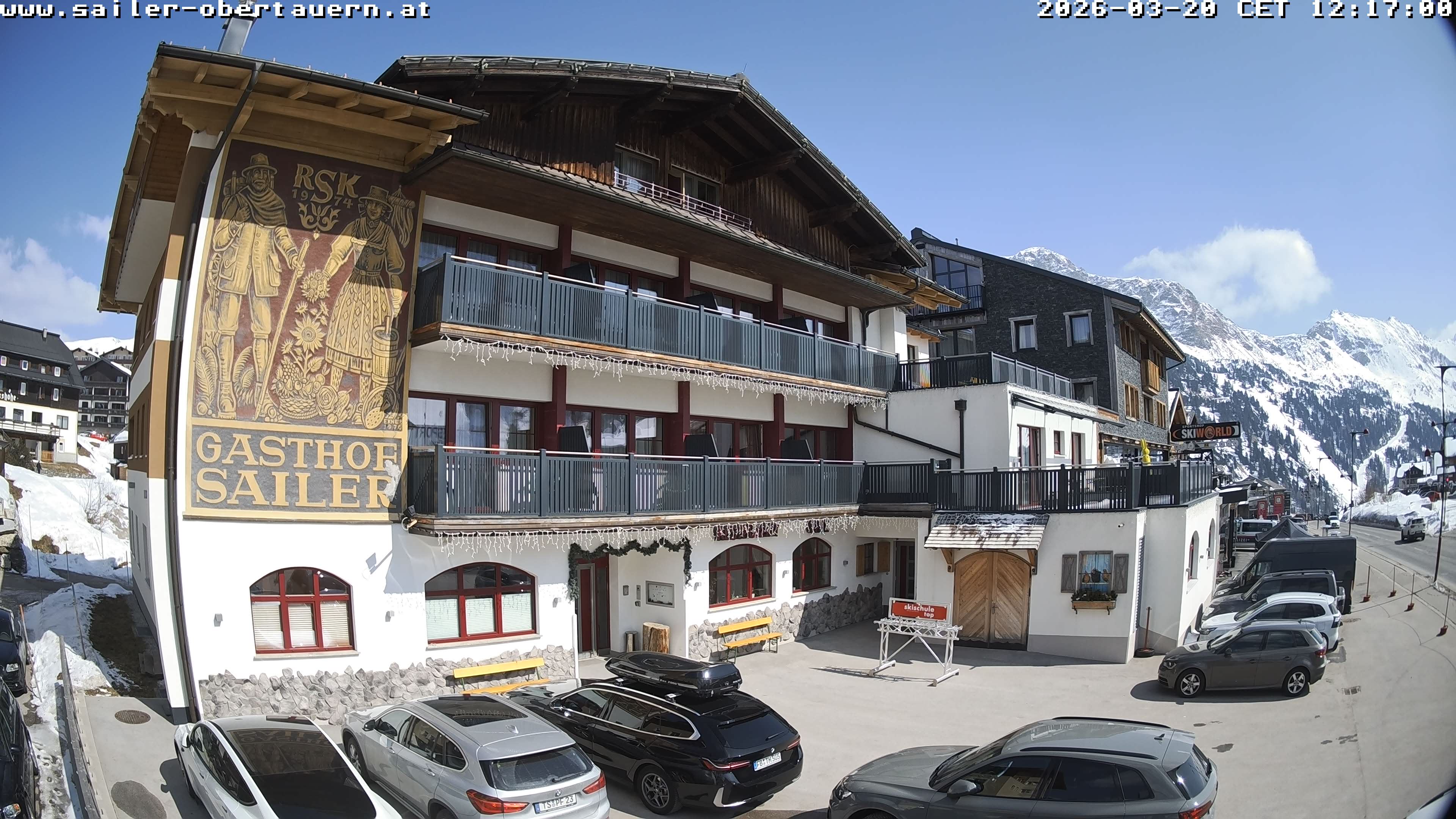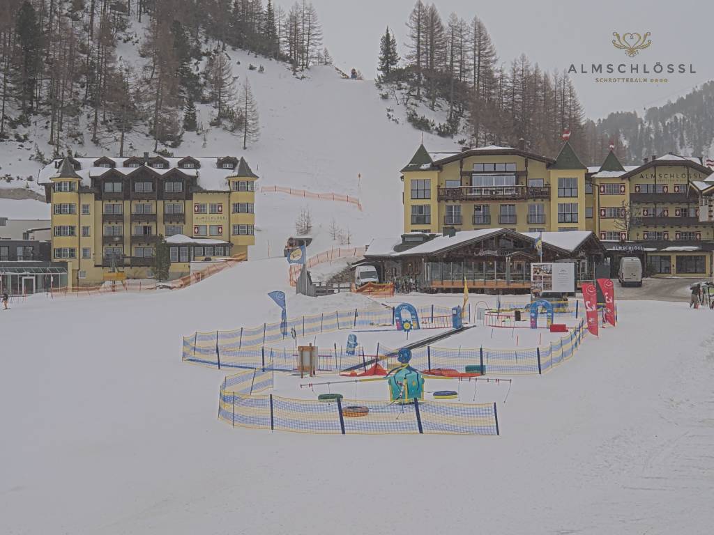 Obertauern, Österreich - 1.8 km von Obertauern: Webcam Hotel Cinderella - Blick vom Hotel Cinderella in Obertauern auf: den Gruberstadl, den Latschnschirm, und im Hintergrund das Hotel Leitner in Obertauern.