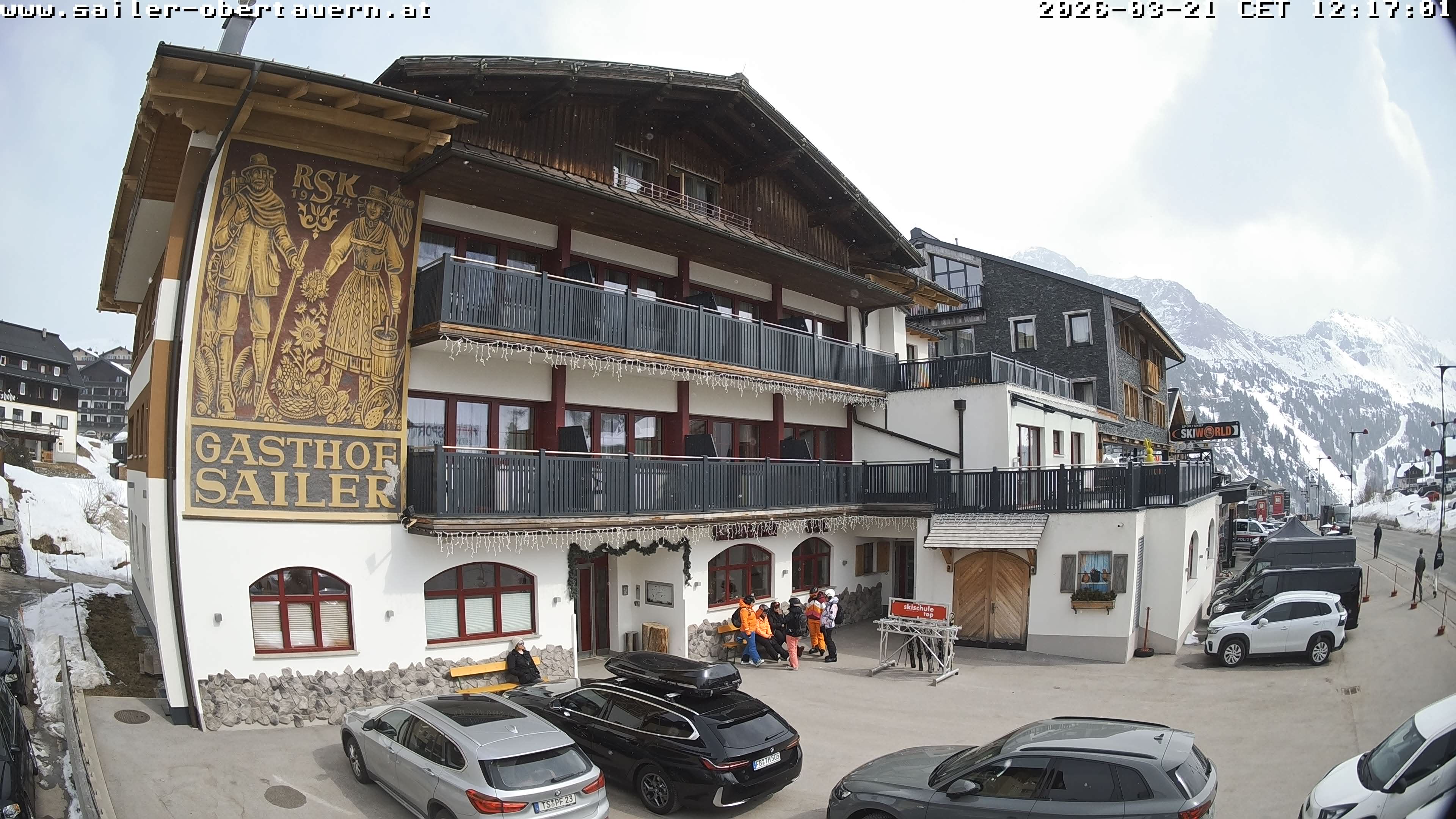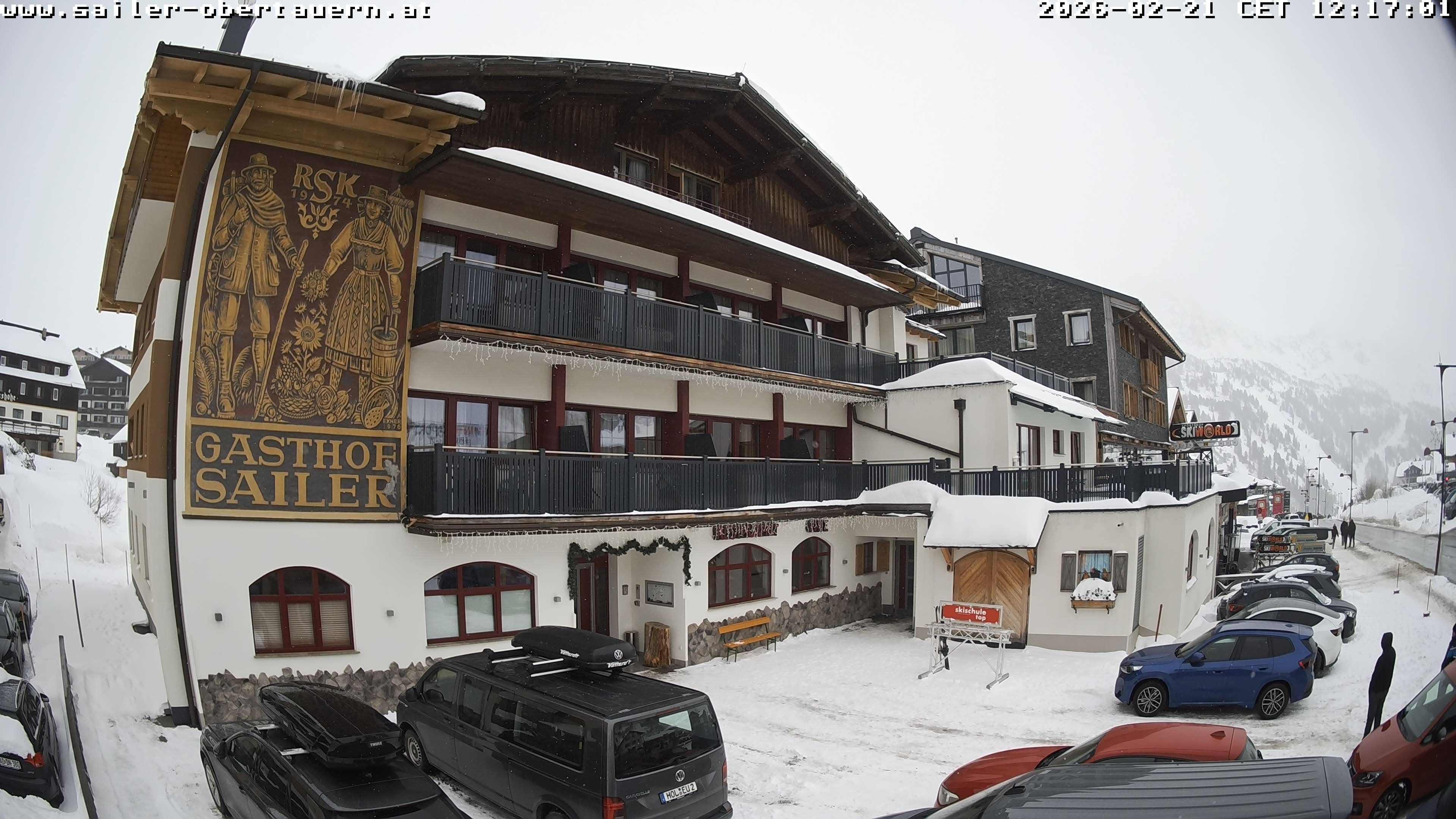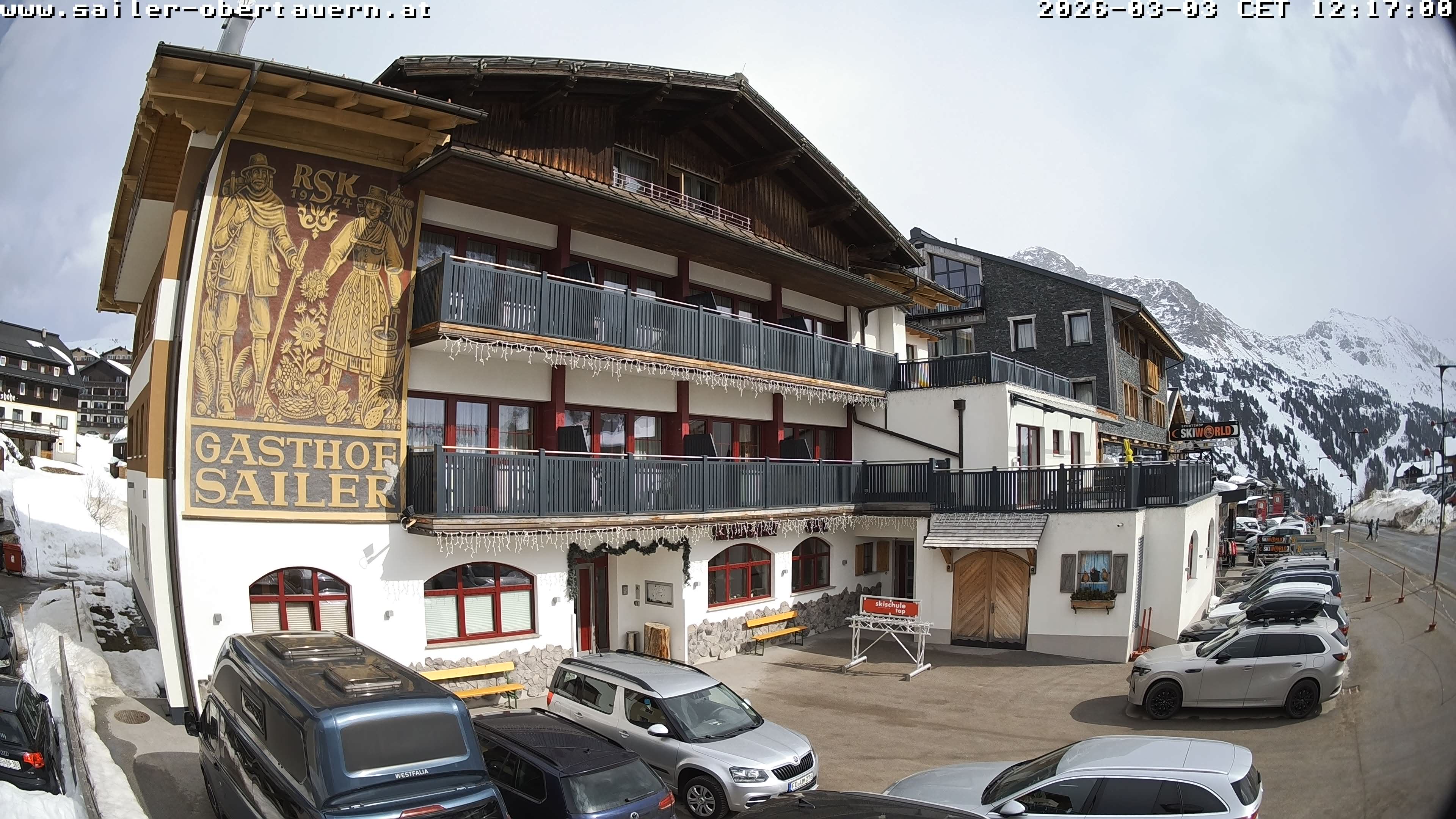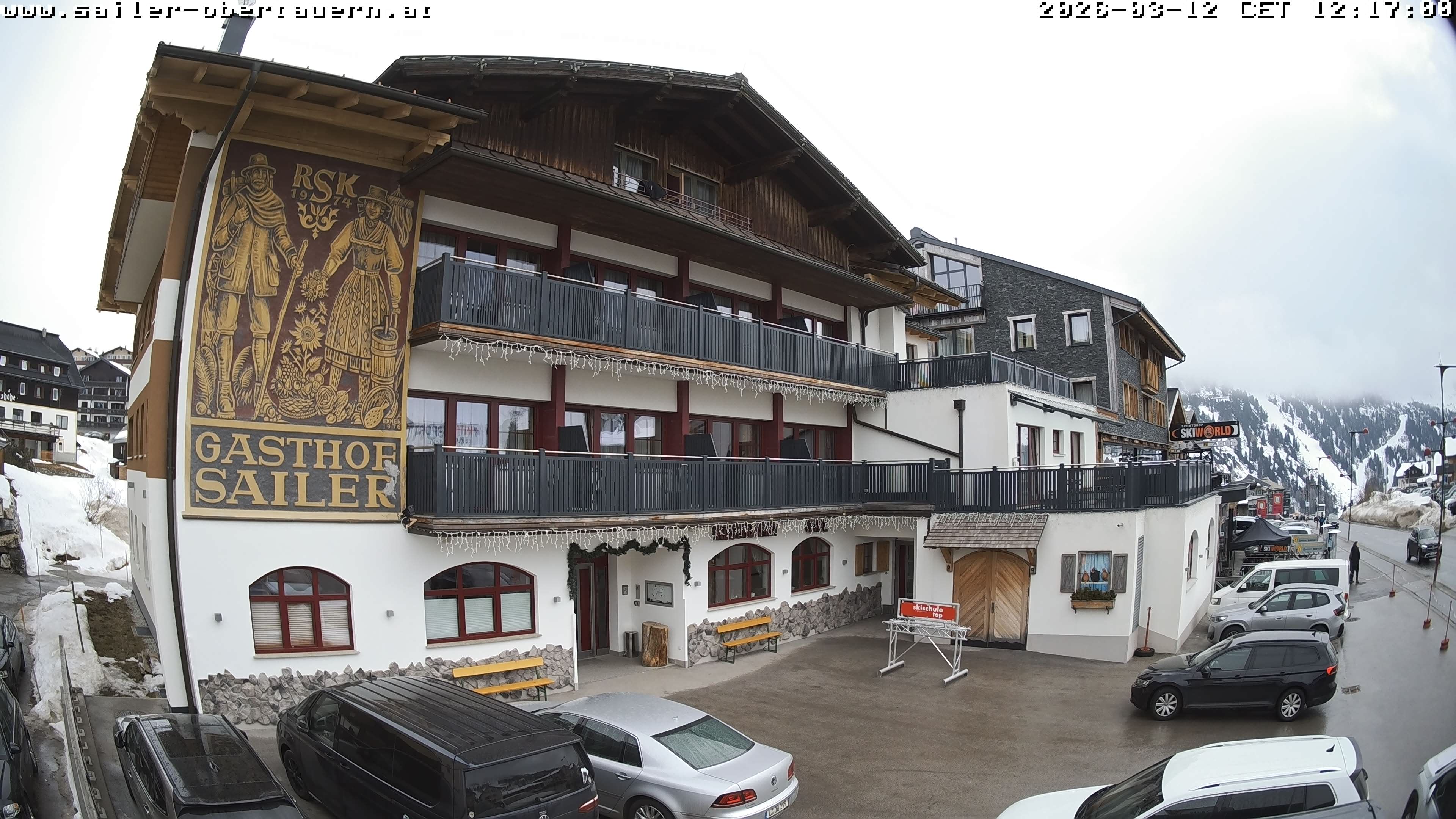 Obertauern, Österreich - 1.8 km von Obertauern: Webcam Hotel Cinderella - Blick vom Hotel Cinderella in Obertauern auf: den Gruberstadl, den Latschnschirm, und im Hintergrund das Hotel Leitner in Obertauern.