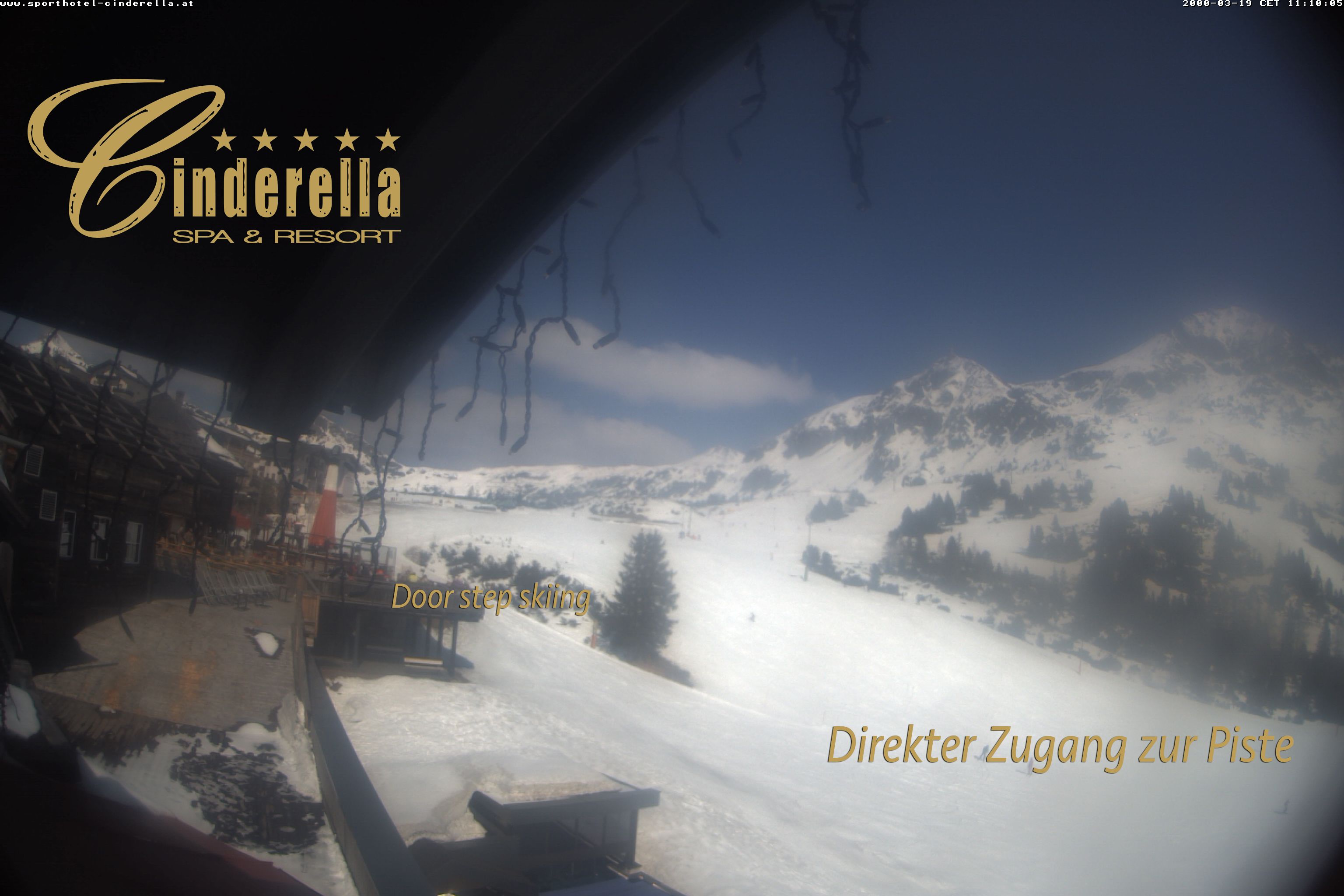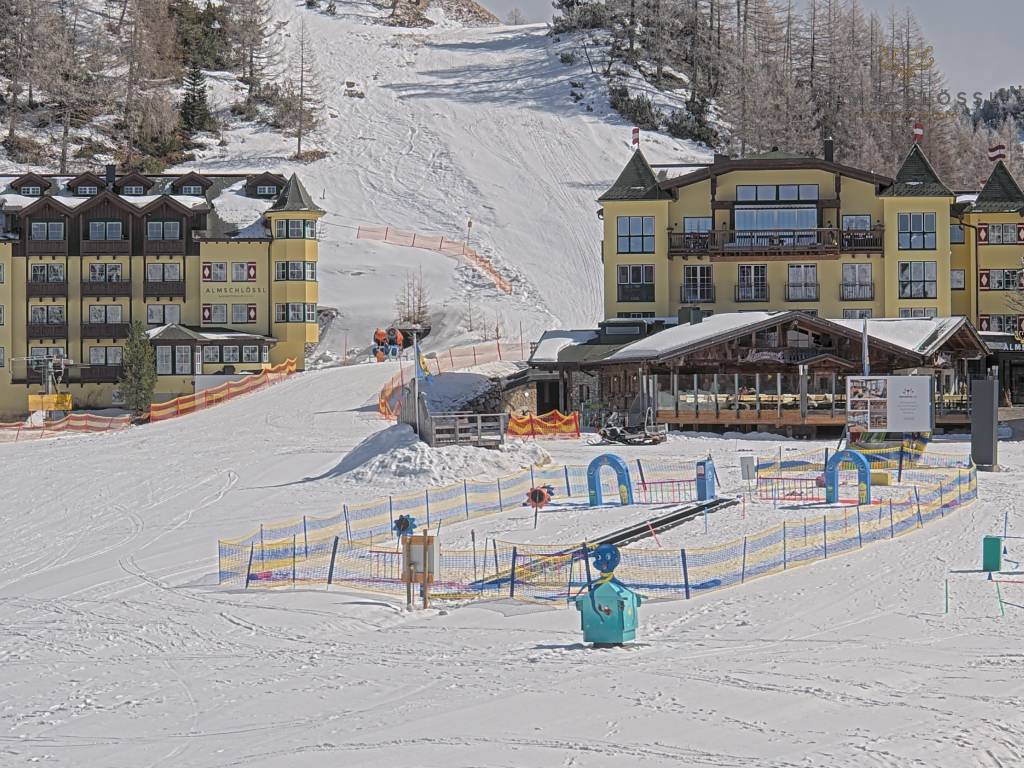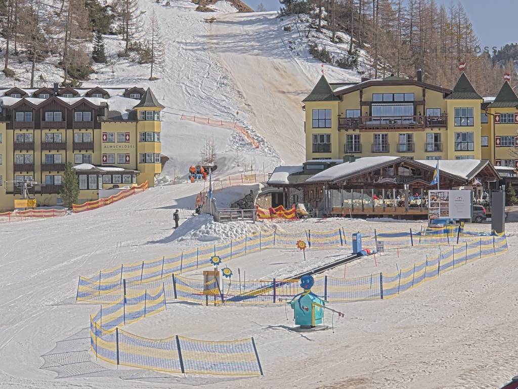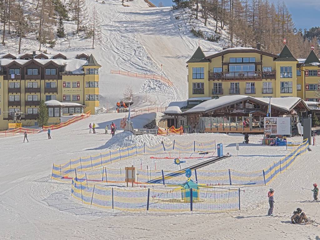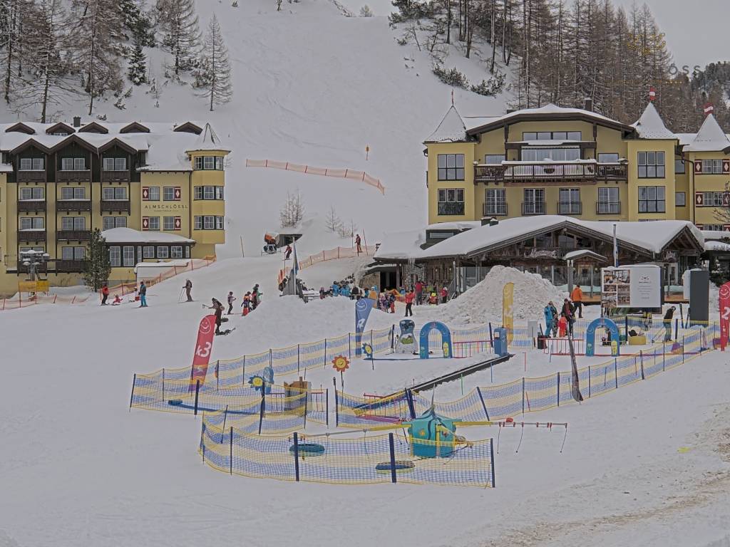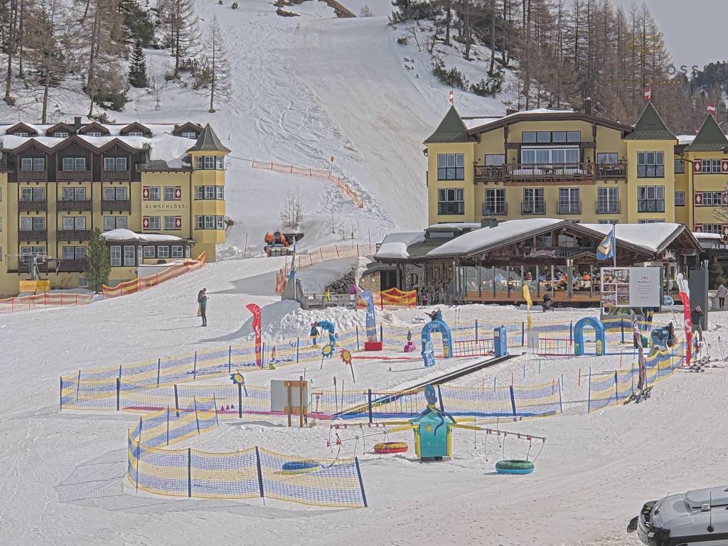 Obertauern, Österreich - 8 km von Tweng: Webcam Hotel Cinderella - Blick vom Hotel Cinderella in Obertauern auf: den Gruberstadl, den Latschnschirm, und im Hintergrund das Hotel Leitner in Obertauern.
