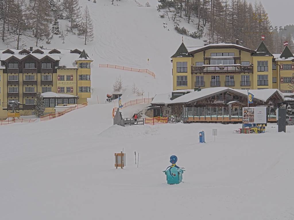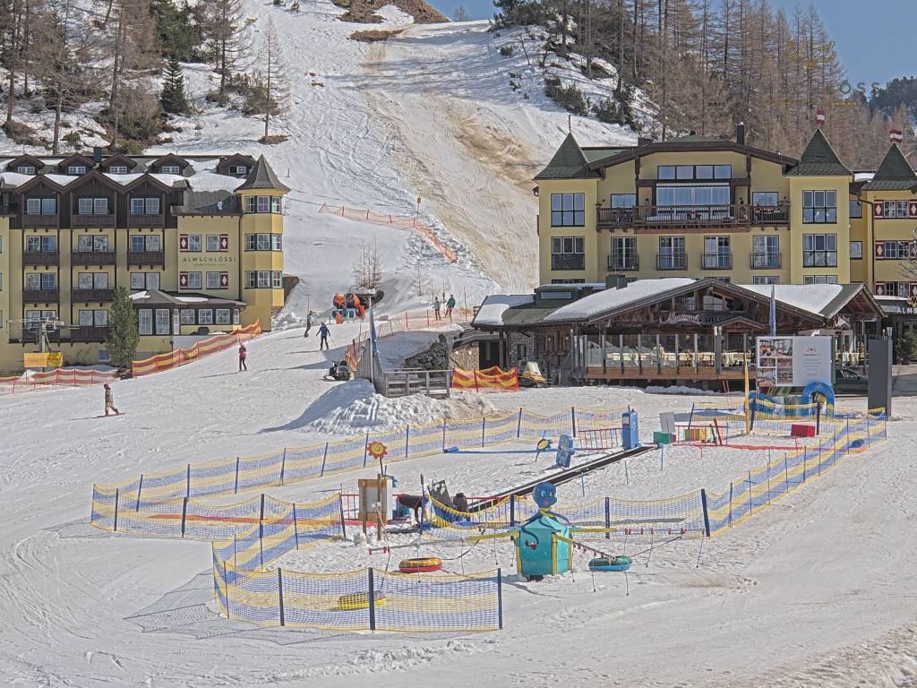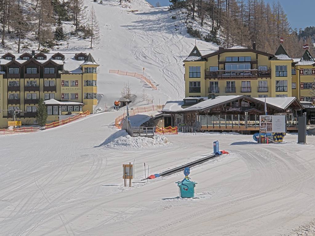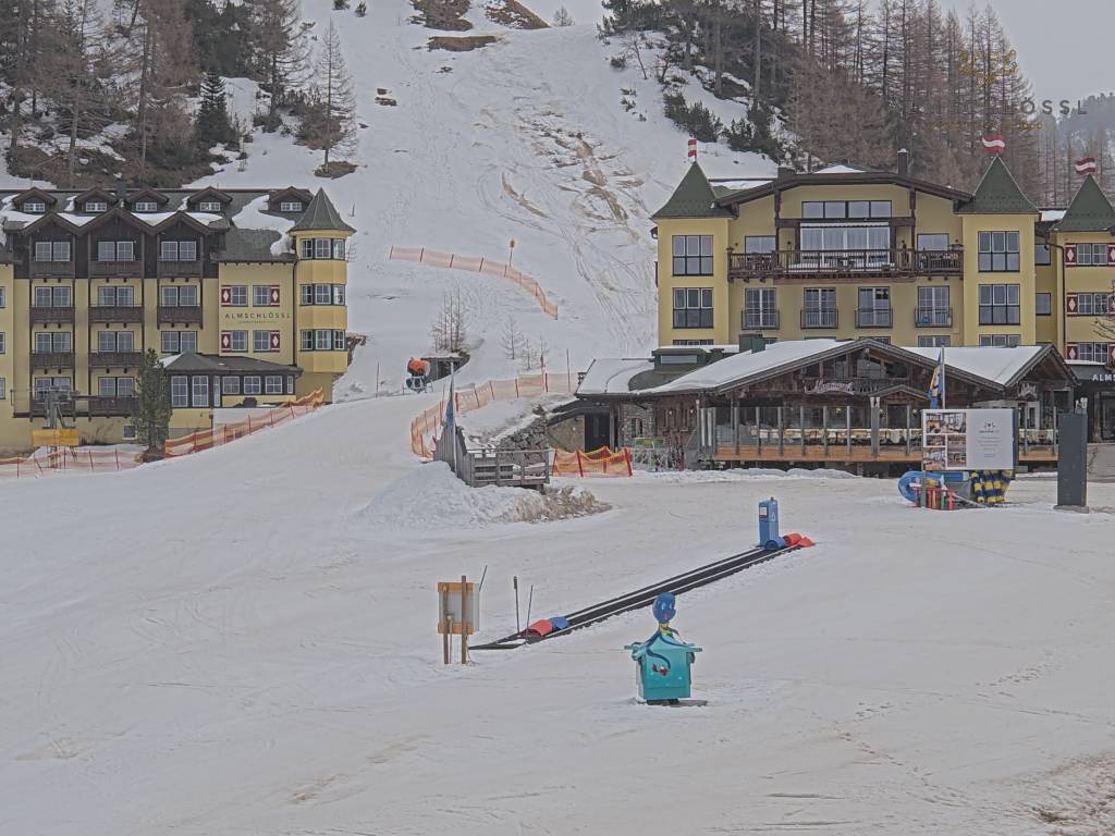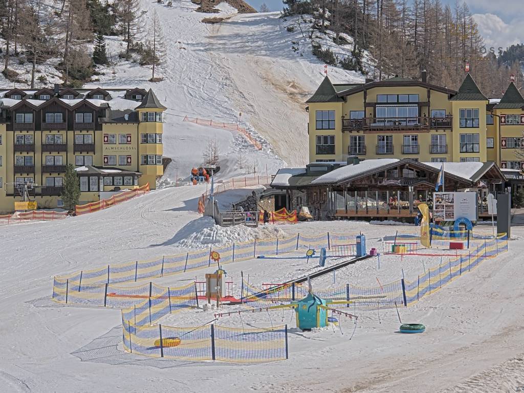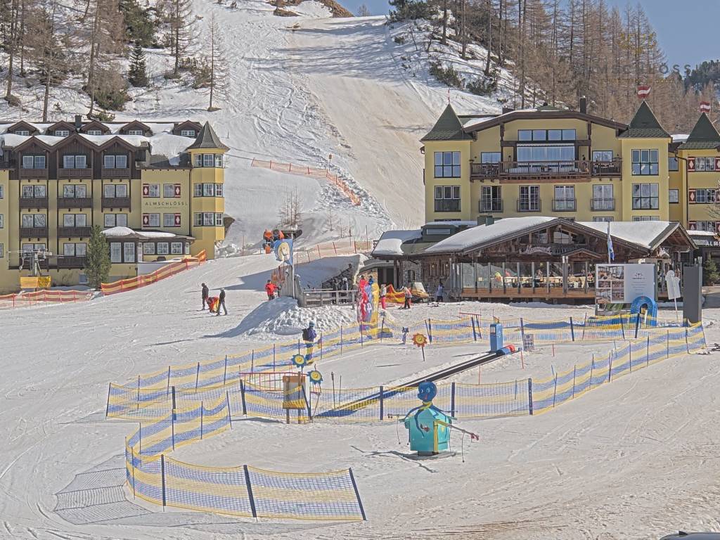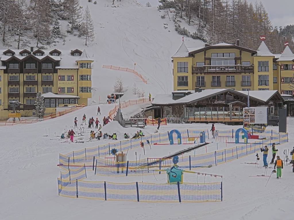 Obertauern, Österreich - 8 km von Tweng: Webcam Hotel Cinderella - Blick vom Hotel Cinderella in Obertauern auf: den Gruberstadl, den Latschnschirm, und im Hintergrund das Hotel Leitner in Obertauern.