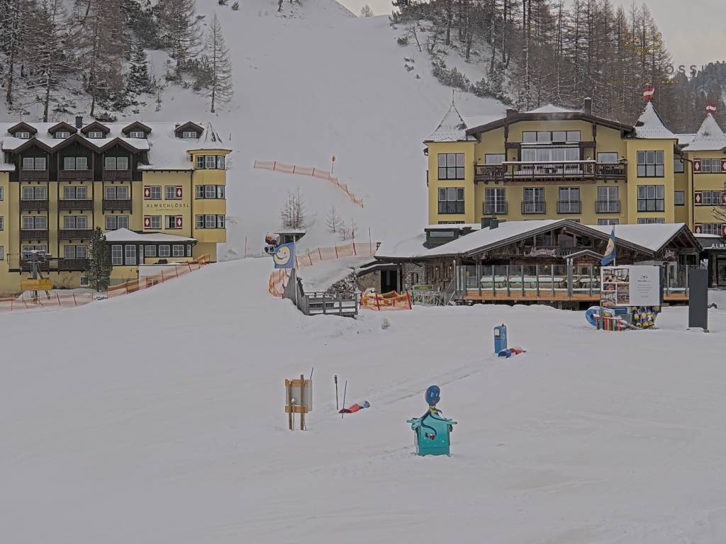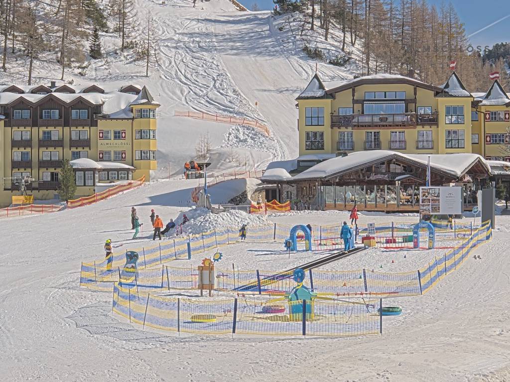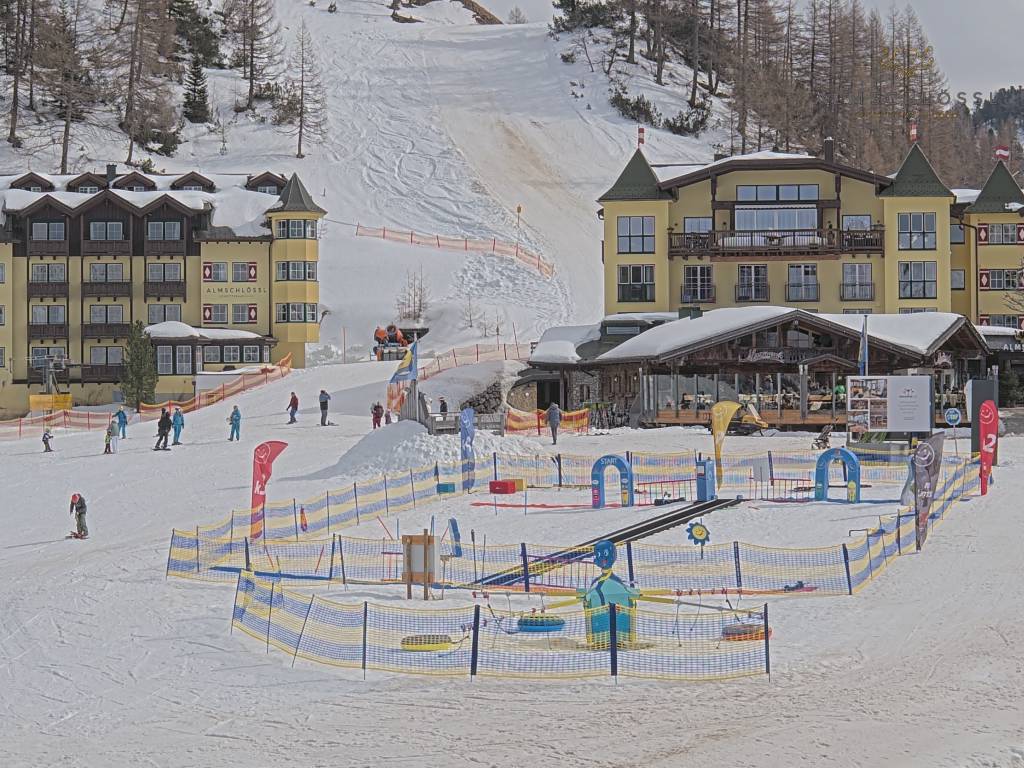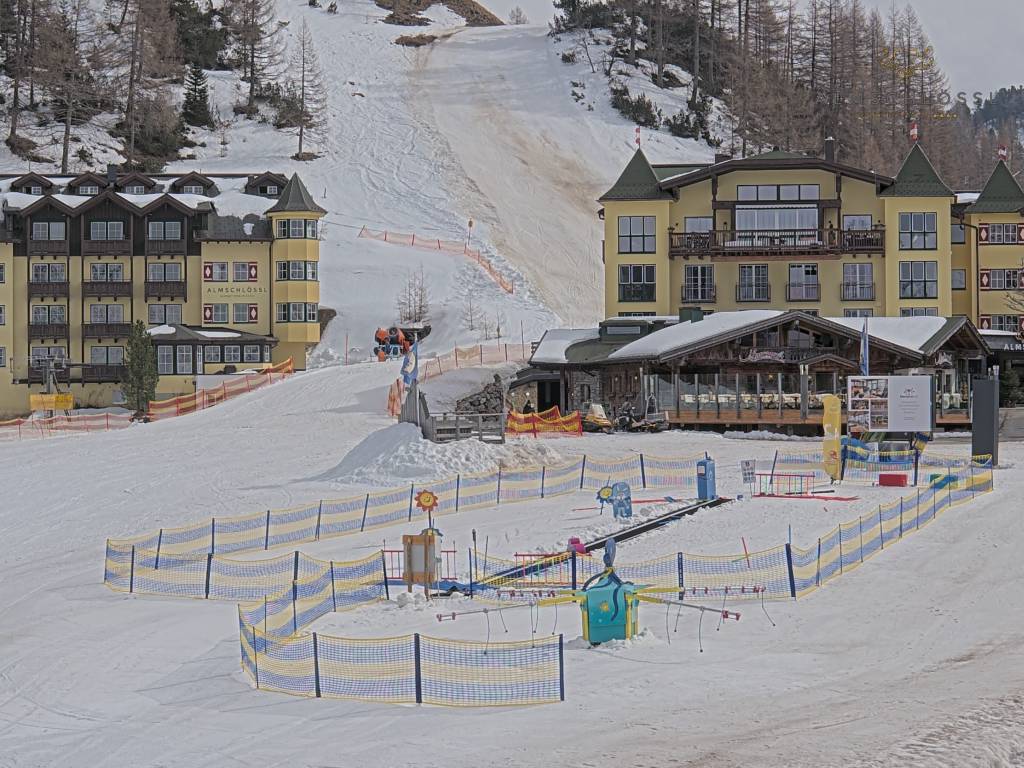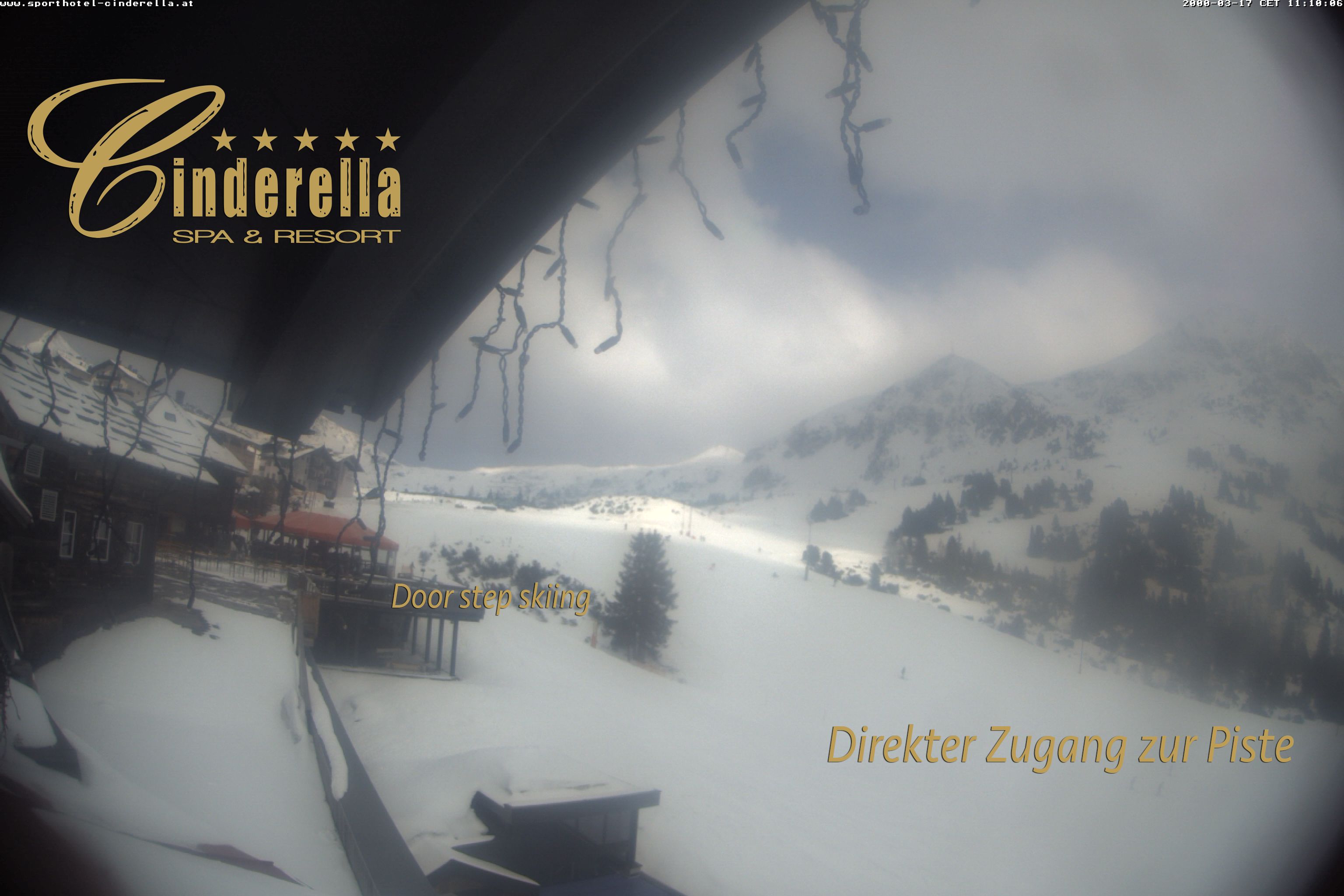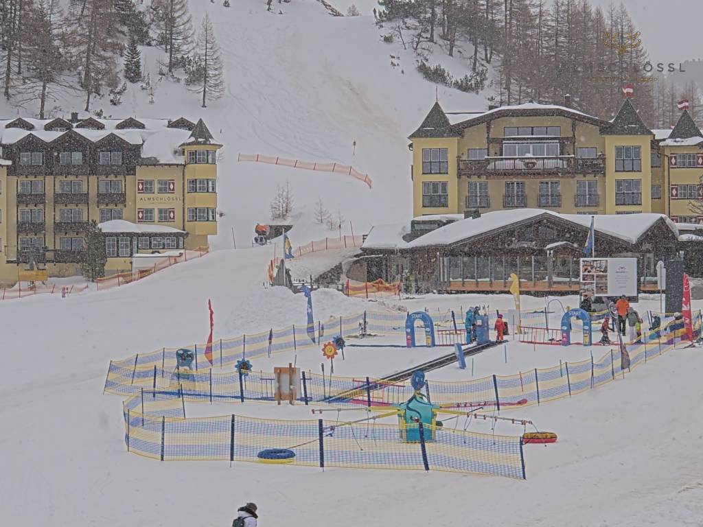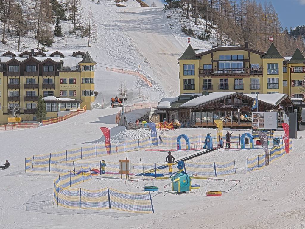 Obertauern, Österreich - 8 km von Tweng: Webcam Hotel Cinderella - Blick vom Hotel Cinderella in Obertauern auf: den Gruberstadl, den Latschnschirm, und im Hintergrund das Hotel Leitner in Obertauern.