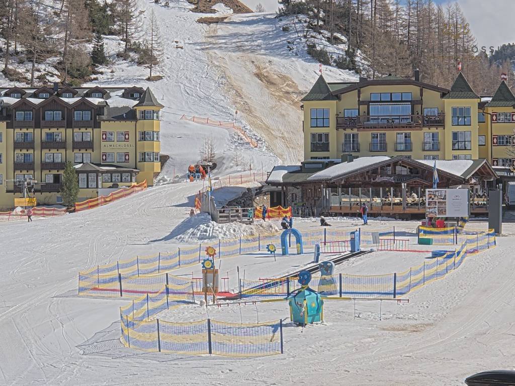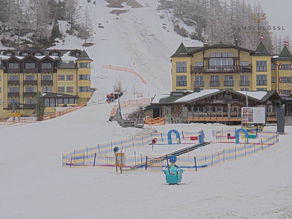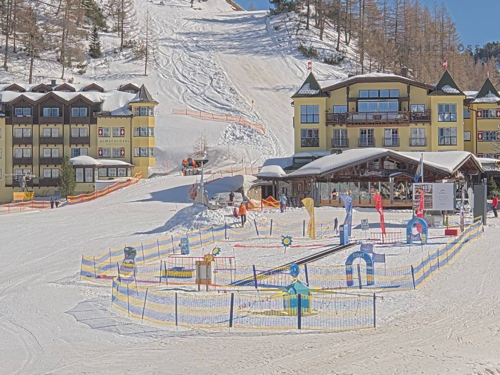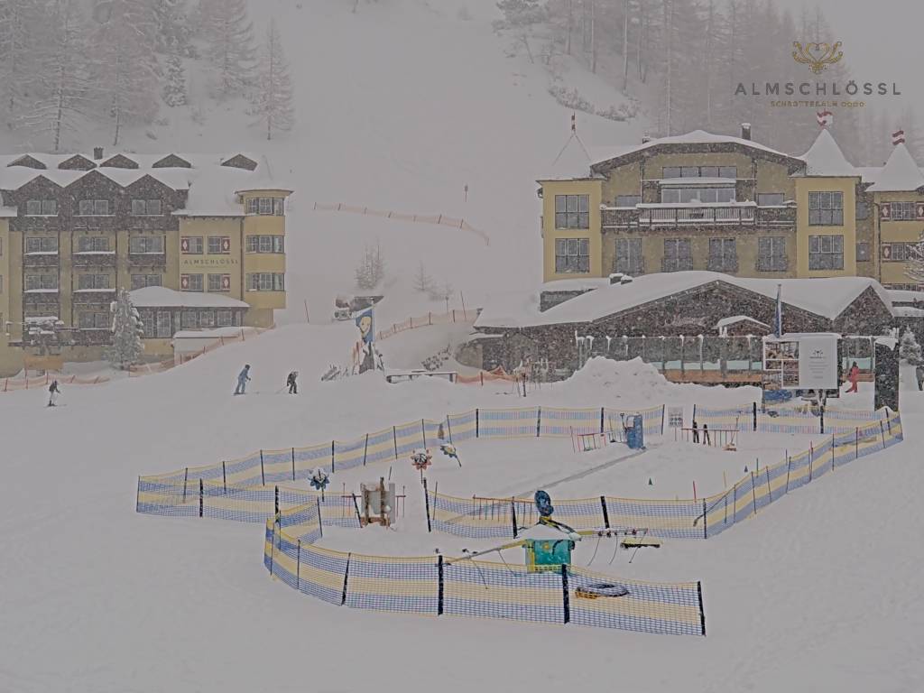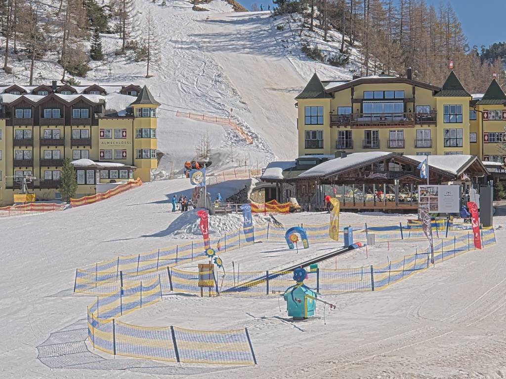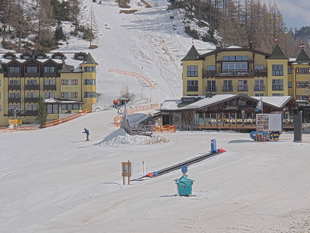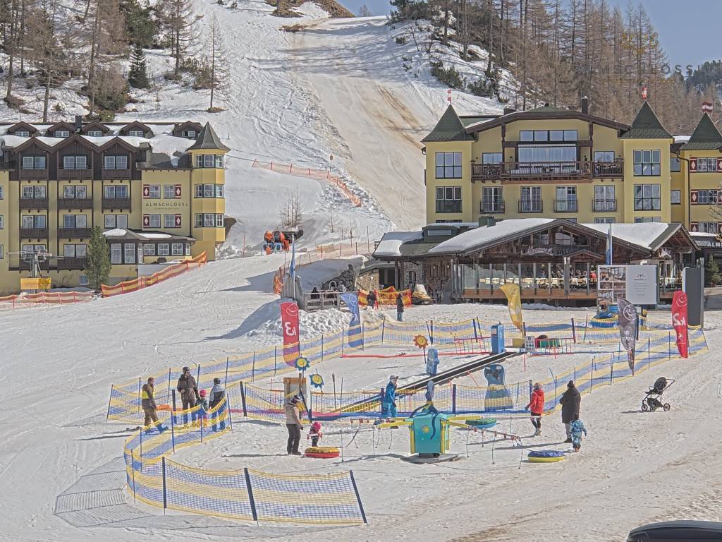 Obertauern, Österreich - 8 km von Tweng: Webcam Hotel Cinderella - Blick vom Hotel Cinderella in Obertauern auf: den Gruberstadl, den Latschnschirm, und im Hintergrund das Hotel Leitner in Obertauern.