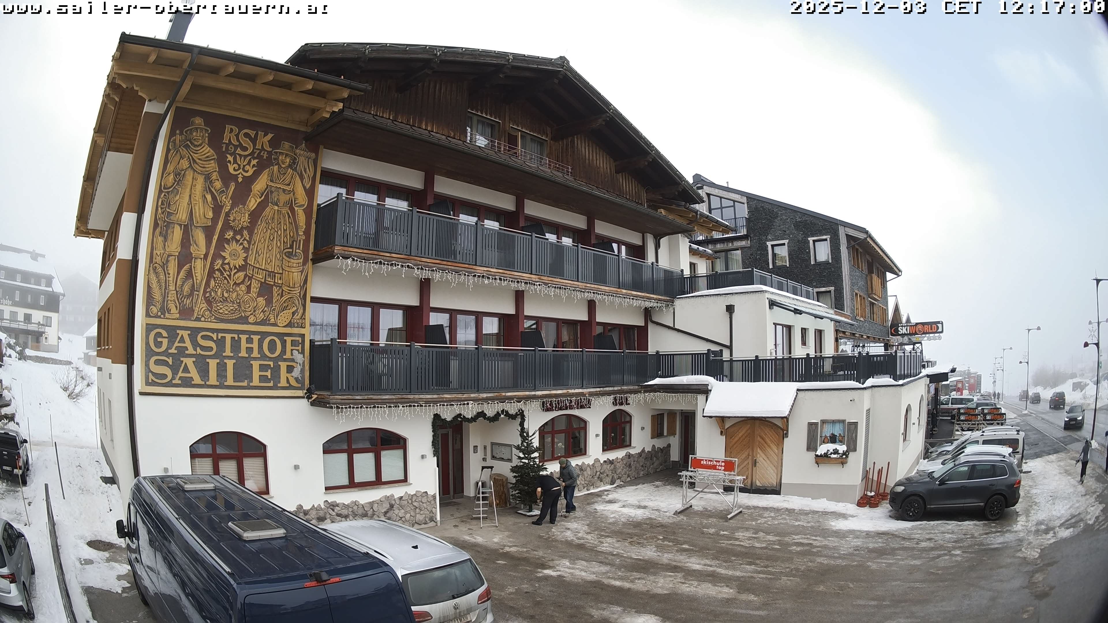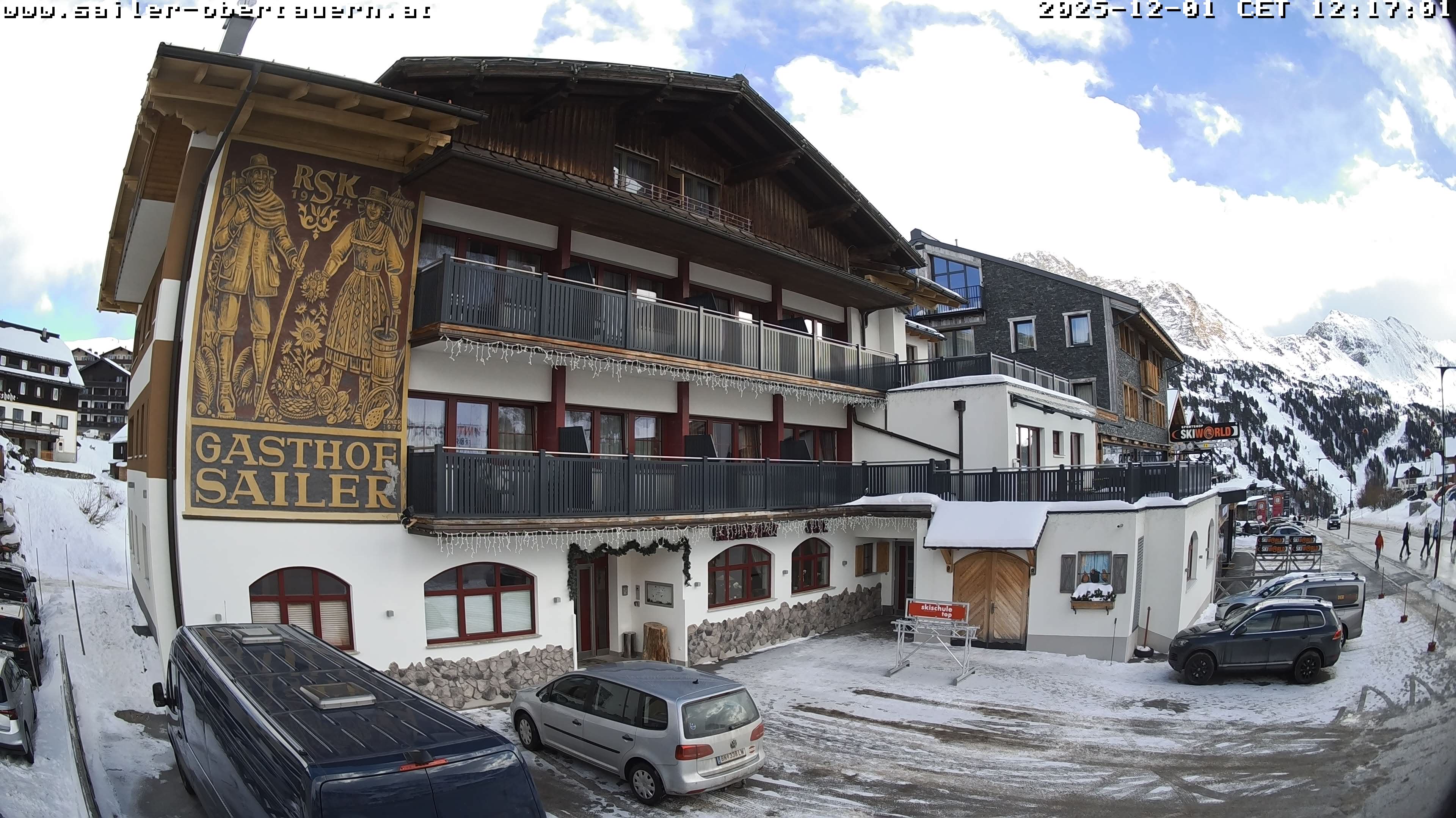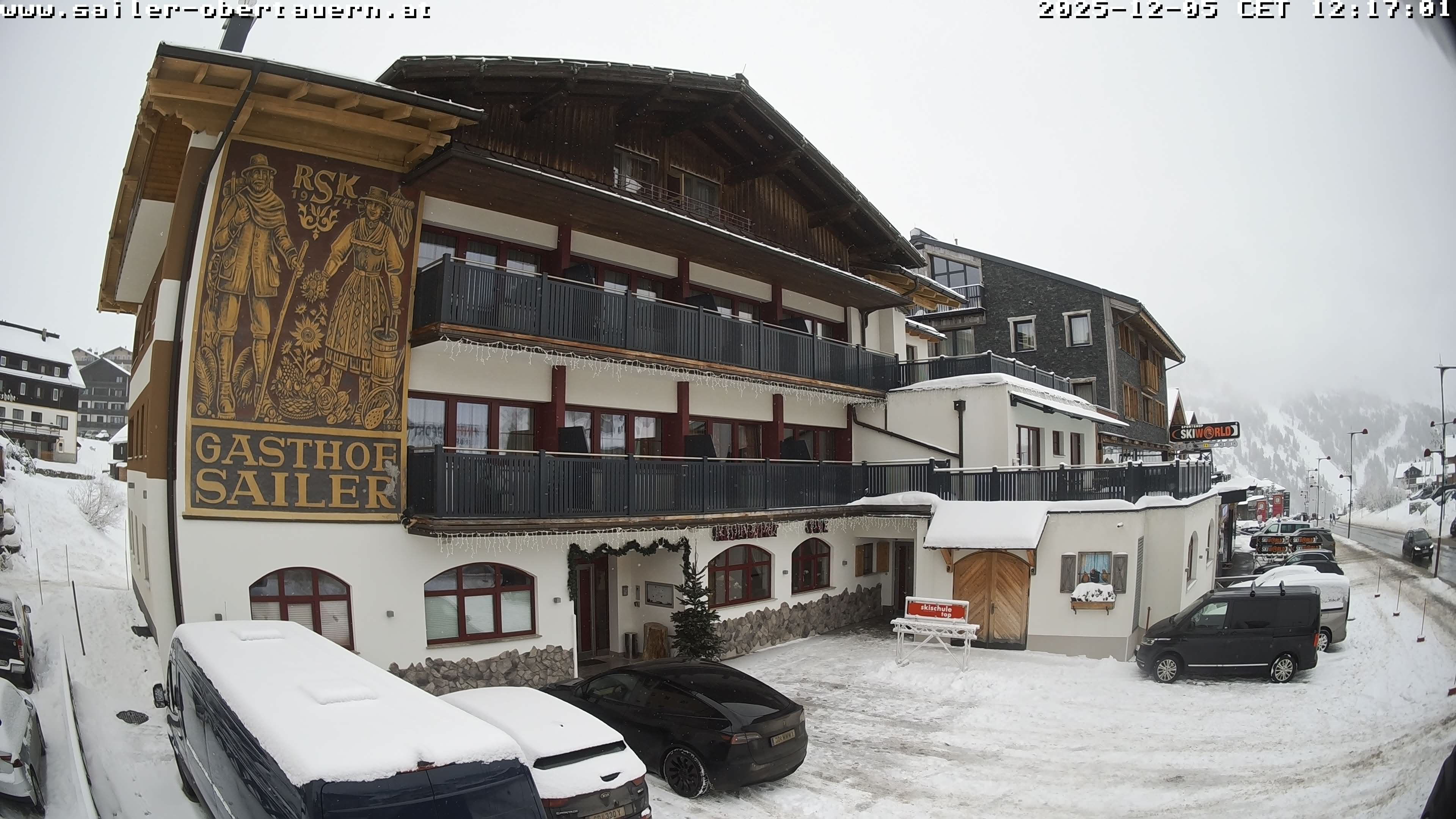 Obertauern, Österreich - 7.1 km von Untertauern: Webcam Hotel Cinderella - Blick vom Hotel Cinderella in Obertauern auf: den Gruberstadl, den Latschnschirm, und im Hintergrund das Hotel Leitner in Obertauern.