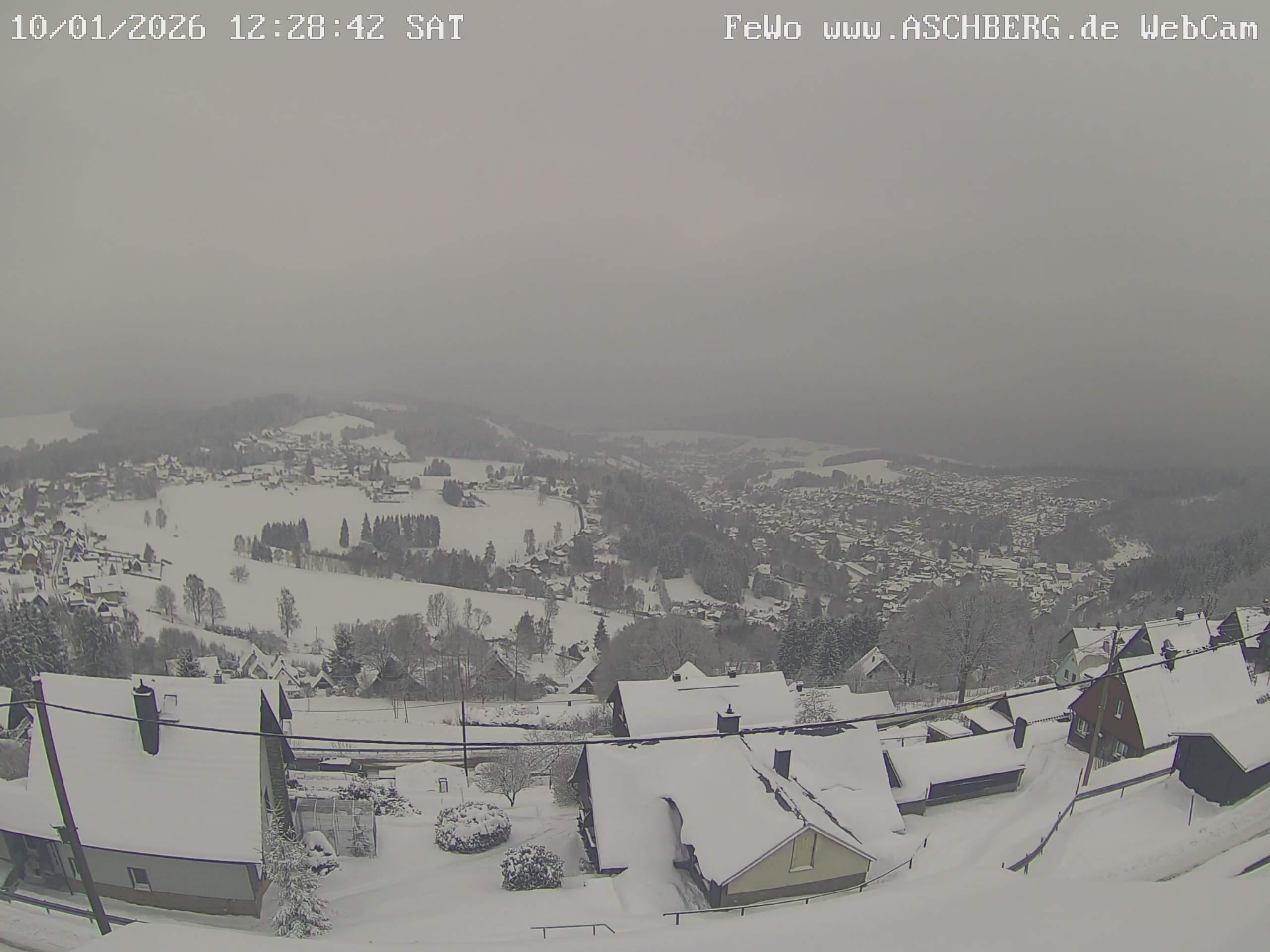 Klingenthal, Deutschland - 26.3 km von Alt-Sattl: Berggasthaus Klingenthal - Panoramawebcambild vom Aschberg, mit Blick ins Tal auf die Stadt Klingenthal und auf die modernste Großschanze Deutschlands, die Vogtlandarena.