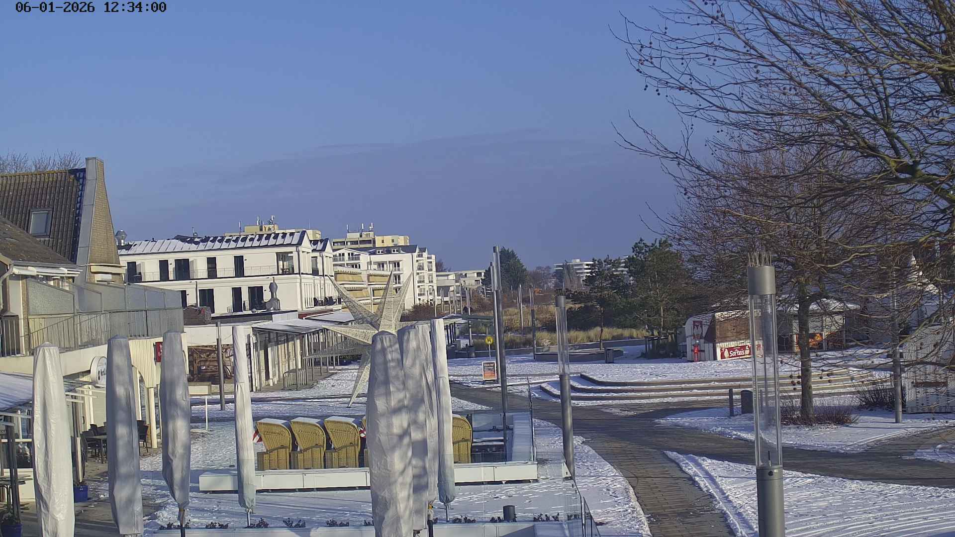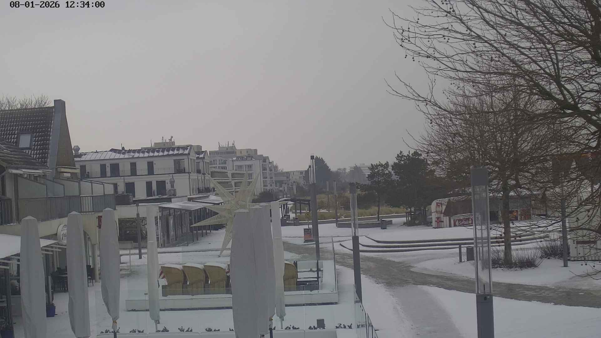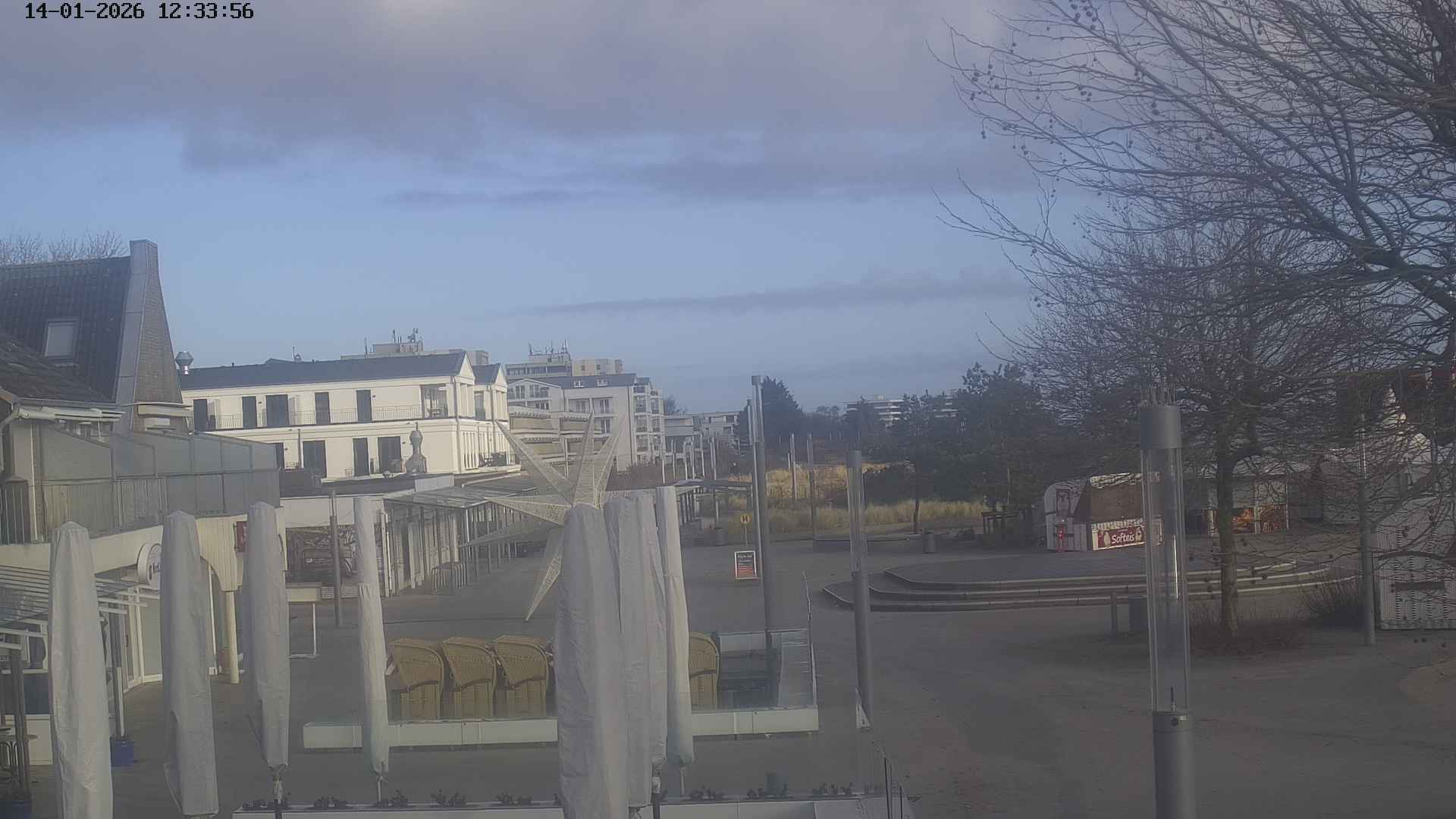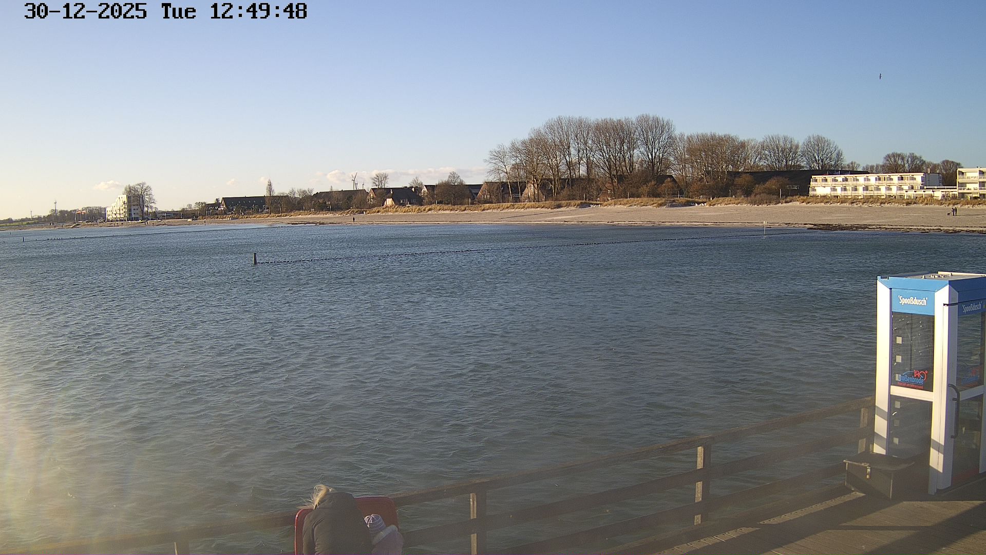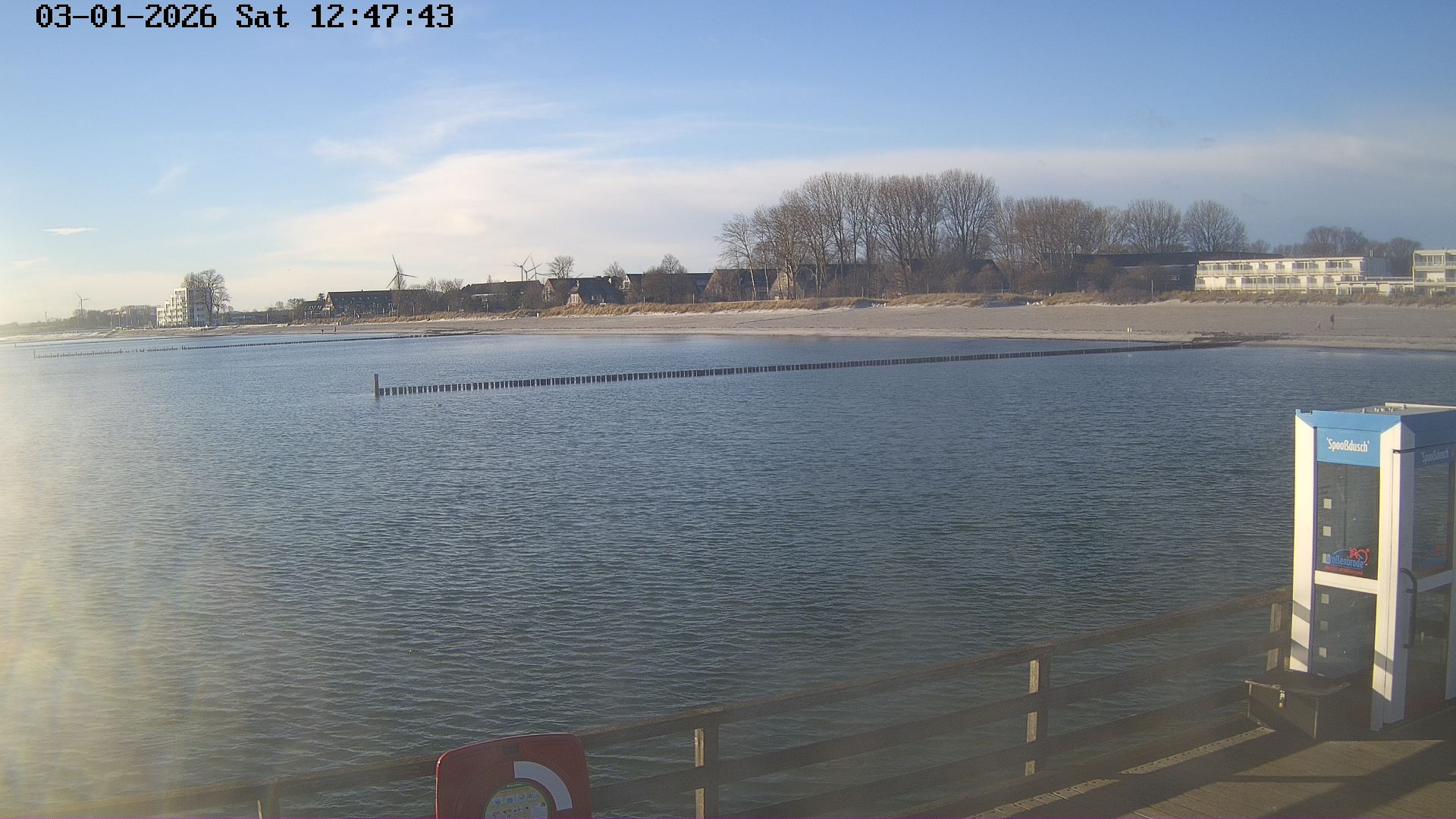 Heiligenhafen, Deutschland - 58.6 km von Anderstrup: Panoramakamera Ferienhaus UTKIEK - Die Livecam befindet sich am 5-Sterne-Ferienhaus UTKIEK, dem neuen, barrierefreien Reethaus (138 qm) in exponierter Lage im Strand Resort Heiligenhafen. Unmittelbar an der Ostsee gelegen hat man von hier einen traumhaften Rundumblick auf die große Erlebnis-Seebrücke, dem neuen Highlight Heiligenhafens, auf Fehmarn mit der prägnanten Sundbrücke, auf das Naturschutzgebiet Graswarder mit seiner faszinierende Vogelwelt und den einzigartigen Villen sowie auf den beliebten 5-Sterne Marina Yachthafen mit seinem maritimen Flair.
