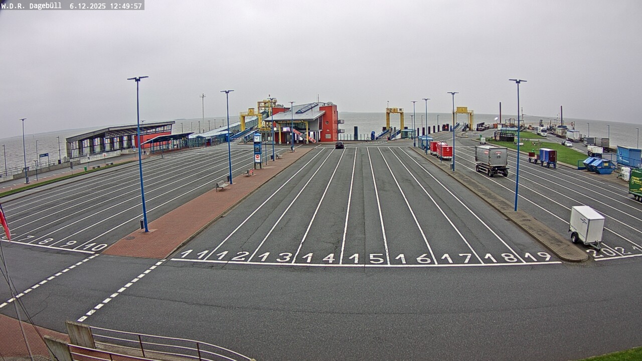 Dagebüll, Deutschland - 23.8 km von Mogeltonder: Dagebüll Hafen - Blick in Richtung Westen auf die Verladung des Fährverkehrs zu den Inseln Föhr und Amrum, links im Bild der Bahnsteig, Fahrzeugaufstellspuren, Wartegbäude 'Tor zu den Inseln'.