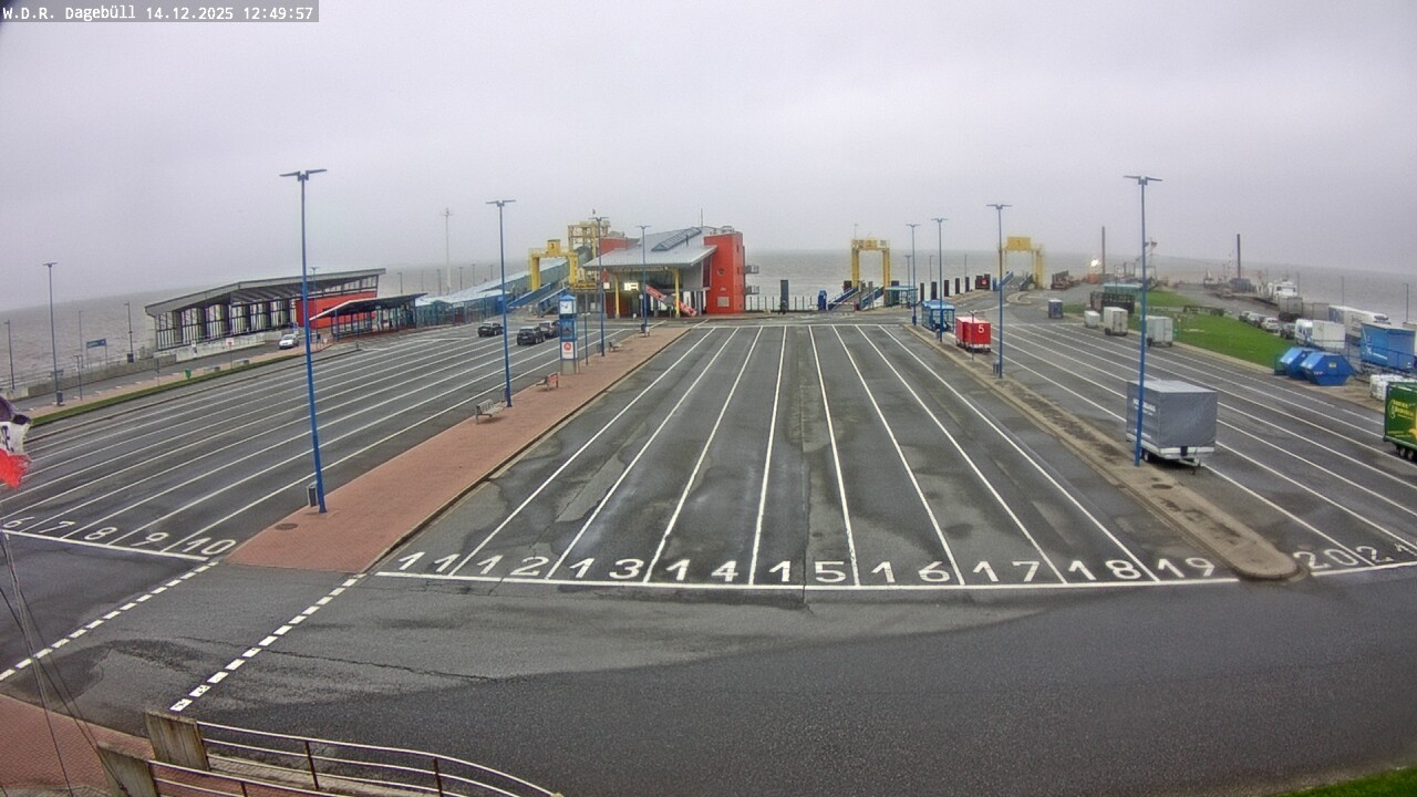 Dagebüll, Deutschland - 35.9 km von Norrehus-Ballum: Dagebüll Hafen - Blick in Richtung Westen auf die Verladung des Fährverkehrs zu den Inseln Föhr und Amrum, links im Bild der Bahnsteig, Fahrzeugaufstellspuren, Wartegbäude 'Tor zu den Inseln'.