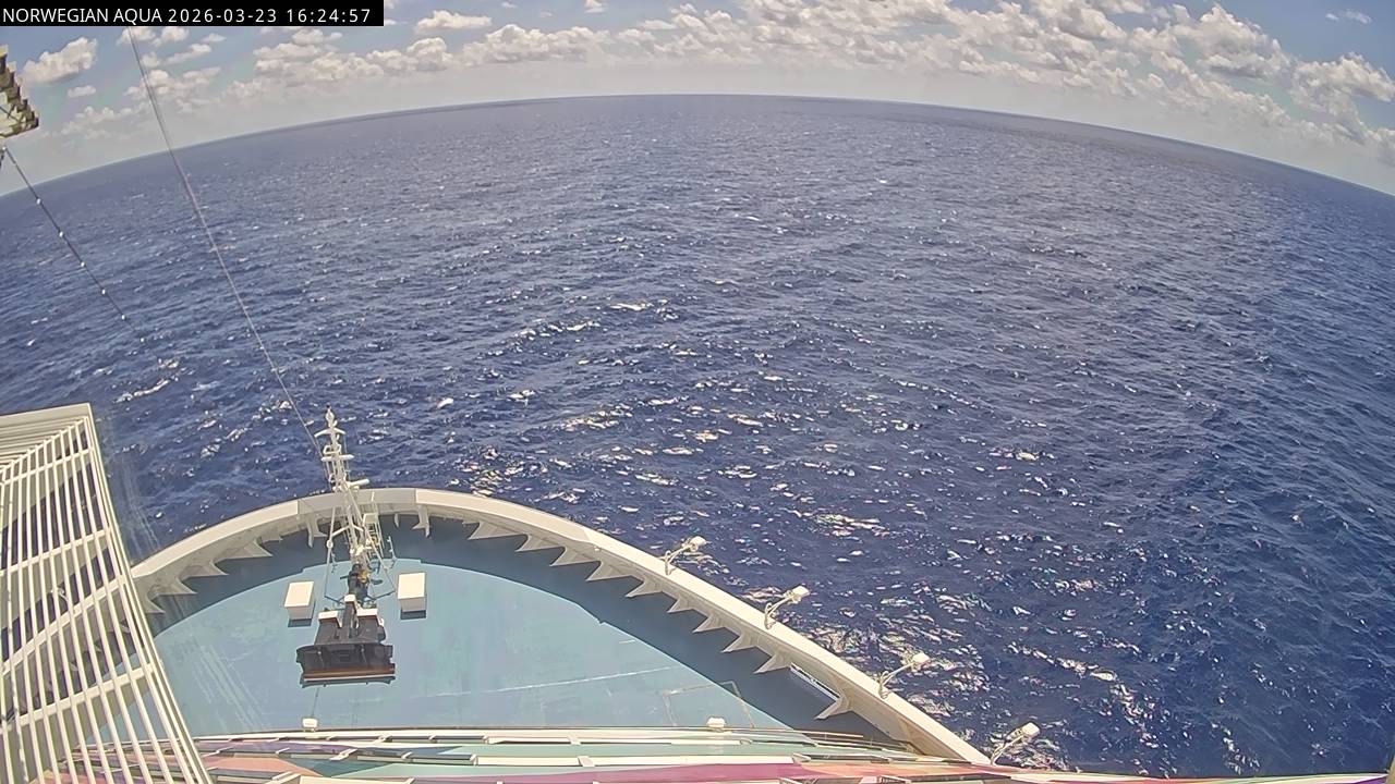 Norwegian Aqua, Norwegian Cruise Line - 125.3 km von Fortuna: Blick über den Bug - Werfen Sie einen Blick von der Brücke des Kreuzfahrtschiffes Norwegian Aqua auf die See.