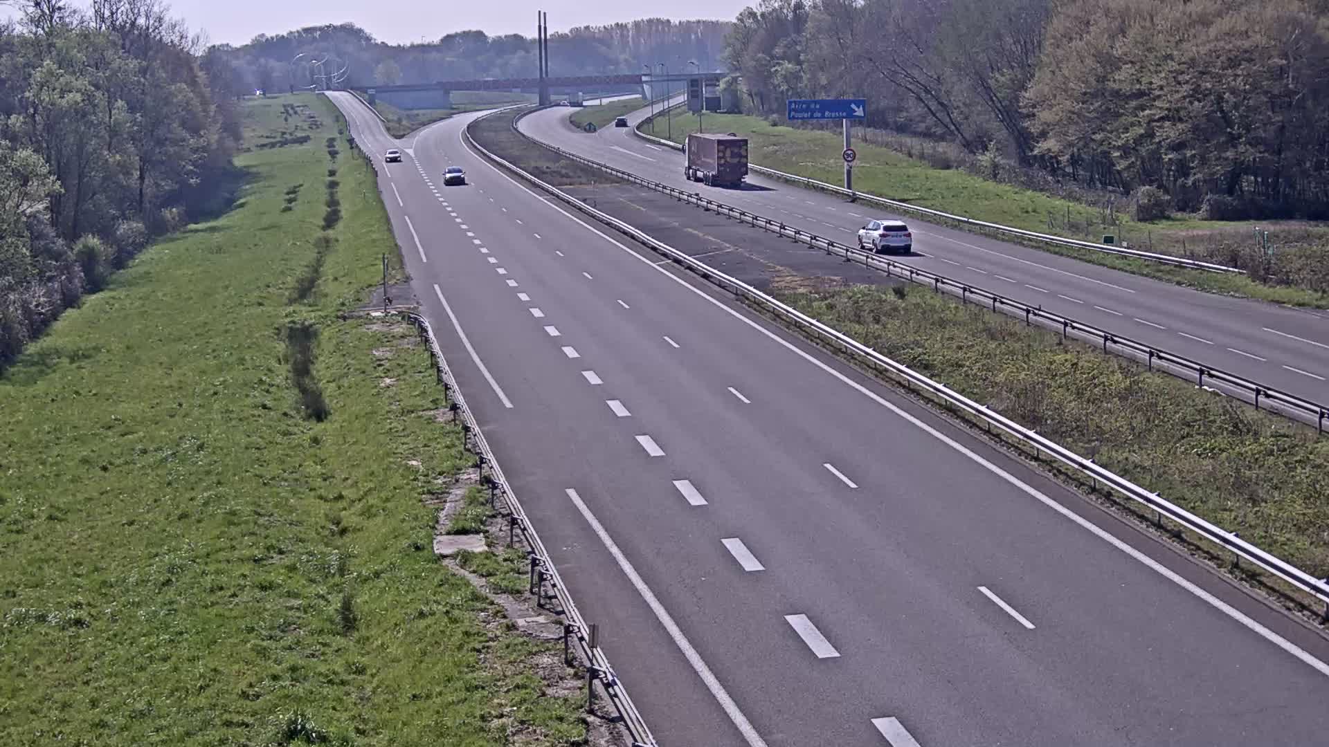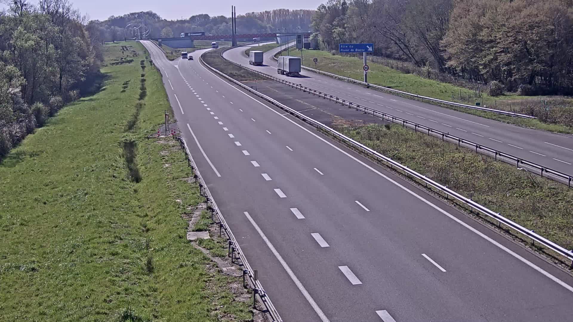 Bourg-en-Bresse, Frankreich - 31.3 km von Ambutrix: A39 près de Bourg-en-Bresse et Lons-le-Saunier, à hauteur de l'Aire du Poulet de Bresse, vue orientée vers Bourg-en-Bresse - Ein Blick auf die aktuelle Verkehrssituation.