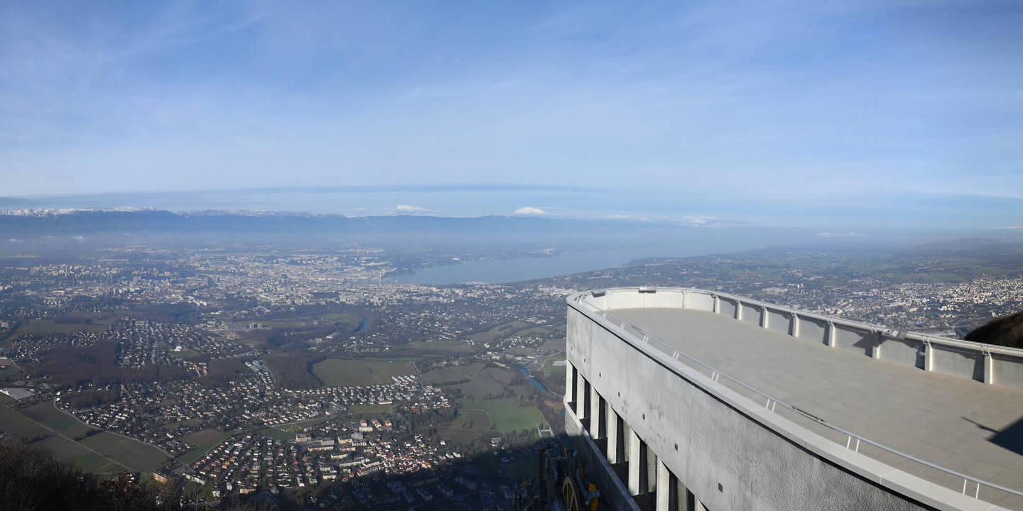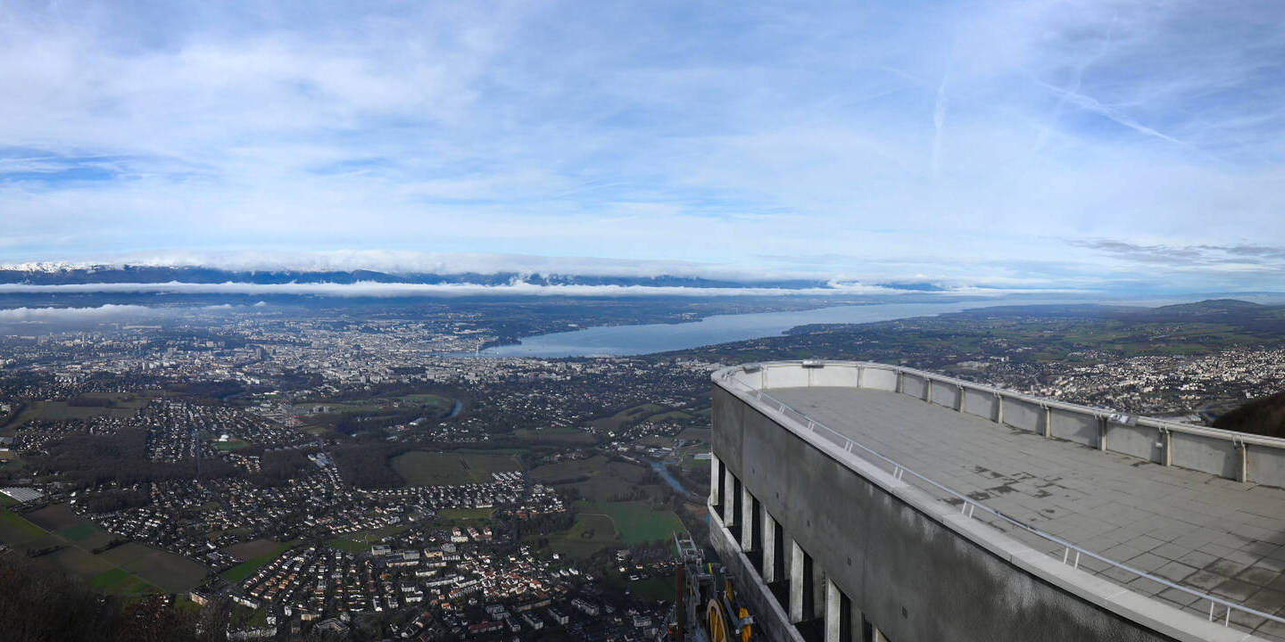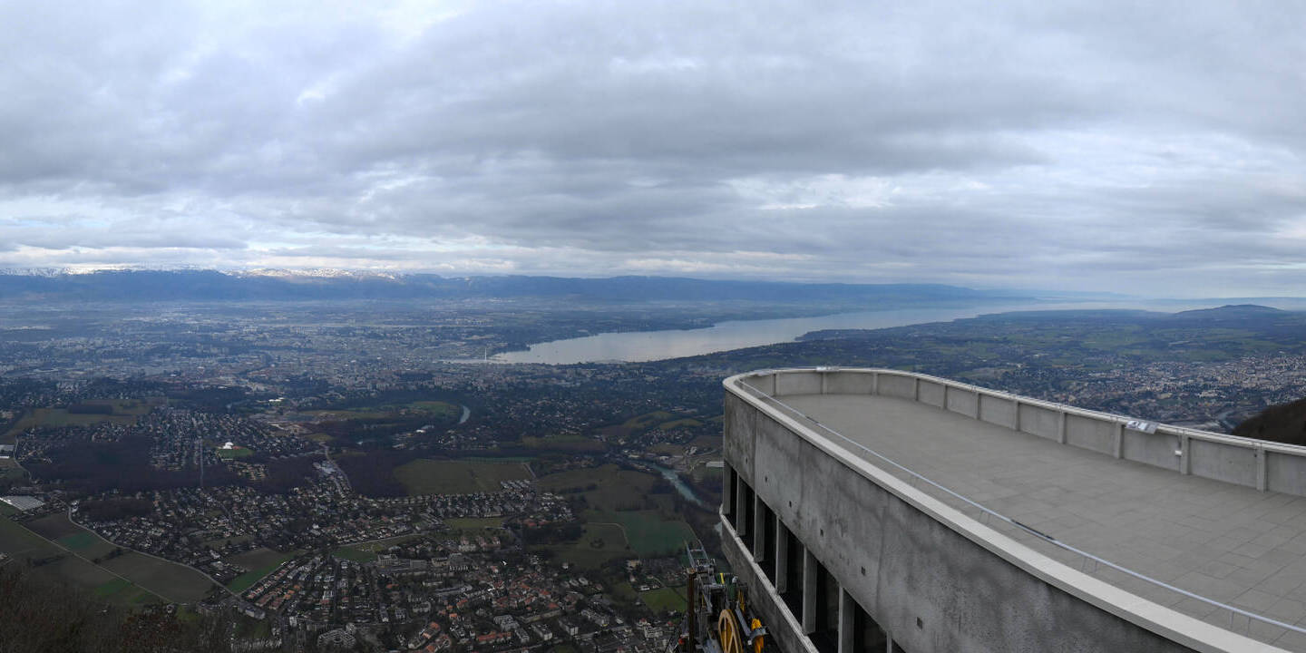Geneva, Schweiz - 18.6 km von Arenthon: Stadtpanorama - Blick über Genf. Am Horizont das Wahrzeichen der Stadt: die Wasserfontäne. Bei klarer Sicht im Hintergrund das Jura-Gebirge.