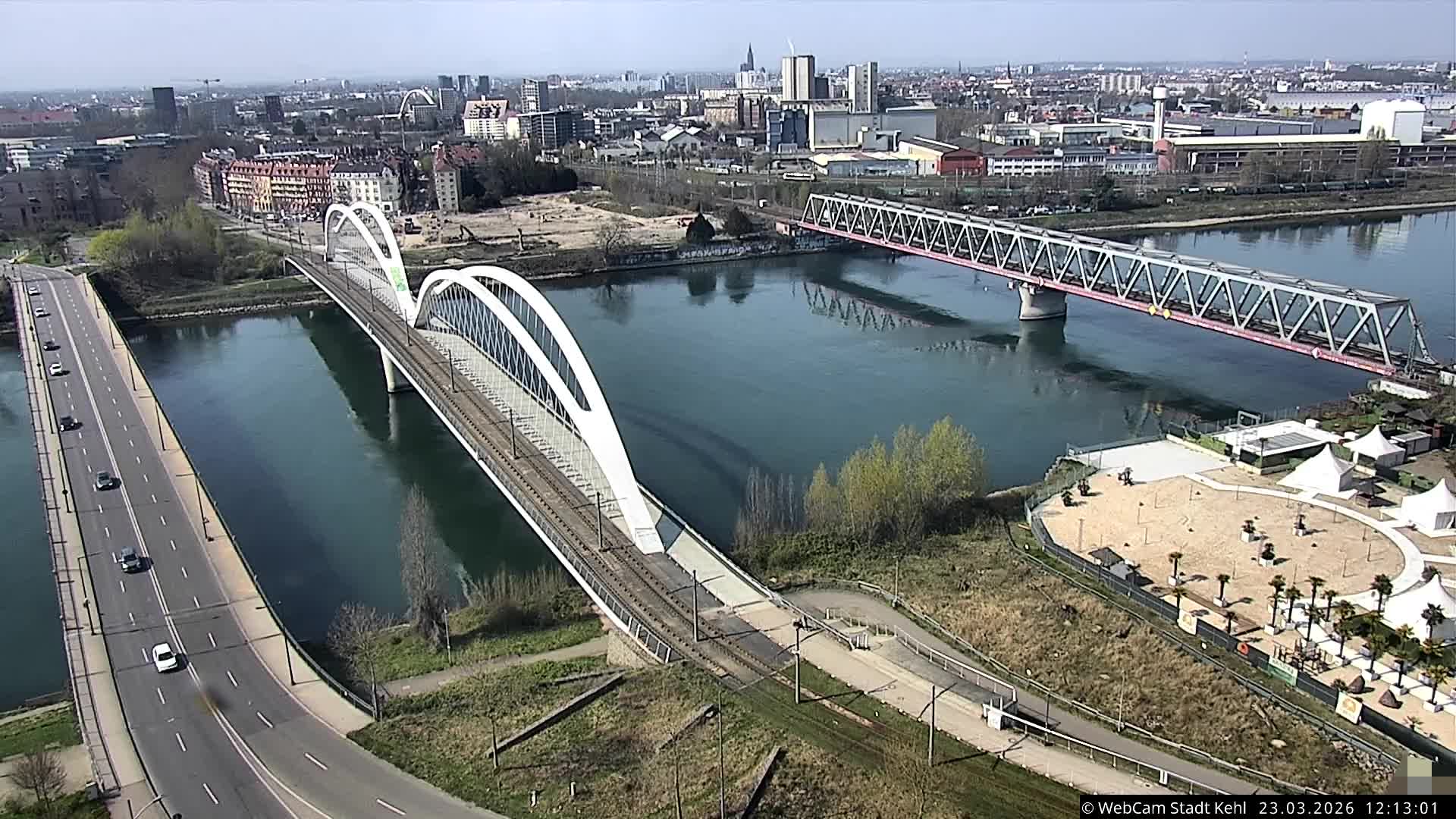 Kehl, Deutschland - 33 km von Uberach: Aktuelle Bilder aus Kehl - Die Bauarbeiten für die Trambrücke über den Rhein lassen sich per Webcam verfolgen: Die auf dem Hochhaus installierte Kamera der Stadt Kehl macht alle 15 Minuten aus verschiedenen Perspektiven Fotos der Baustelle. Darüber hinaus richtet sich die Webcam auf den Kehler Teil des Gartens der zwei Ufer und die Passerelle. Eine zweite städtische Kamera nimmt Bilder des Fest- und Parkplatzes Läger auf. Jedes Motiv kann man anwählen, um Einzelbilder zu betrachten oder sich im Zeitraffer anzuschauen, was dort den Tag über oder an den vergangenen Tagen passiert ist.