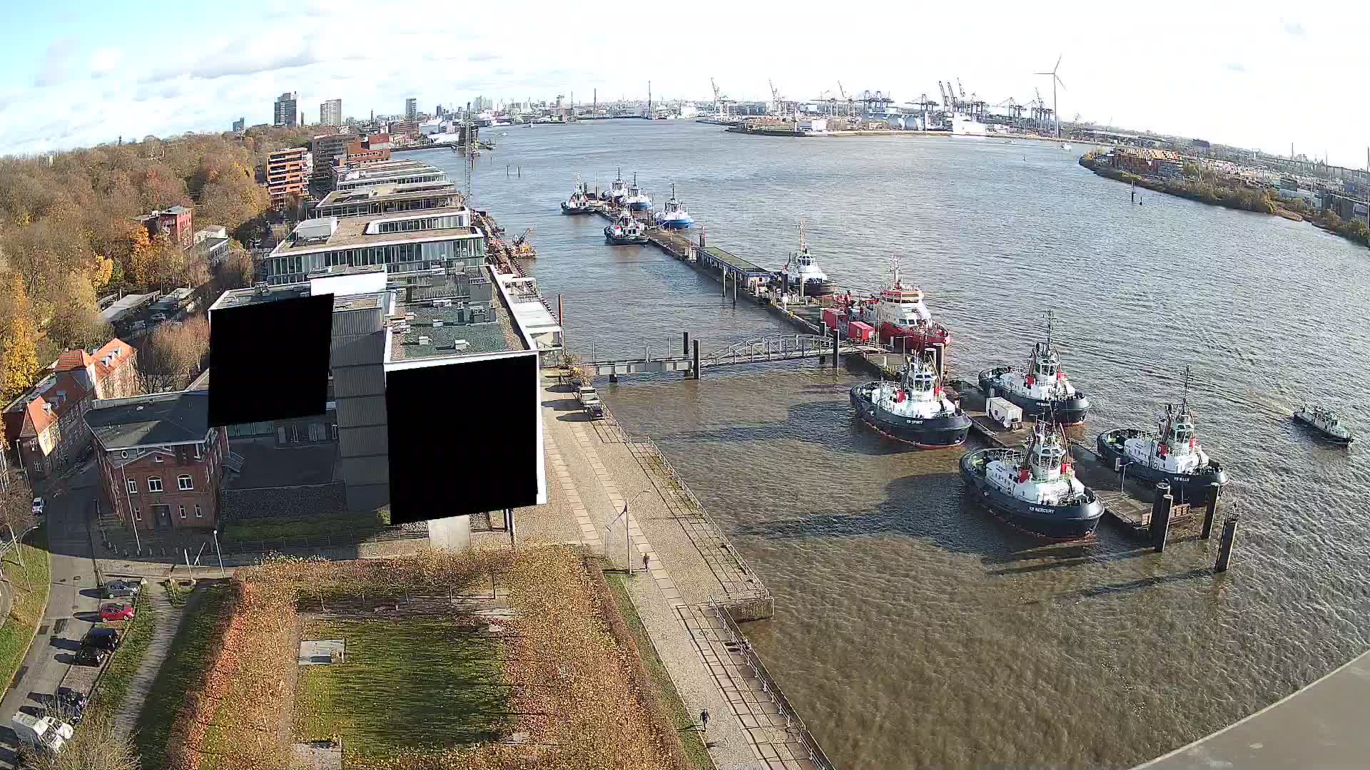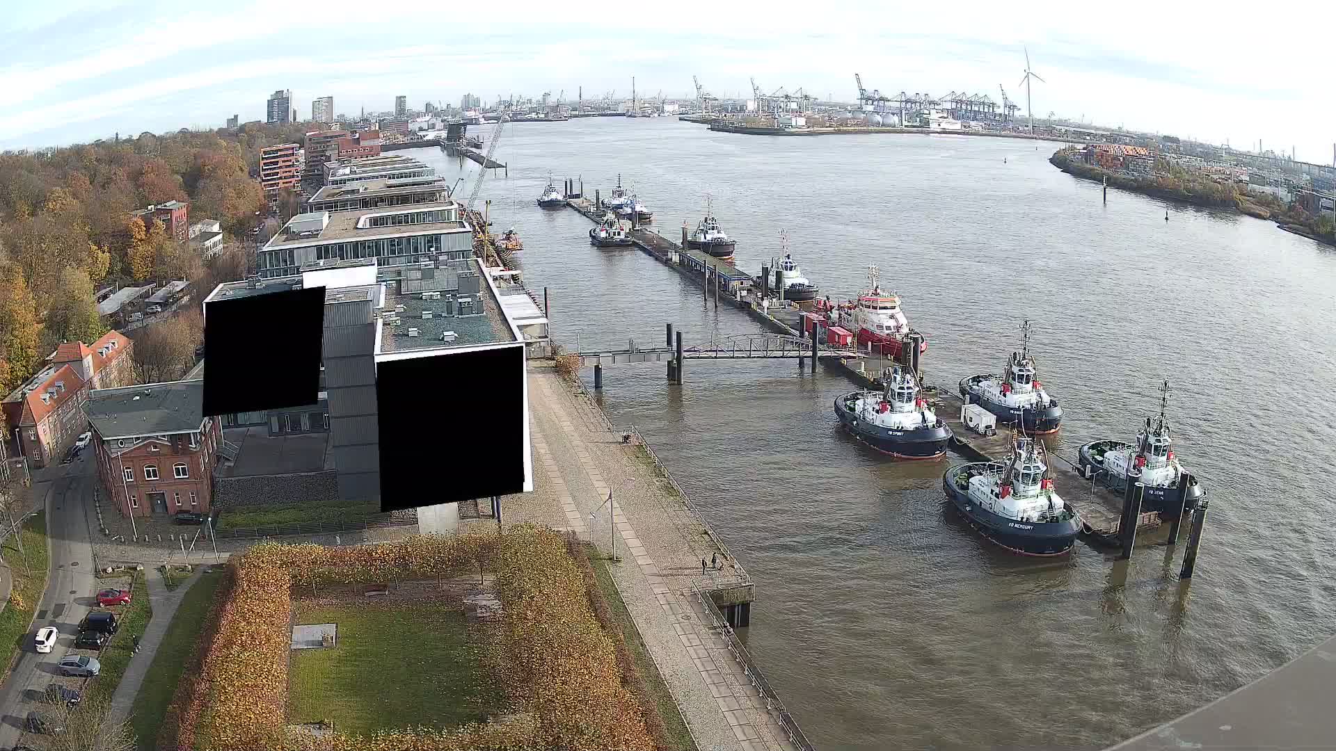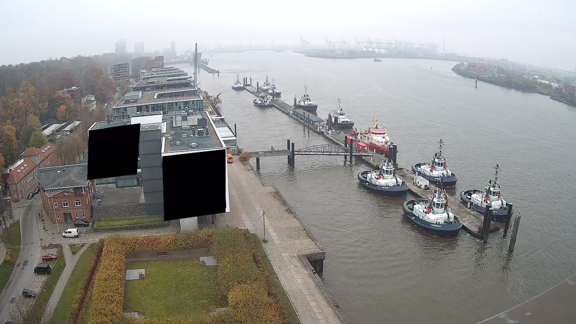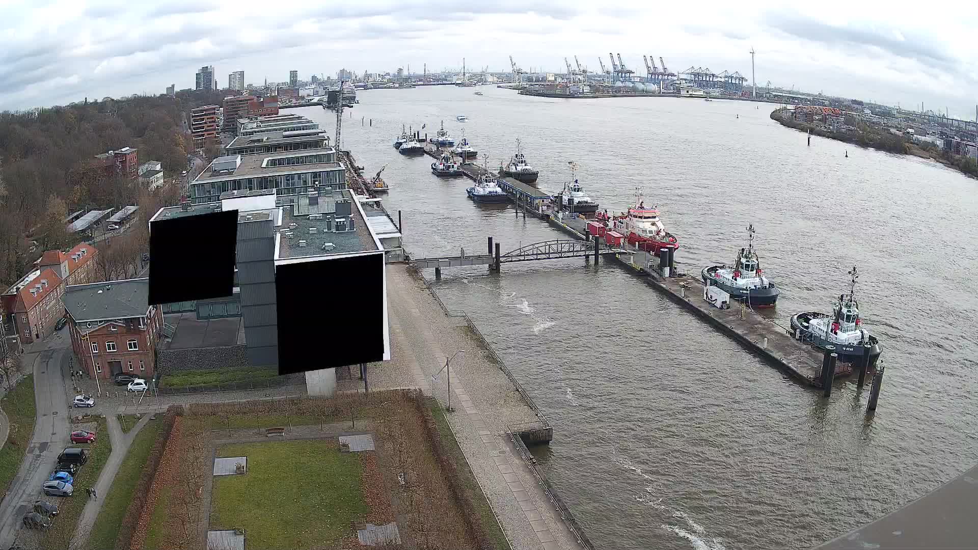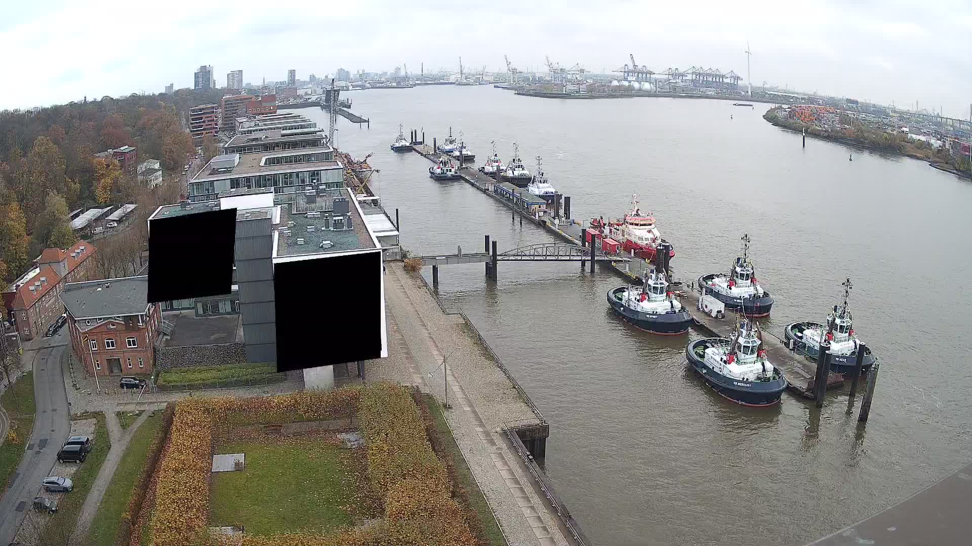 Hamburg, Deutschland - 24.1 km von Achterndiek: Hamburg Övelgönne Richtung Osten - Die Webcam Richtung Osten zeigt vom Augustinum die eigentlichen Hafeneinfahrten. Hier werden alle 'Riesen-Pötte', die nicht schon vorher angelegt haben, vorbeifahren, um zu ihrem Dock zu fahren. Eine Reihe von Schleppern steht für Andockmanöver bereit.