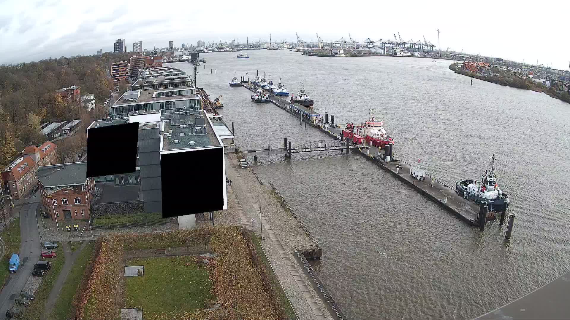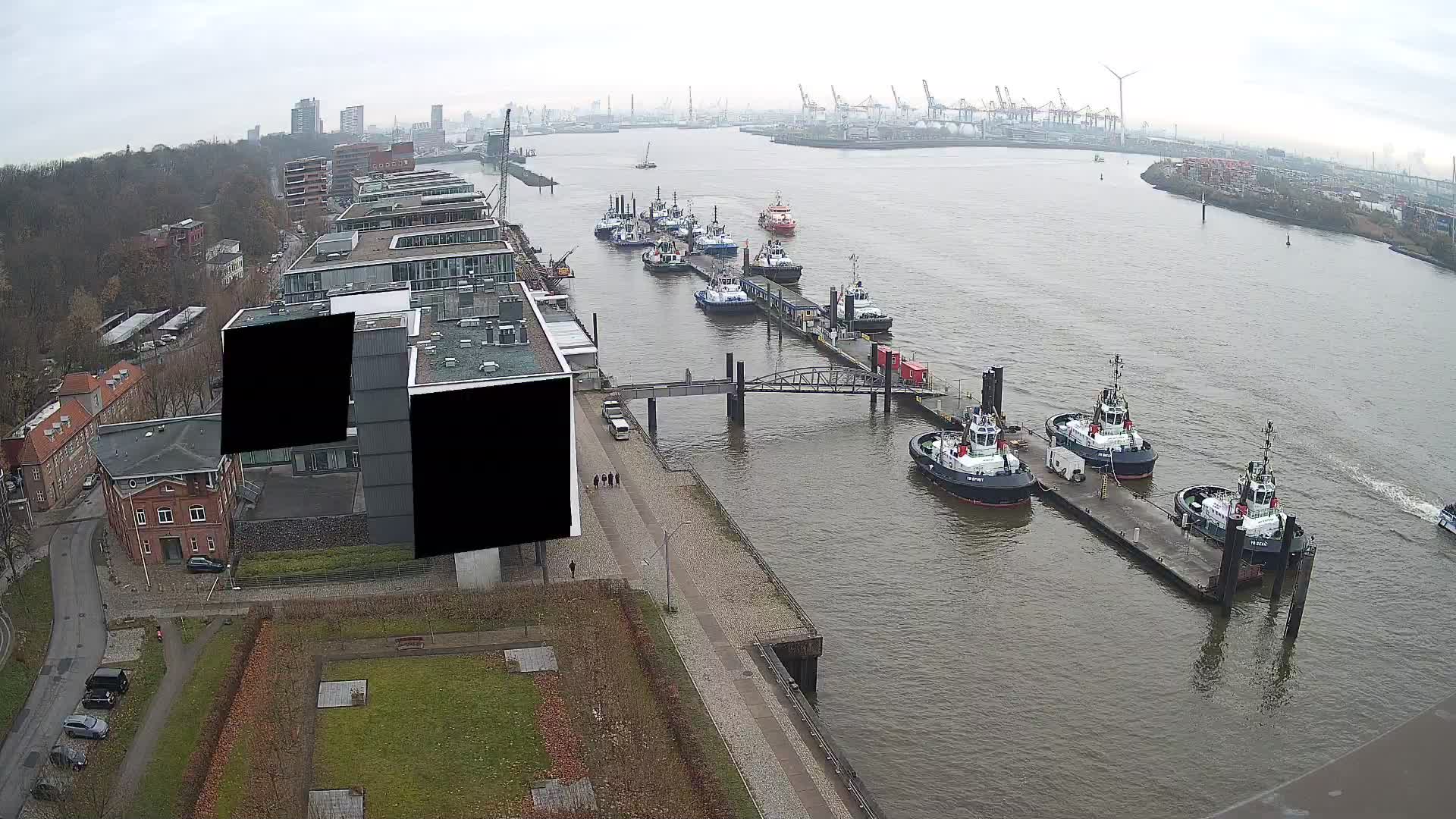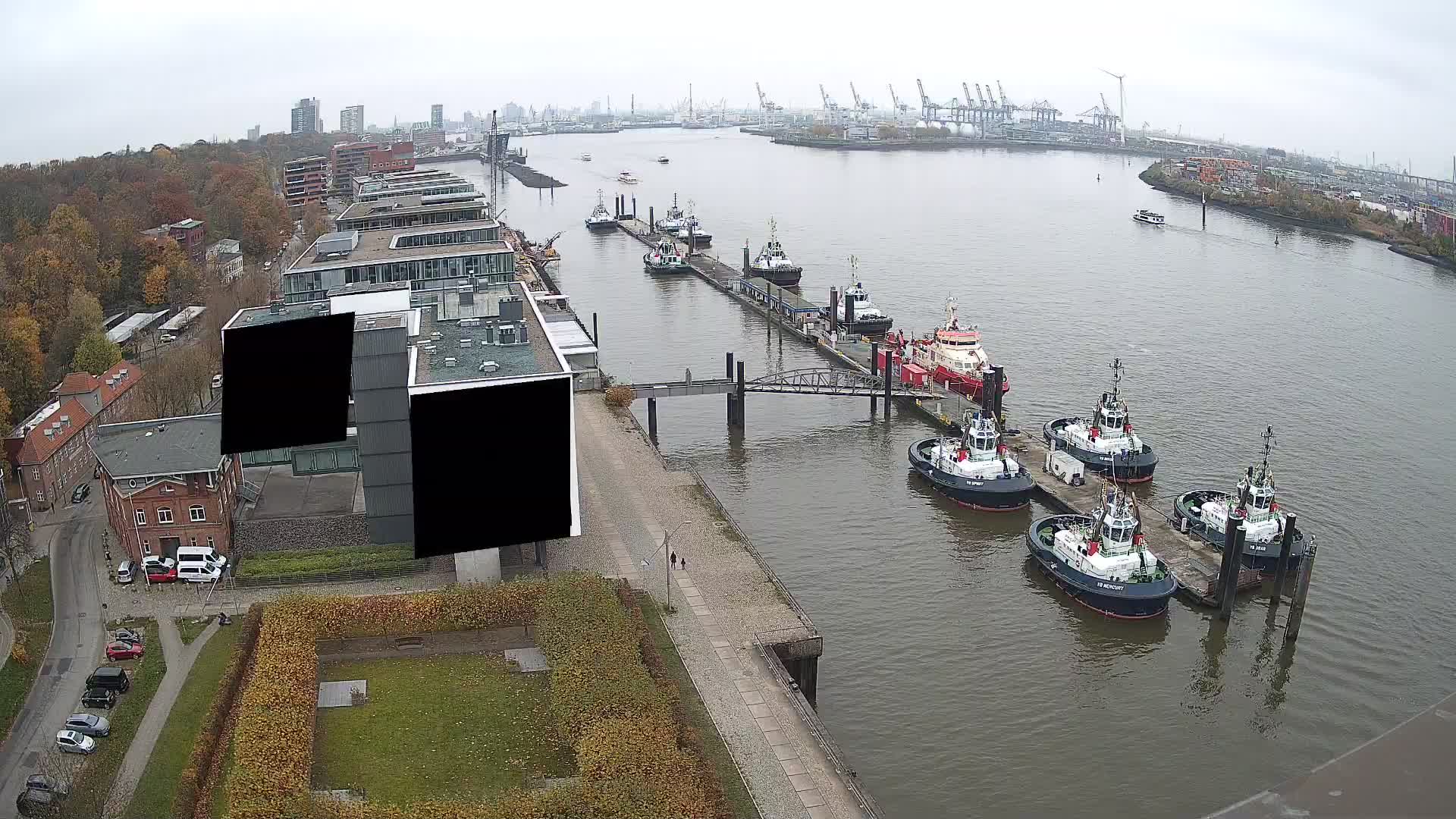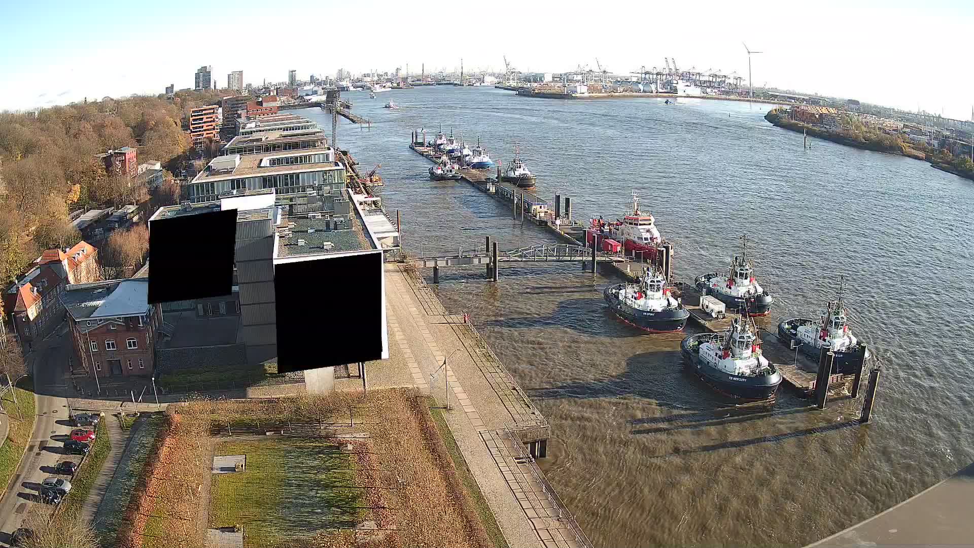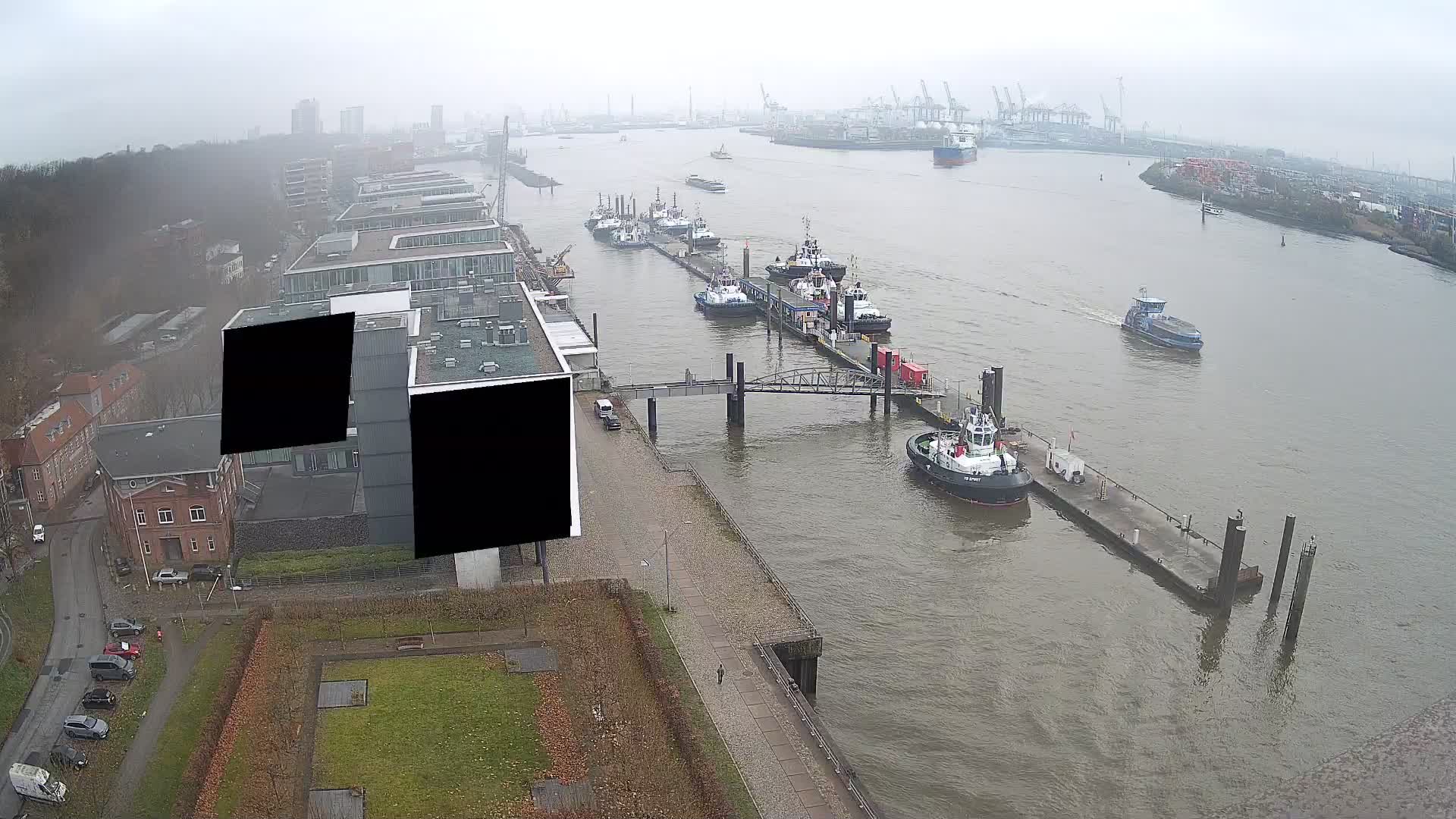 Hamburg, Deutschland - 24.1 km von Achterndiek: Hamburg Övelgönne Richtung Osten - Die Webcam Richtung Osten zeigt vom Augustinum die eigentlichen Hafeneinfahrten. Hier werden alle 'Riesen-Pötte', die nicht schon vorher angelegt haben, vorbeifahren, um zu ihrem Dock zu fahren. Eine Reihe von Schleppern steht für Andockmanöver bereit.