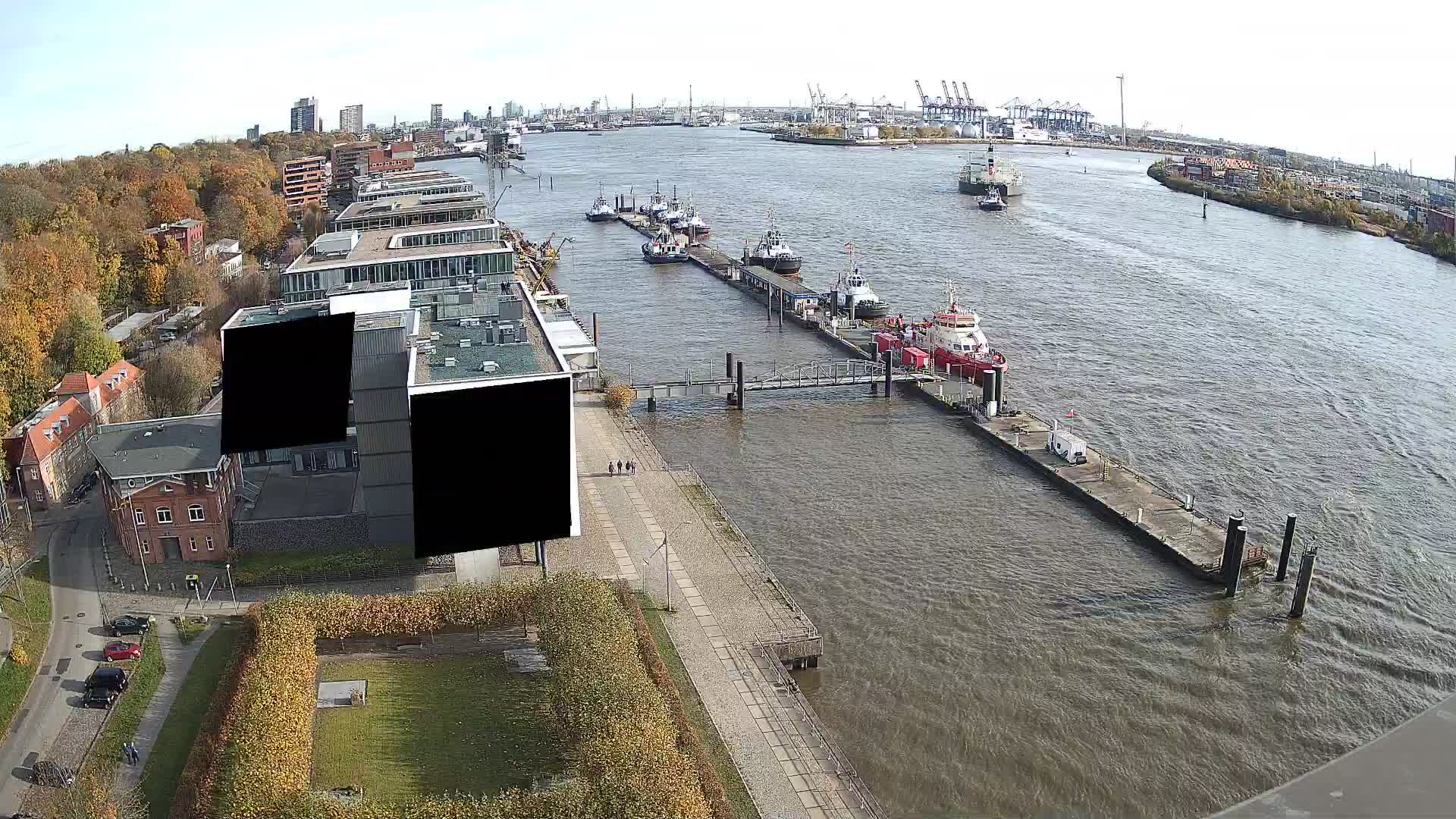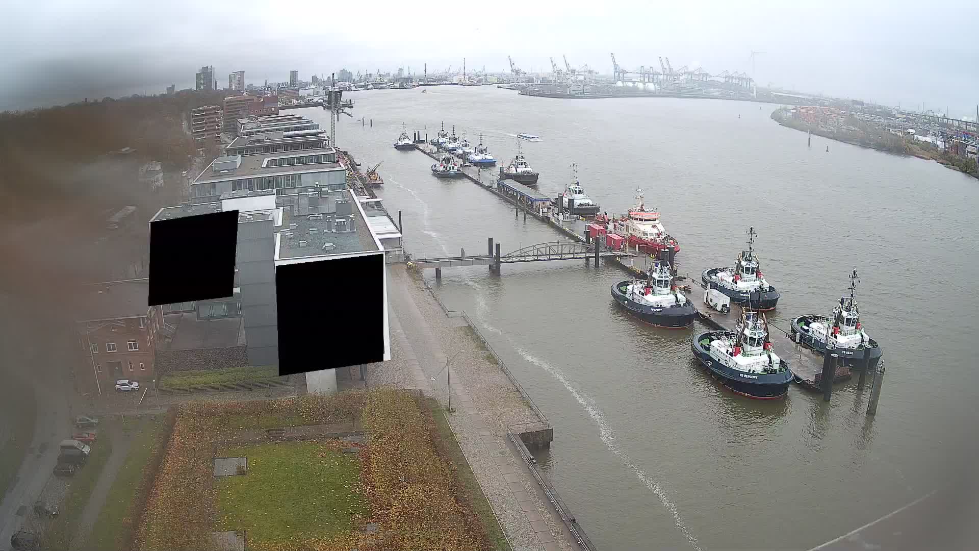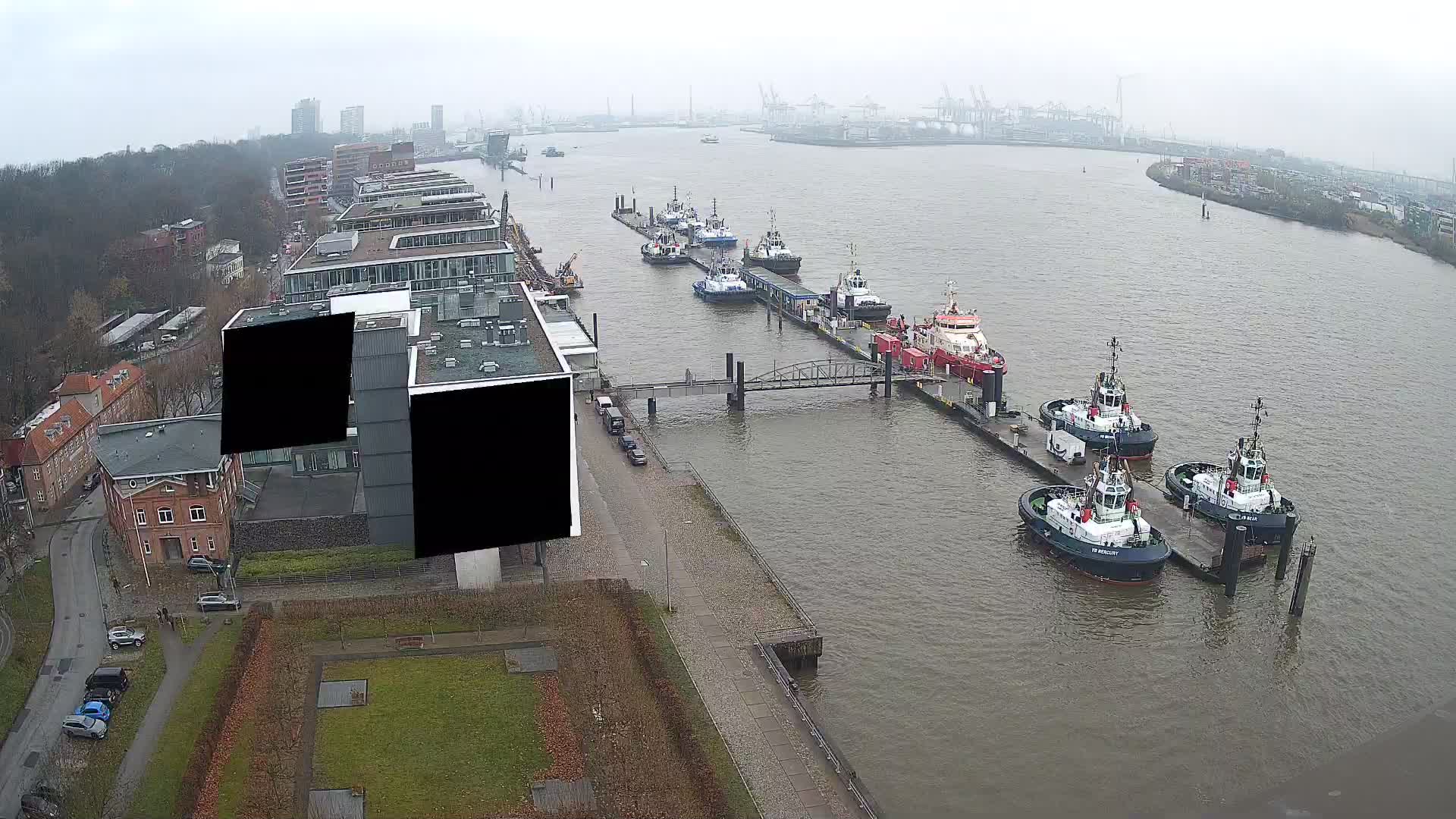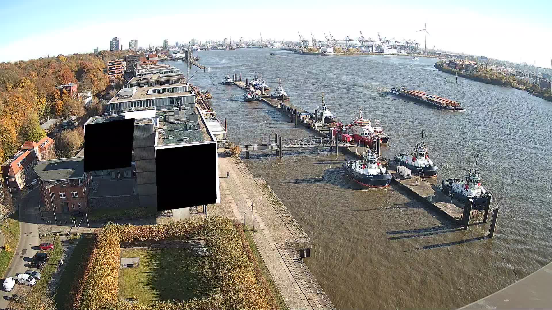 Hamburg, Deutschland - 24.1 km von Achterndiek: Hamburg Övelgönne Richtung Osten - Die Webcam Richtung Osten zeigt vom Augustinum die eigentlichen Hafeneinfahrten. Hier werden alle 'Riesen-Pötte', die nicht schon vorher angelegt haben, vorbeifahren, um zu ihrem Dock zu fahren. Eine Reihe von Schleppern steht für Andockmanöver bereit.