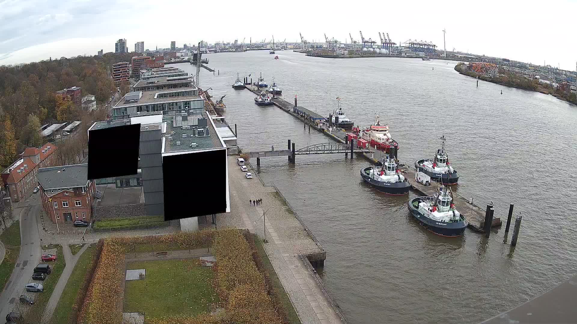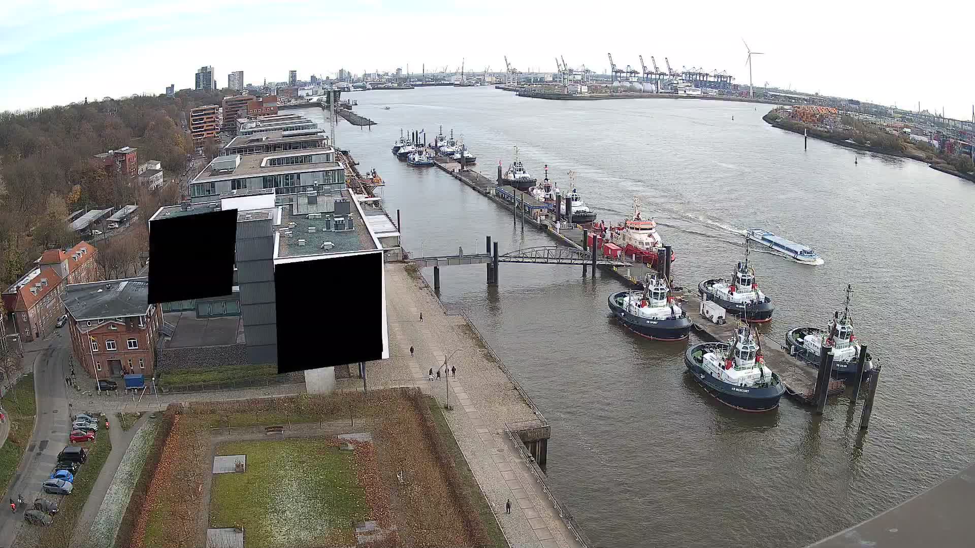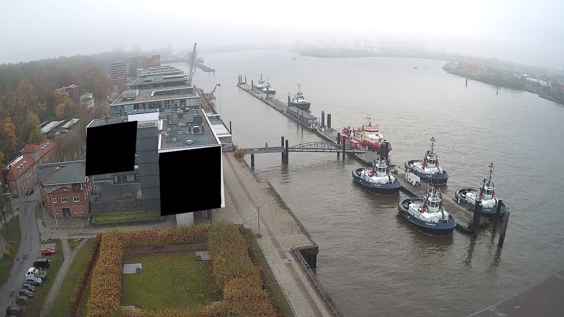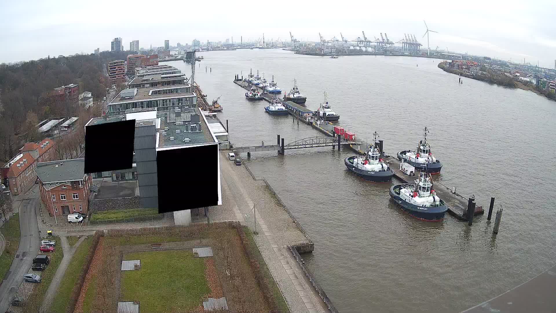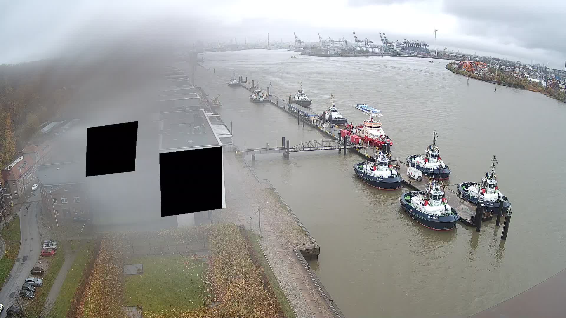 Hamburg, Deutschland - 24.1 km von Achterndiek: Hamburg Övelgönne Richtung Osten - Die Webcam Richtung Osten zeigt vom Augustinum die eigentlichen Hafeneinfahrten. Hier werden alle 'Riesen-Pötte', die nicht schon vorher angelegt haben, vorbeifahren, um zu ihrem Dock zu fahren. Eine Reihe von Schleppern steht für Andockmanöver bereit.