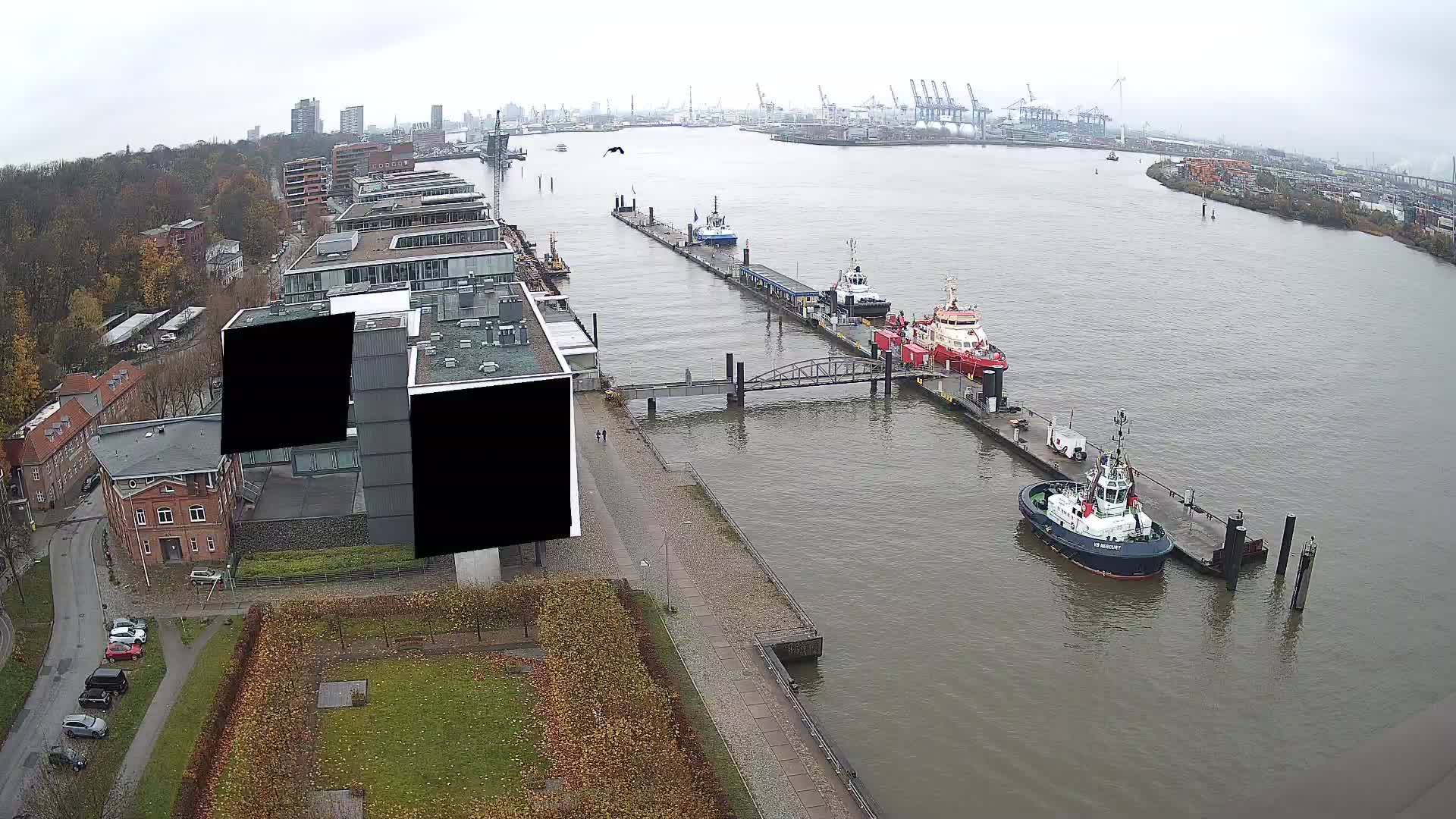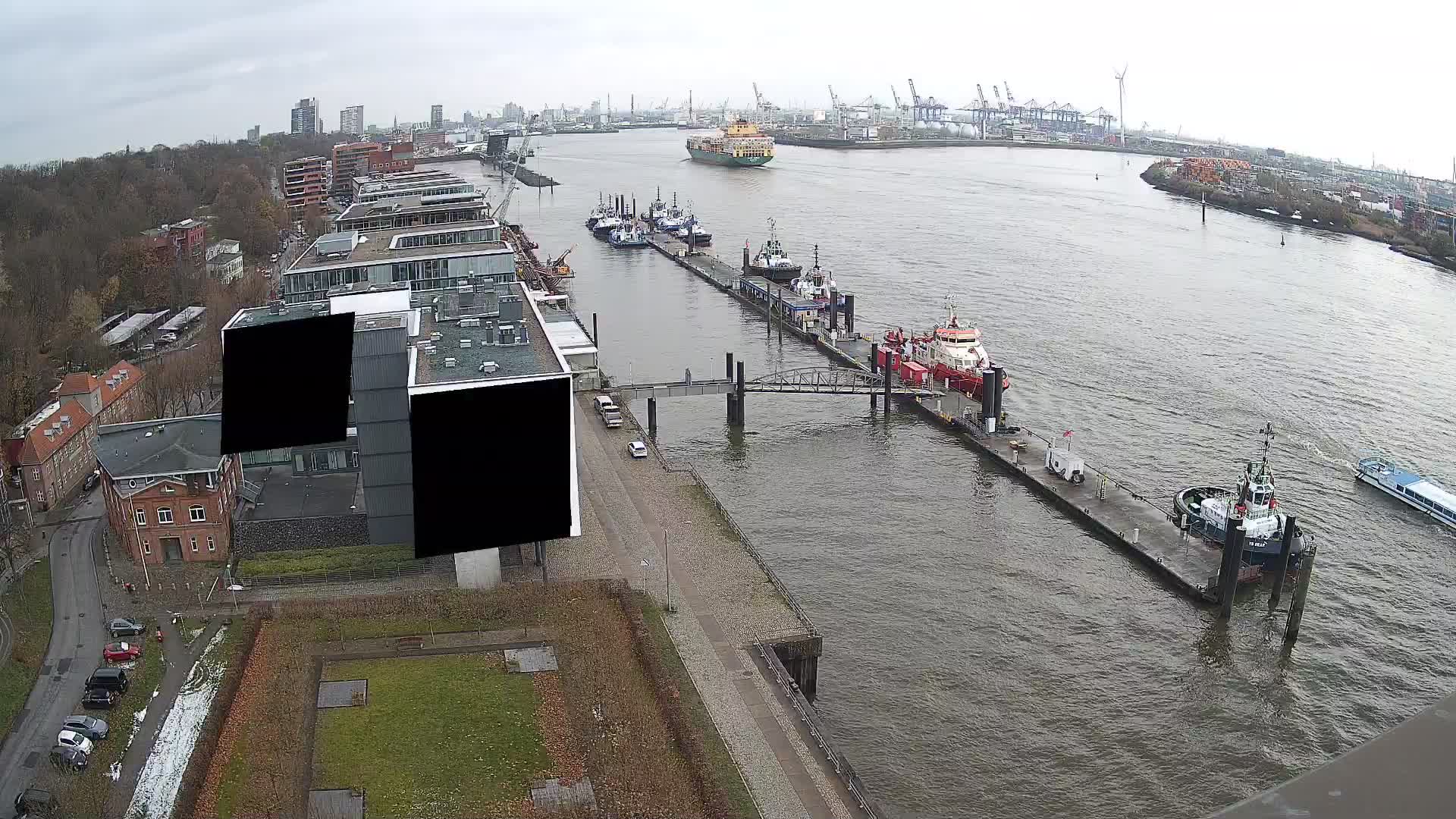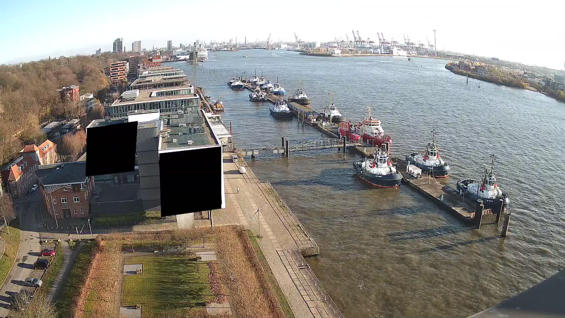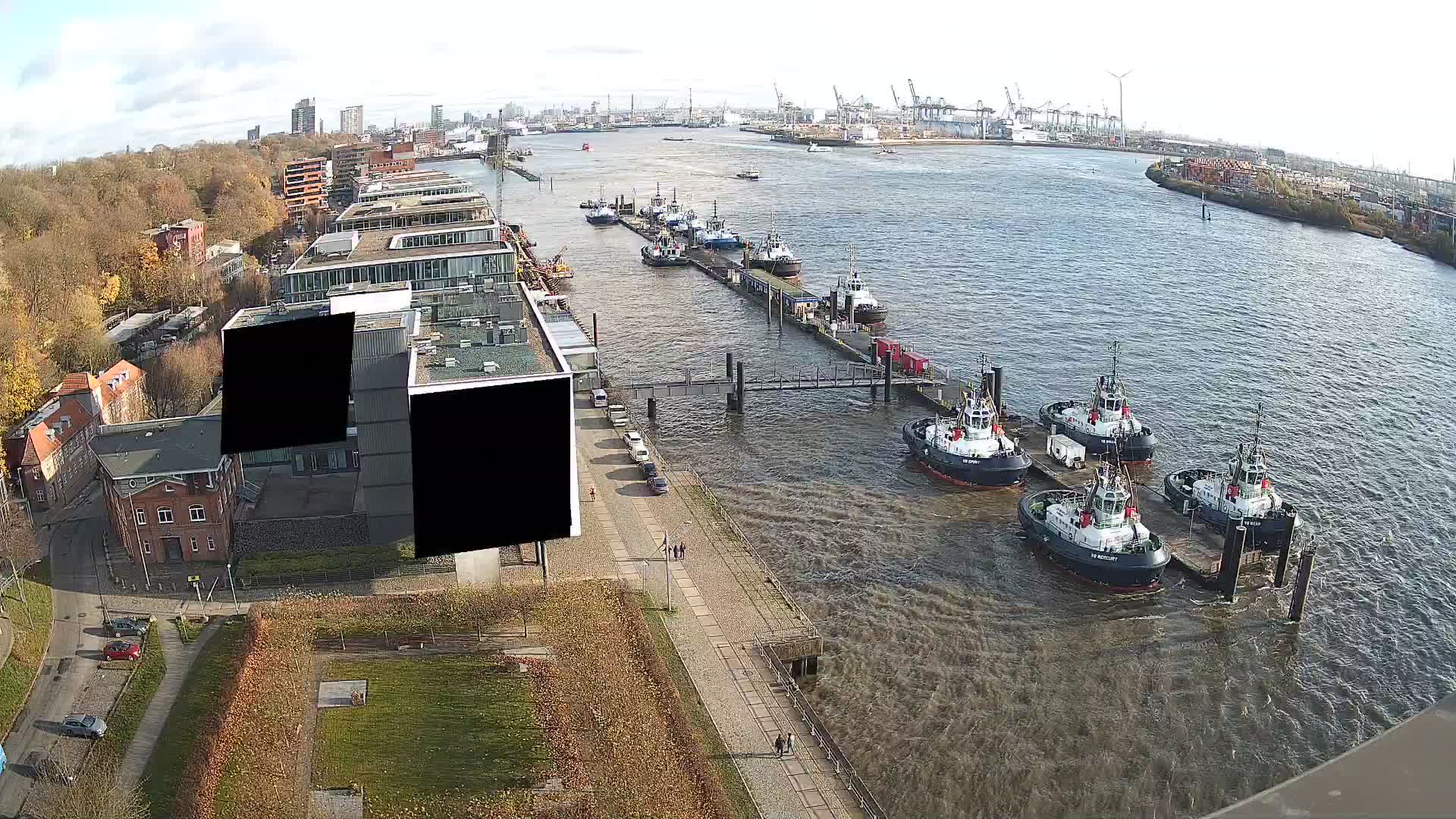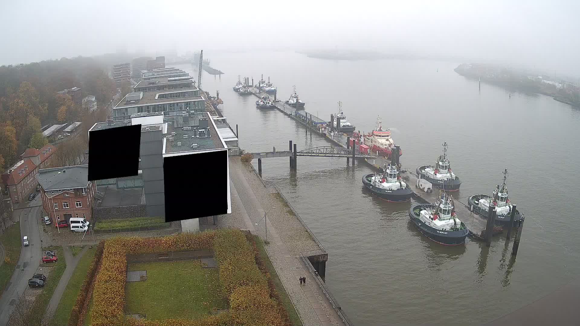 Hamburg, Deutschland - 24.1 km von Achterndiek: Hamburg Övelgönne Richtung Osten - Die Webcam Richtung Osten zeigt vom Augustinum die eigentlichen Hafeneinfahrten. Hier werden alle 'Riesen-Pötte', die nicht schon vorher angelegt haben, vorbeifahren, um zu ihrem Dock zu fahren. Eine Reihe von Schleppern steht für Andockmanöver bereit.