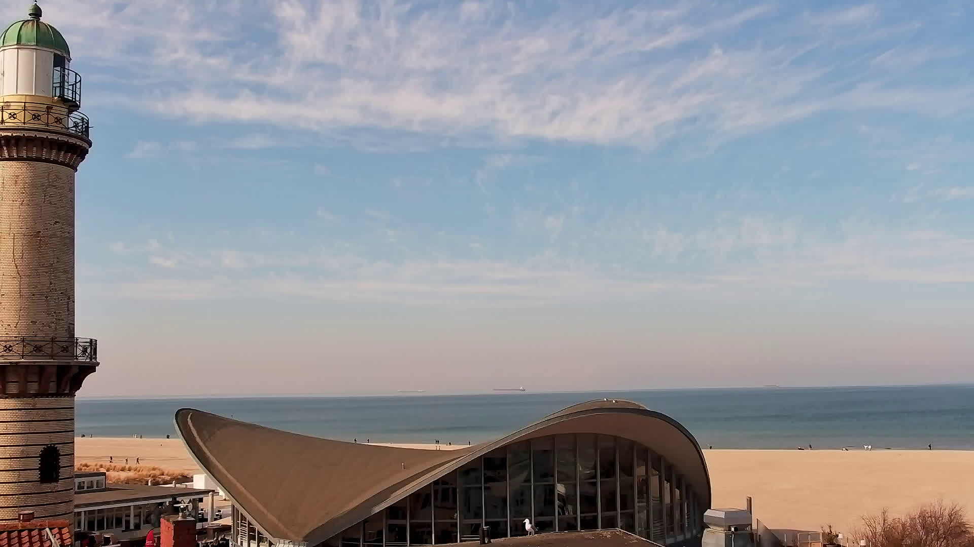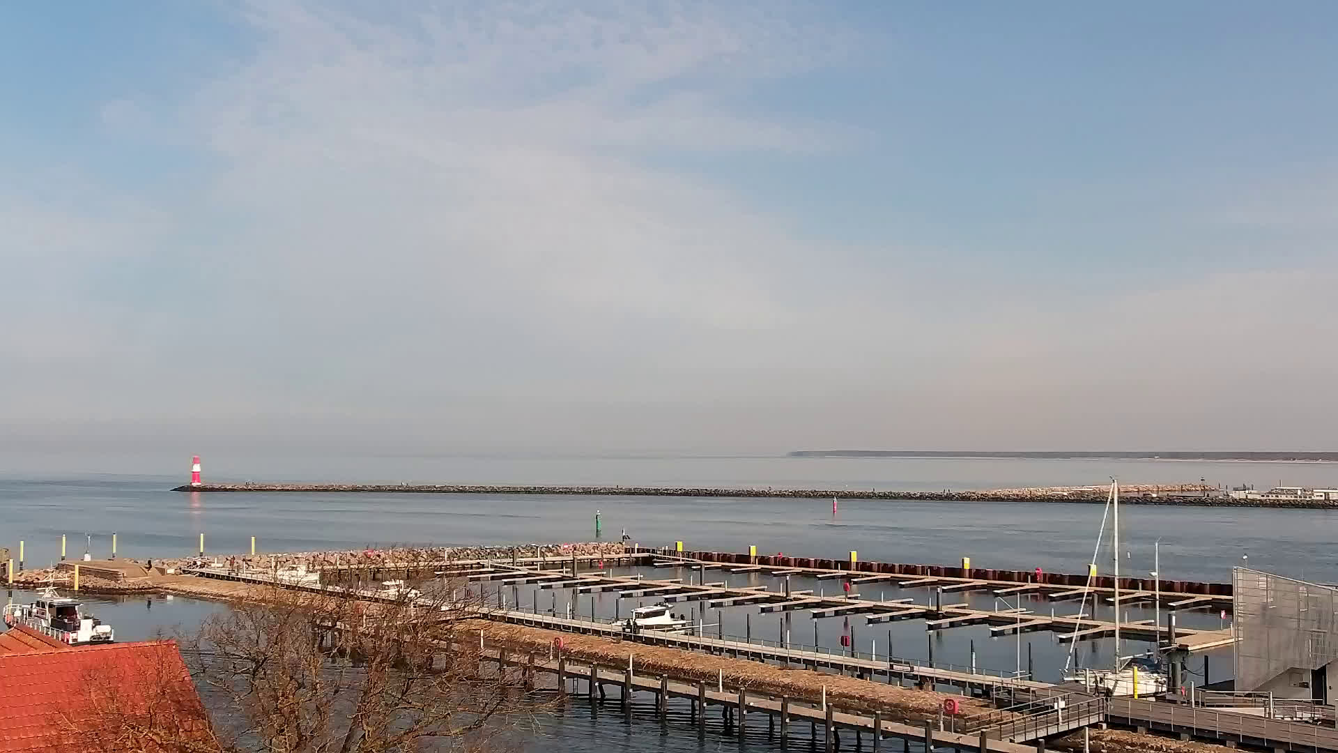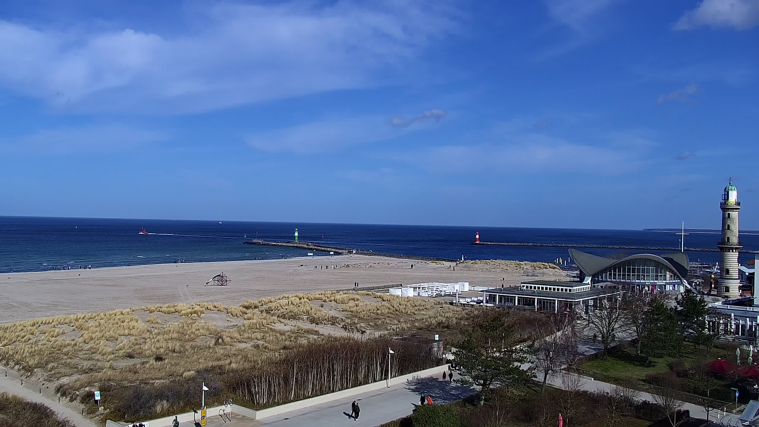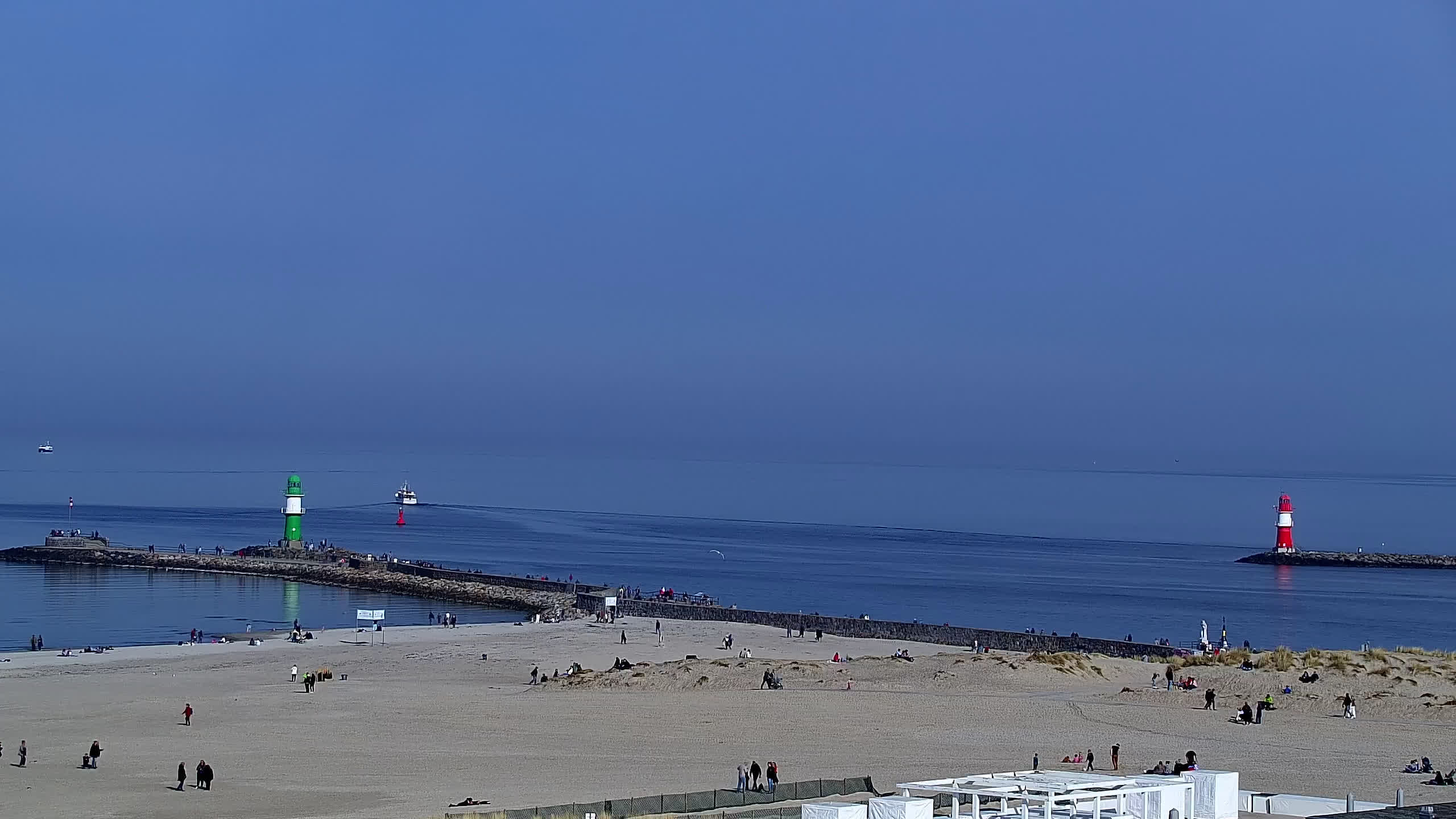 Warnemünde, Deutschland - 7.3 km von Admannshagen: Alter Strom Warnemünde - HD Streaming Kamera am 'Alten Strom' in Warnemünde bei Rostock an der Ostsee. Im Hintergrund die belebte Hafeneinfahrt des Rostocker Fähr- und Containerhafens. Fähren nach Dänemark, Schweden und alle Baltischen Anreihnerstaaten kommern regelmäßig vorbei. Im Vordergrund der 'Alte Strom' von Warnemünde mit seinen kleinen Fischerbooten, Fischmarkt auf der Mittelmole und der Probmenade. Als Bonus gibts Livewetter in Echtzeit im Videoplayer. Powered by Livespotting.tv in HD Qualität.