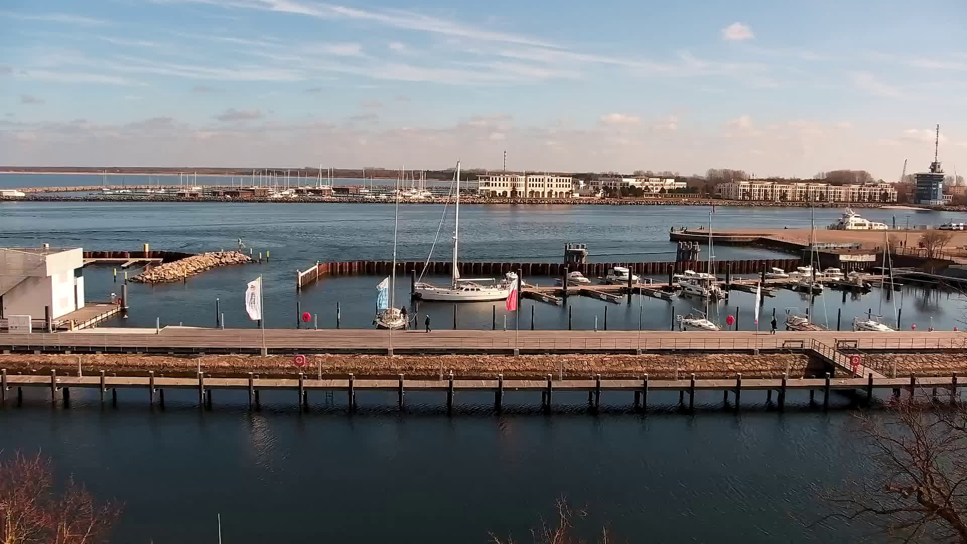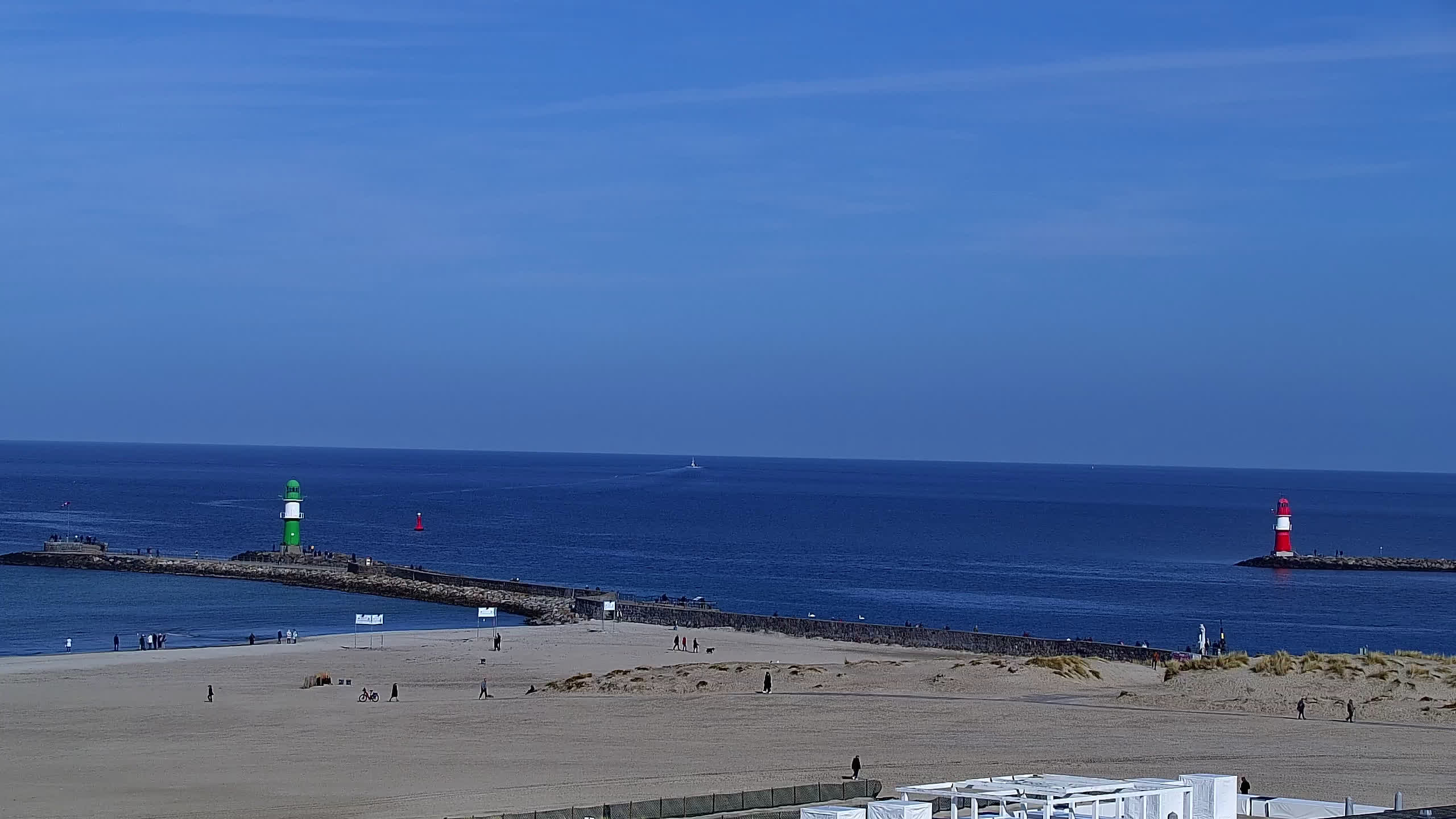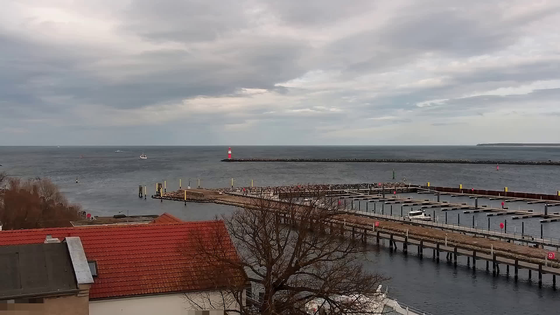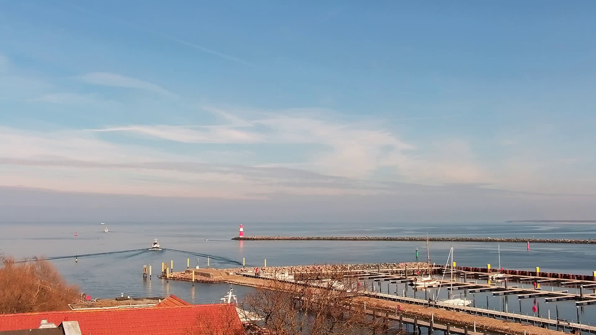 Warnemünde, Deutschland - 7.3 km von Admannshagen: Alter Strom Warnemünde - HD Streaming Kamera am 'Alten Strom' in Warnemünde bei Rostock an der Ostsee. Im Hintergrund die belebte Hafeneinfahrt des Rostocker Fähr- und Containerhafens. Fähren nach Dänemark, Schweden und alle Baltischen Anreihnerstaaten kommern regelmäßig vorbei. Im Vordergrund der 'Alte Strom' von Warnemünde mit seinen kleinen Fischerbooten, Fischmarkt auf der Mittelmole und der Probmenade. Als Bonus gibts Livewetter in Echtzeit im Videoplayer. Powered by Livespotting.tv in HD Qualität.