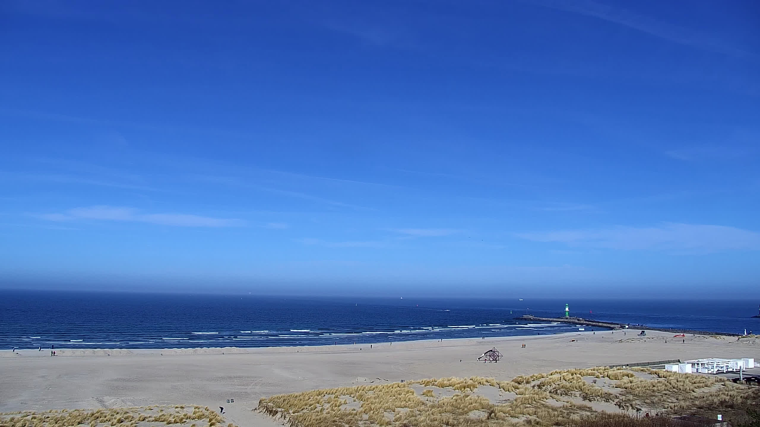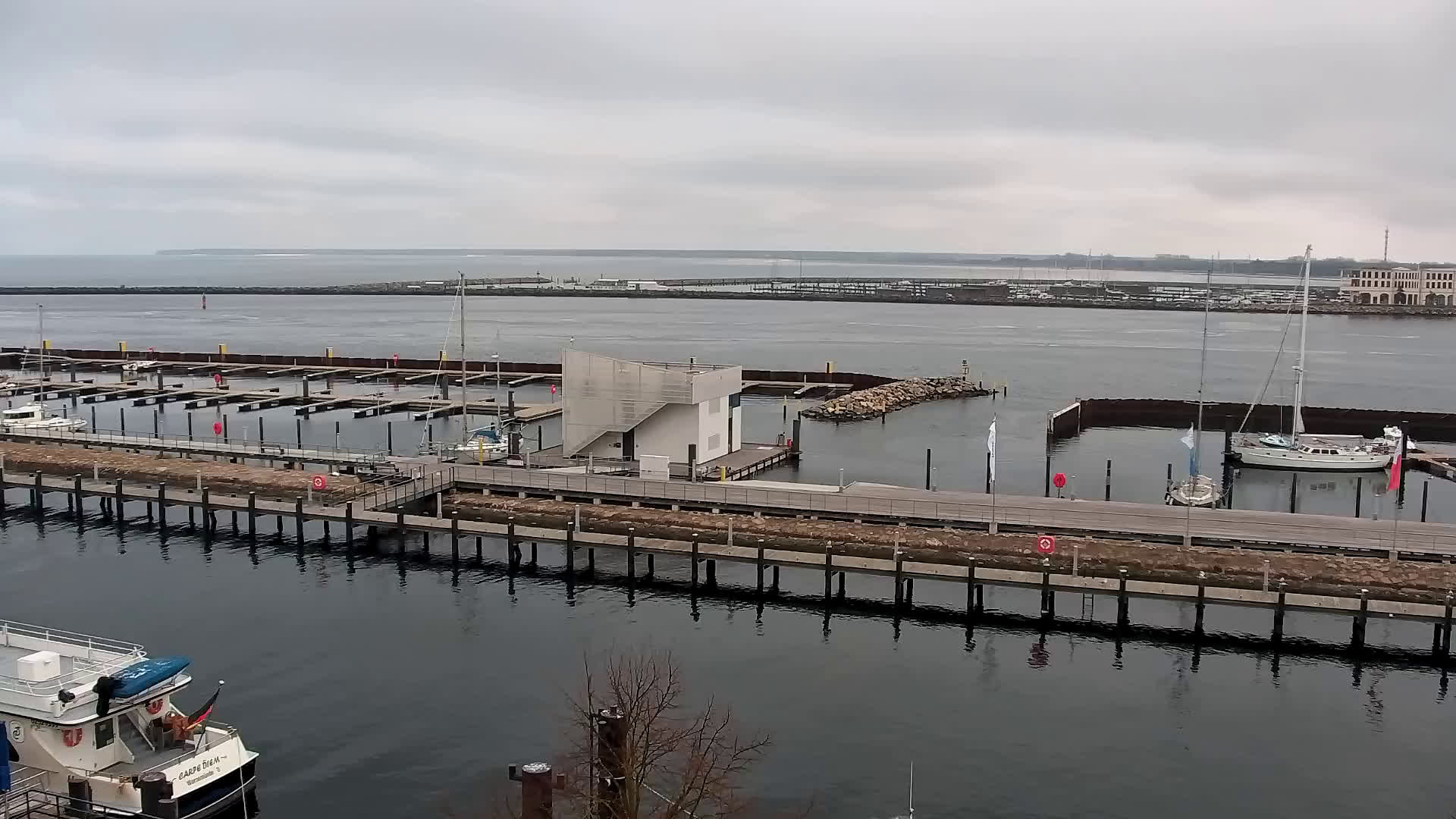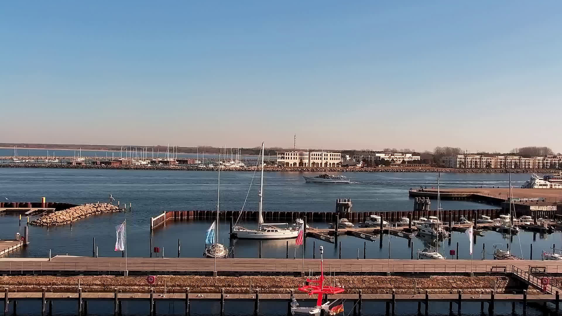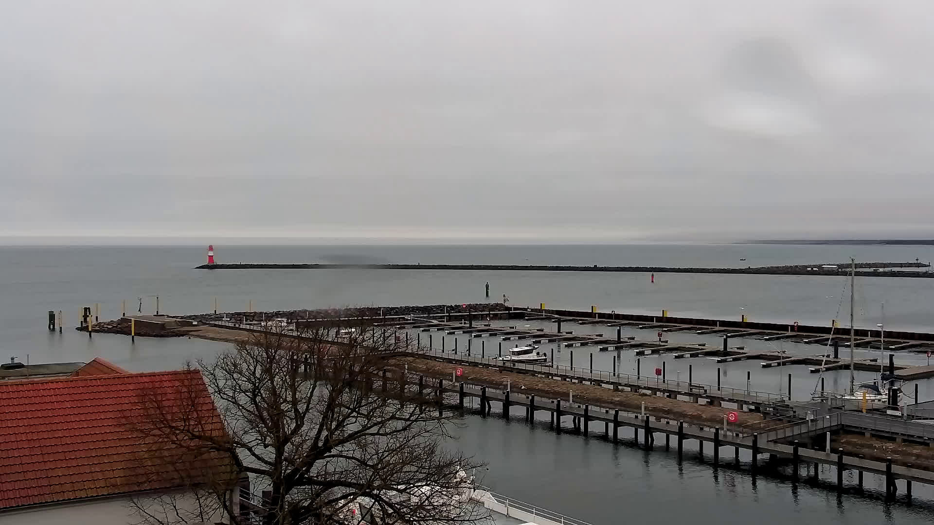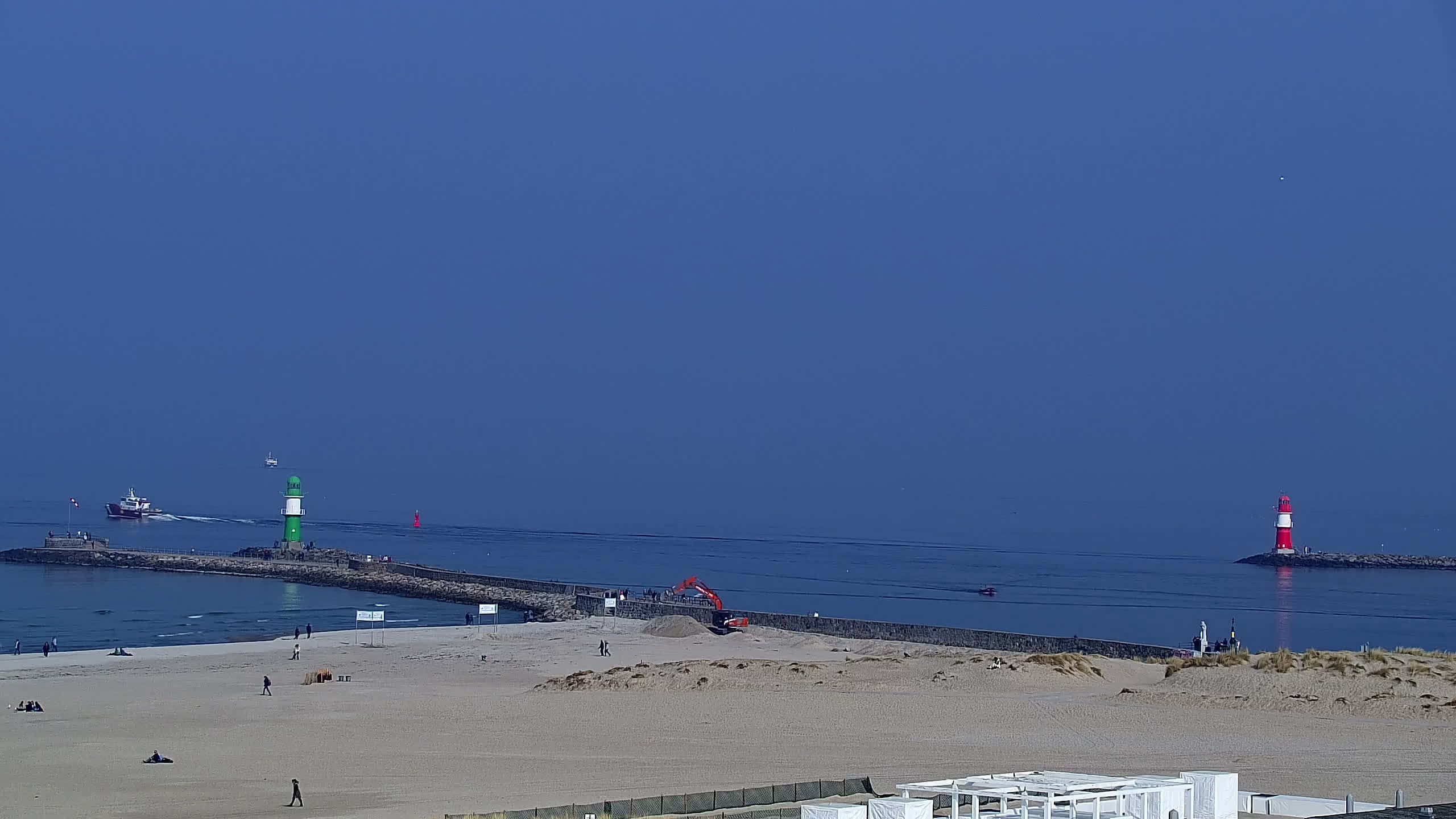 Warnemünde, Deutschland - 7.3 km von Admannshagen: Alter Strom Warnemünde - HD Streaming Kamera am 'Alten Strom' in Warnemünde bei Rostock an der Ostsee. Im Hintergrund die belebte Hafeneinfahrt des Rostocker Fähr- und Containerhafens. Fähren nach Dänemark, Schweden und alle Baltischen Anreihnerstaaten kommern regelmäßig vorbei. Im Vordergrund der 'Alte Strom' von Warnemünde mit seinen kleinen Fischerbooten, Fischmarkt auf der Mittelmole und der Probmenade. Als Bonus gibts Livewetter in Echtzeit im Videoplayer. Powered by Livespotting.tv in HD Qualität.