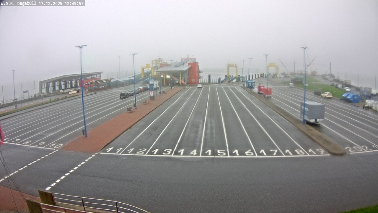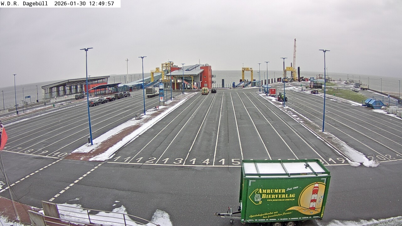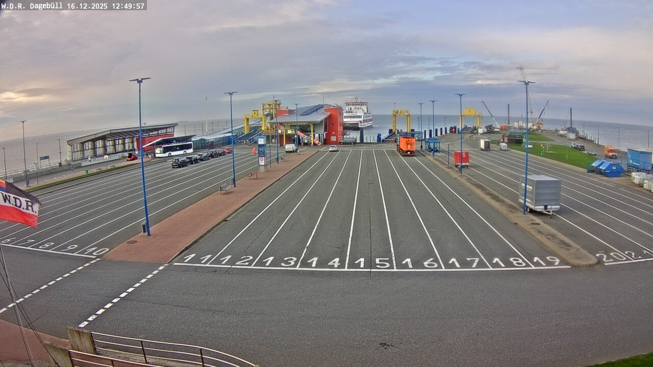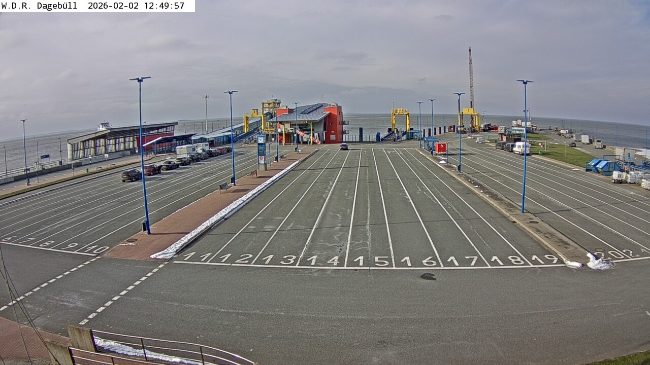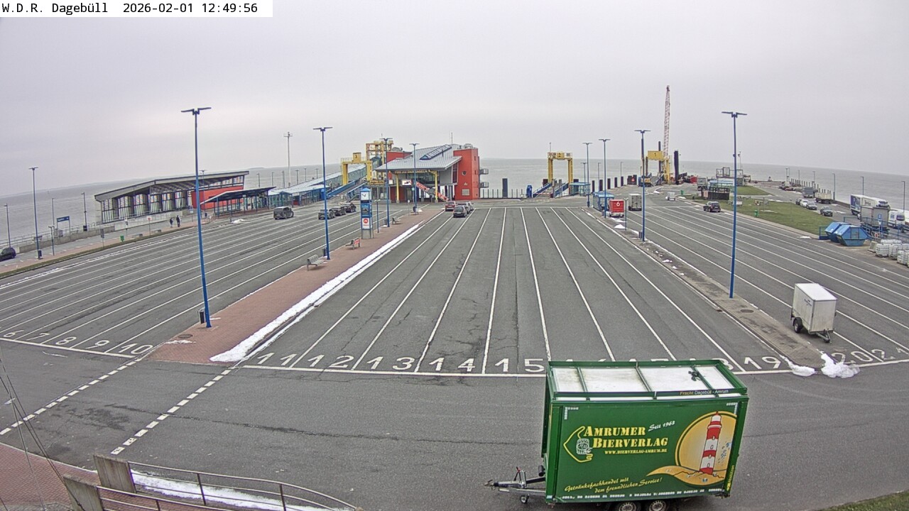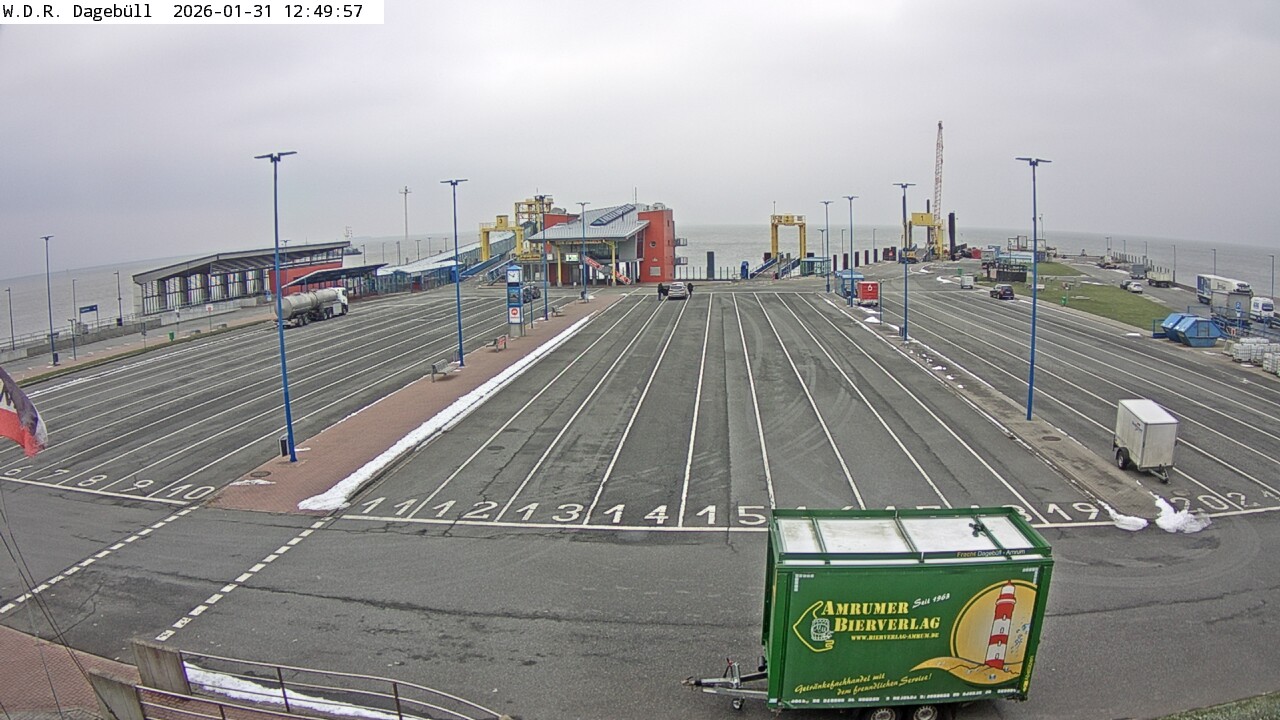Dagebüll, Deutschland - 25.8 km von Almdorf: Dagebüll Hafen - Blick in Richtung Westen auf die Verladung des Fährverkehrs zu den Inseln Föhr und Amrum, links im Bild der Bahnsteig, Fahrzeugaufstellspuren, Wartegbäude 'Tor zu den Inseln'.