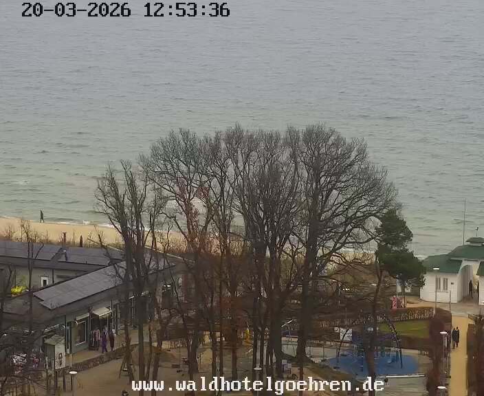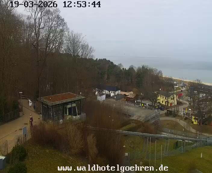Göhren (Rügen), Deutschland - 3.6 km von Alt Reddevitz: Webcam Göhren Panorama - Panoramakamera von oberhalb des Schrägaufzugs in Göhren auf die Bernsteinpromenade, den Strand und die Seebrücke von Göhren.