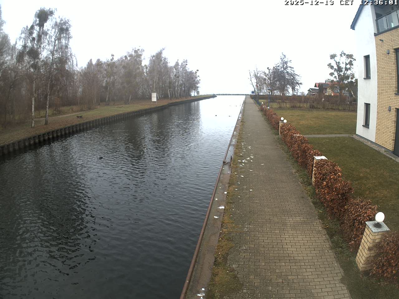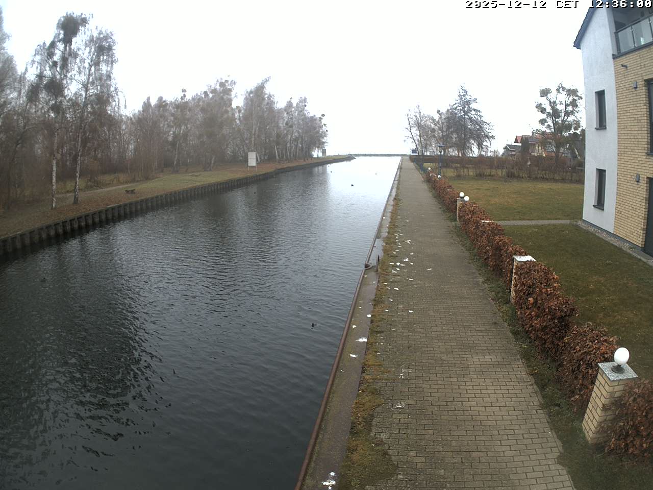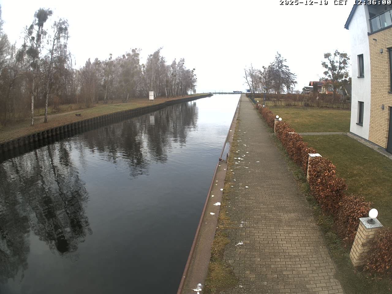 Rechlin, Deutschland - 48.7 km von Alt Samitz: Webcam Hafendorf Müritz - Mit dieser Webcam sehen Sie die Ausfahrt aus der Marina Müritz. Der sogenannte Stichkanal ist etwa 180 Meter lang und verbindet den Claassee mit der Müritz.