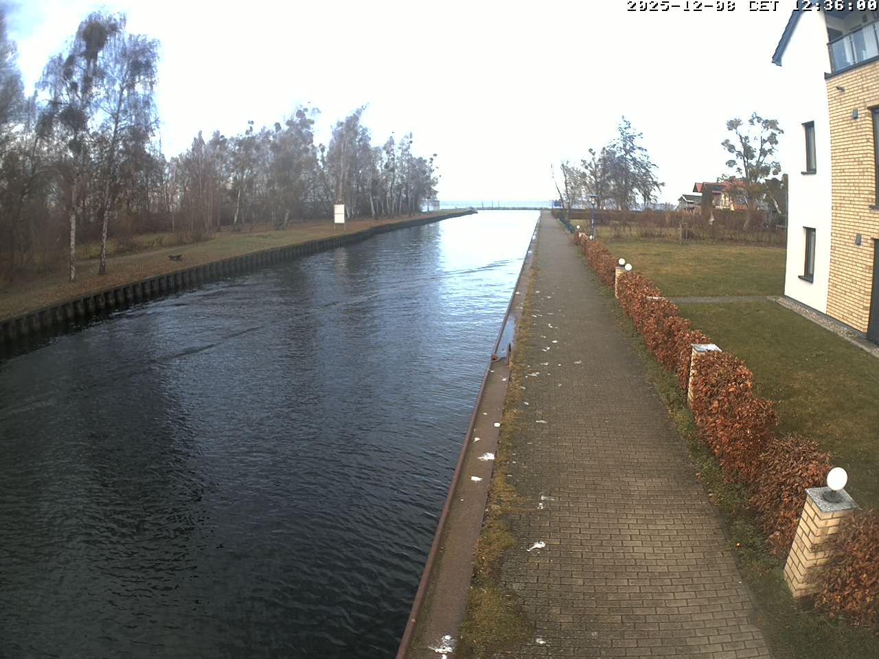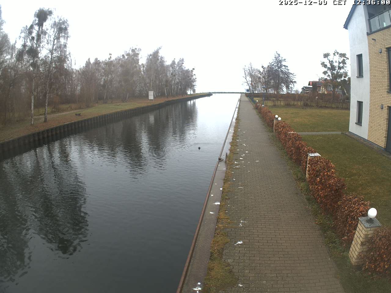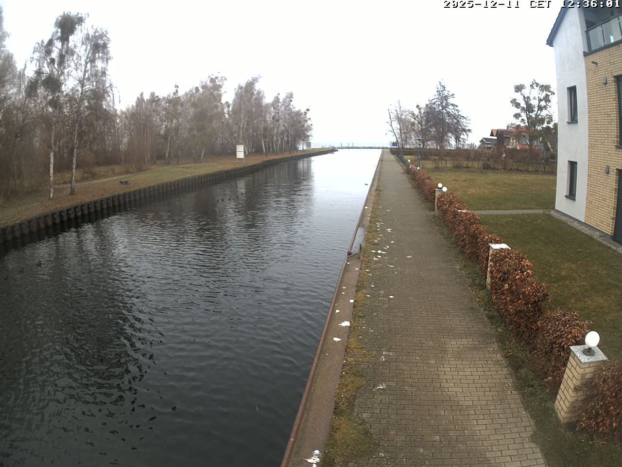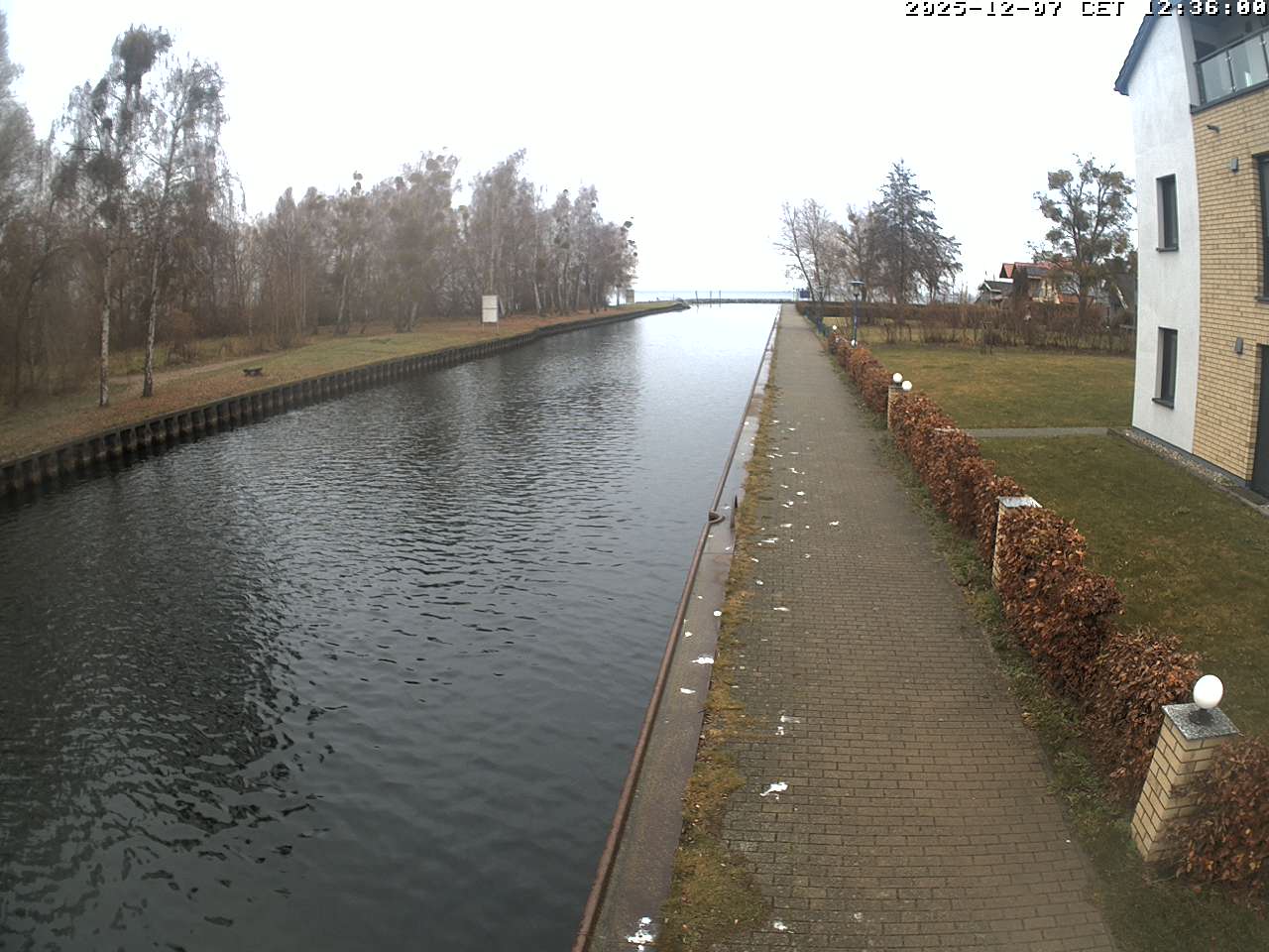 Rechlin, Deutschland - 48.7 km von Alt Samitz: Webcam Hafendorf Müritz - Mit dieser Webcam sehen Sie die Ausfahrt aus der Marina Müritz. Der sogenannte Stichkanal ist etwa 180 Meter lang und verbindet den Claassee mit der Müritz.