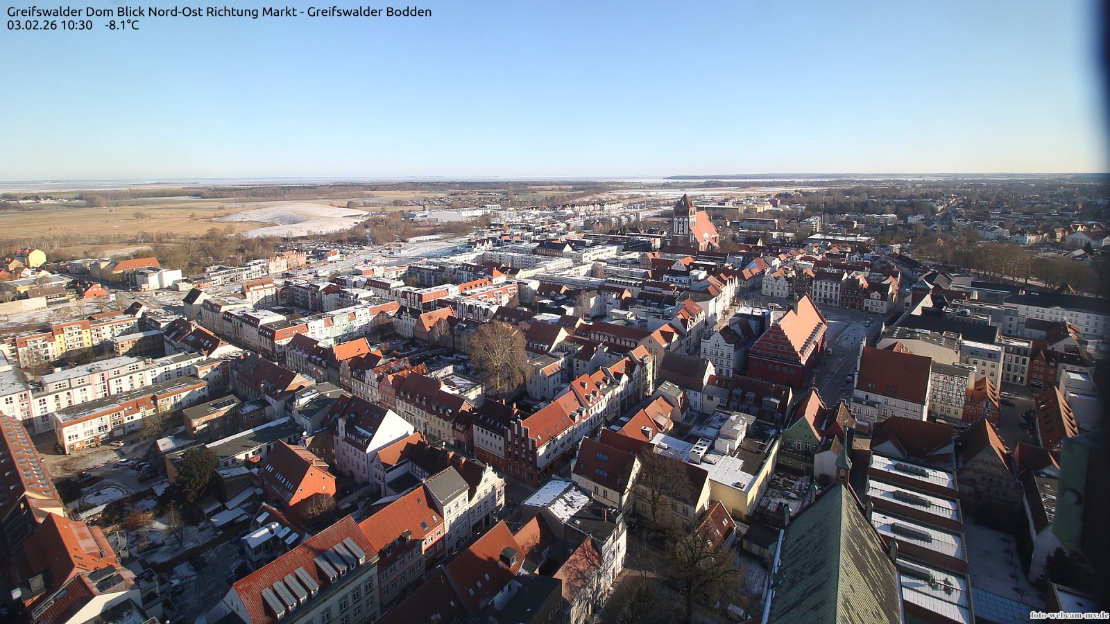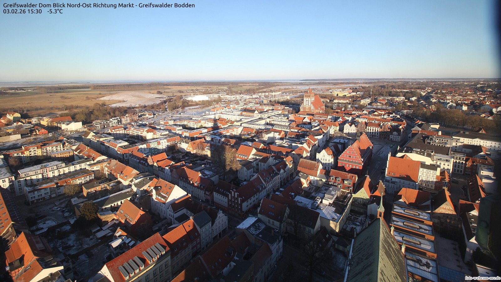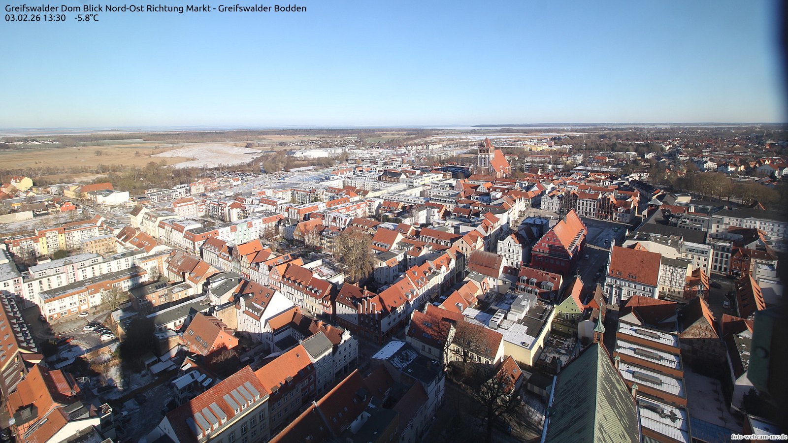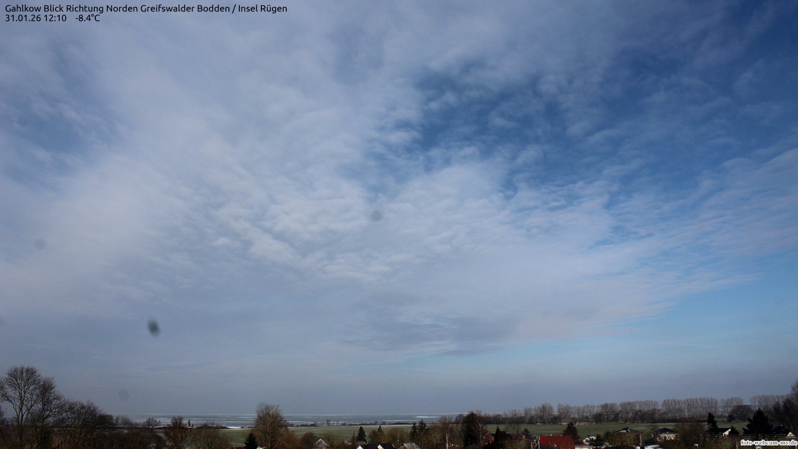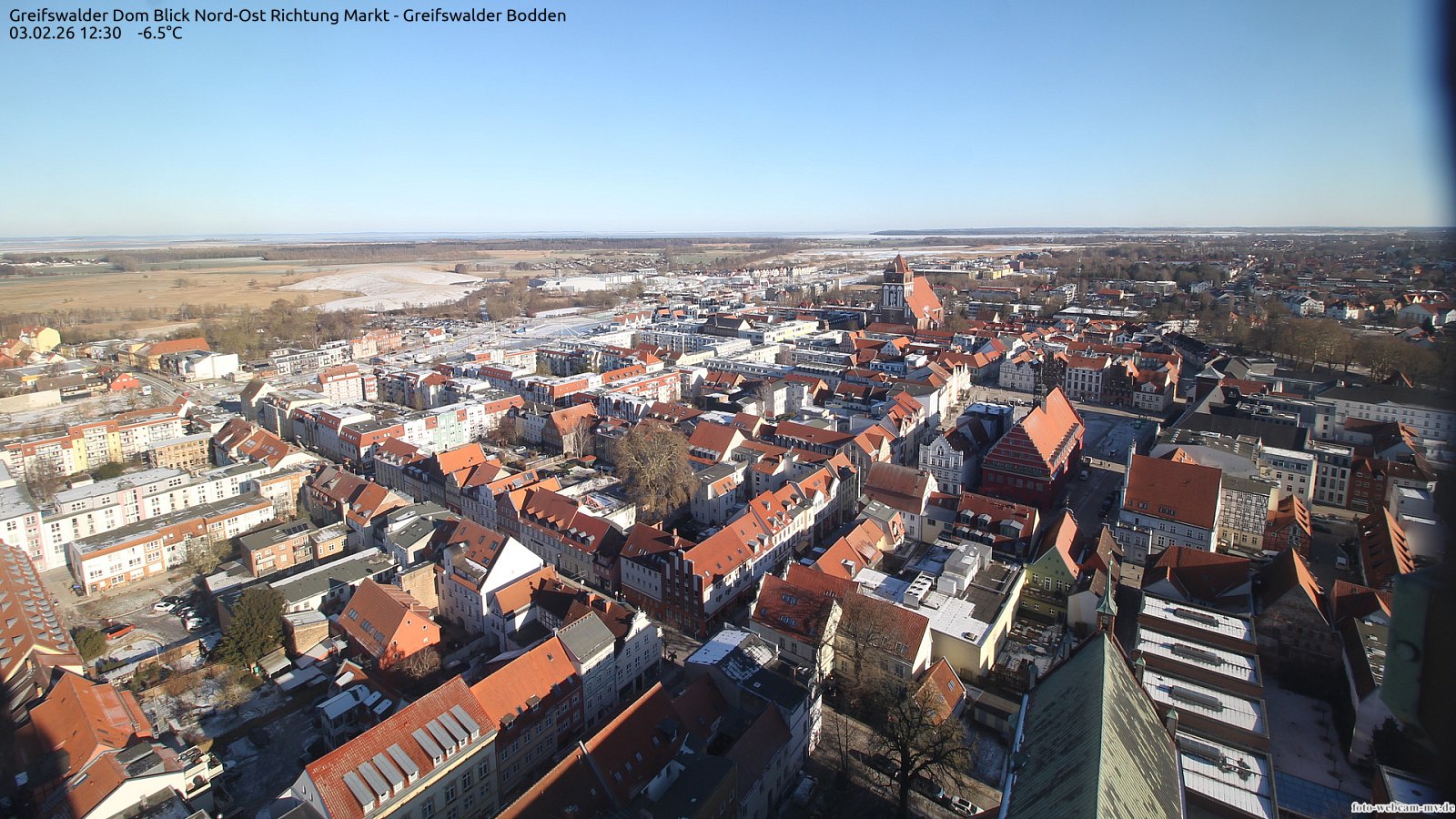 Usedom, Deutschland - 21.8 km von Alt Teterin: Blick Richtung Peenestrom - Die Webcam befindet sich in der Stadt Usedom. Angebracht ist sie in Höhe des Uhrwerkes der Marienkirche. Die Blickrichtung ist über den Dächern Usedoms hinweg in Richtung Peenestrom.