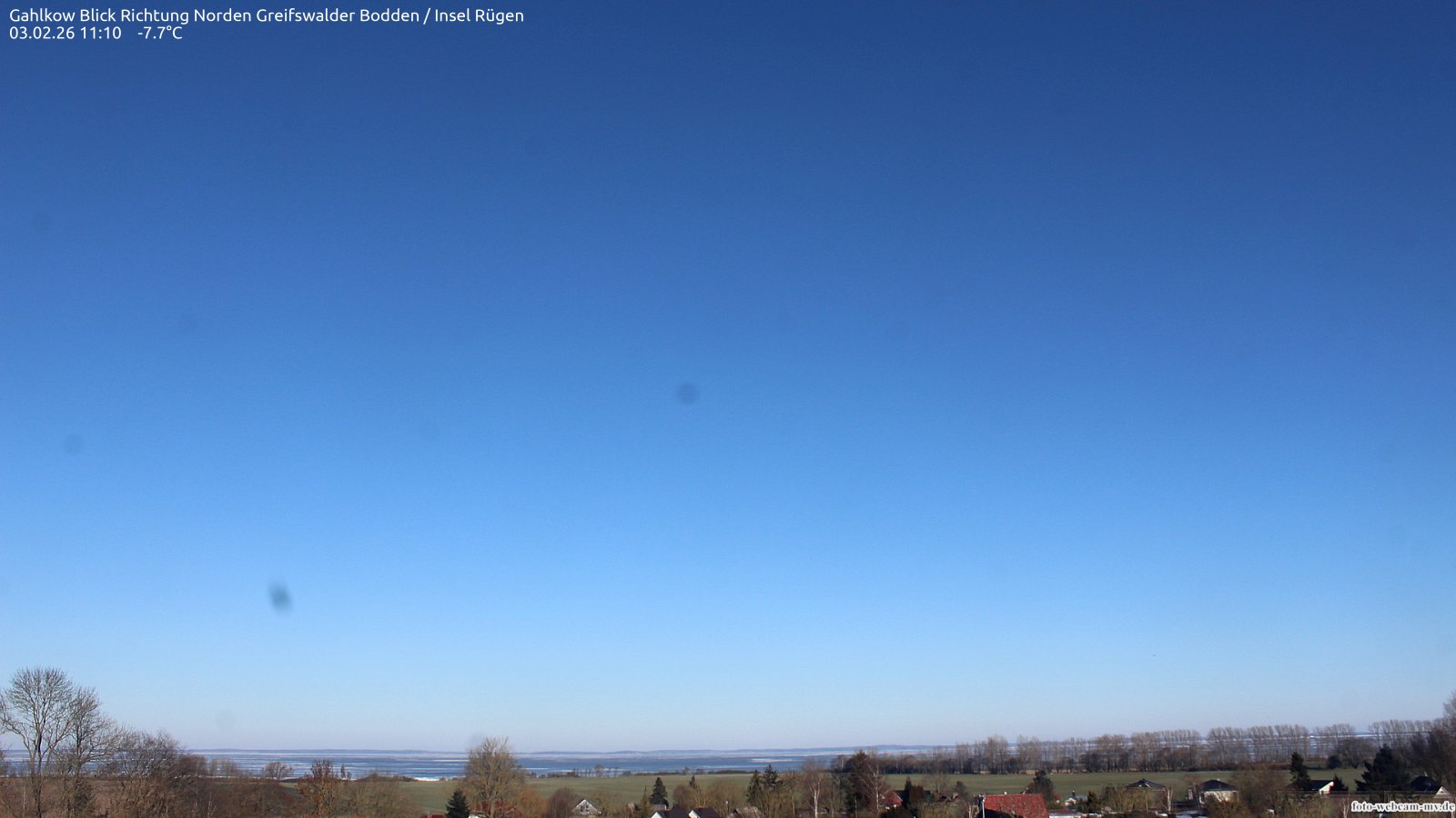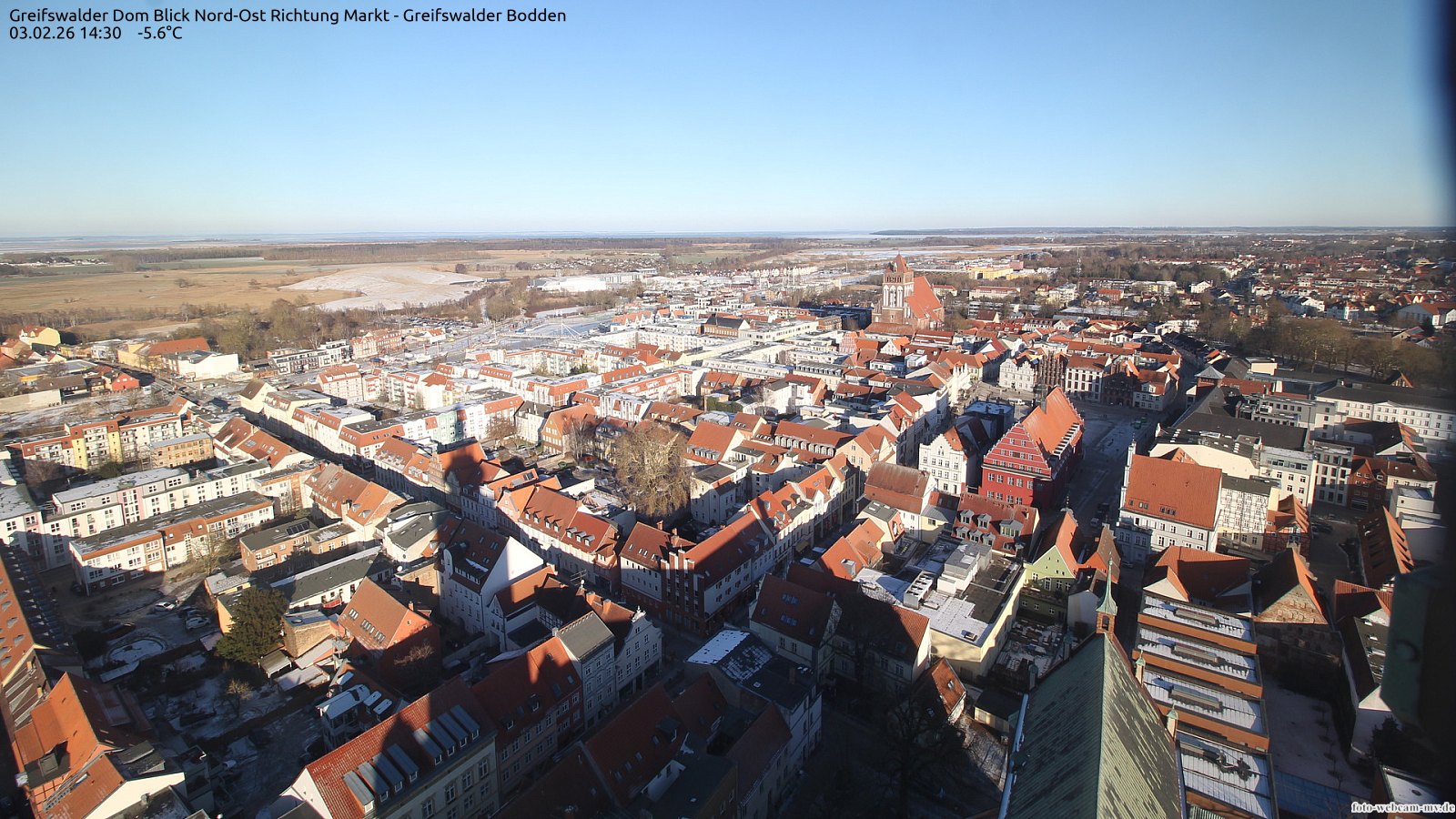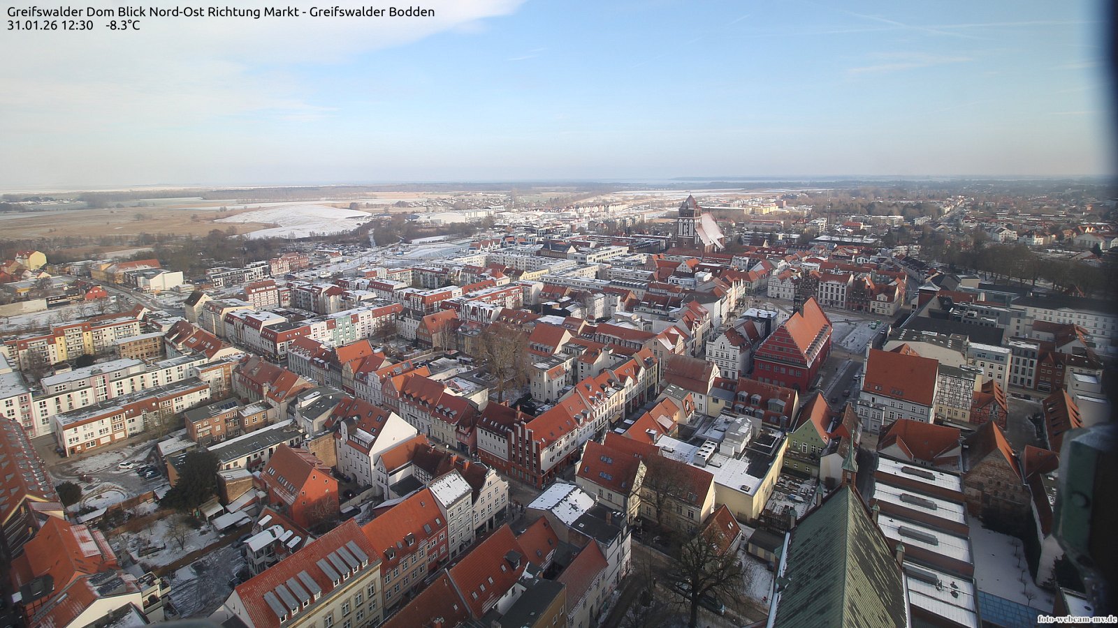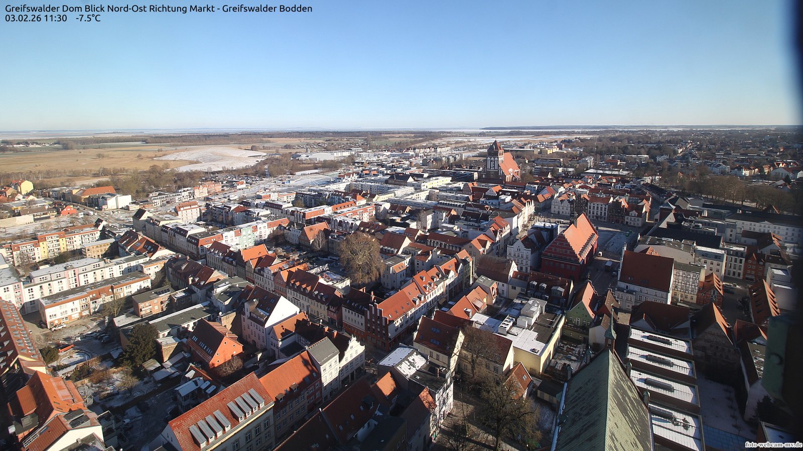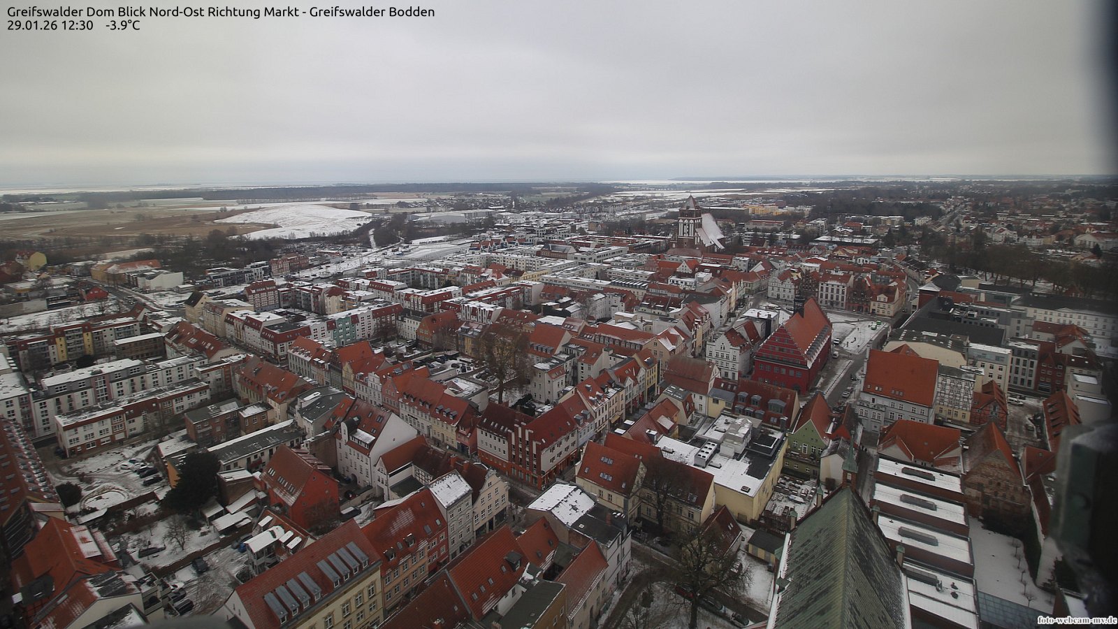 Usedom, Deutschland - 21.8 km von Alt Teterin: Blick Richtung Peenestrom - Die Webcam befindet sich in der Stadt Usedom. Angebracht ist sie in Höhe des Uhrwerkes der Marienkirche. Die Blickrichtung ist über den Dächern Usedoms hinweg in Richtung Peenestrom.