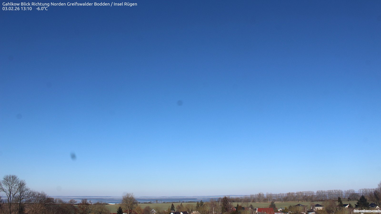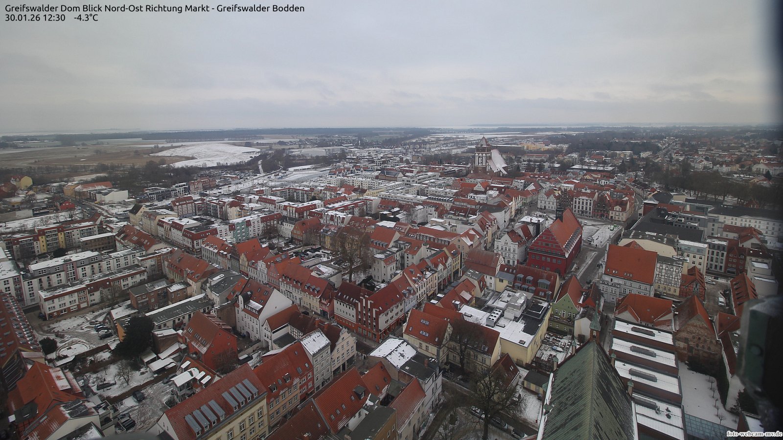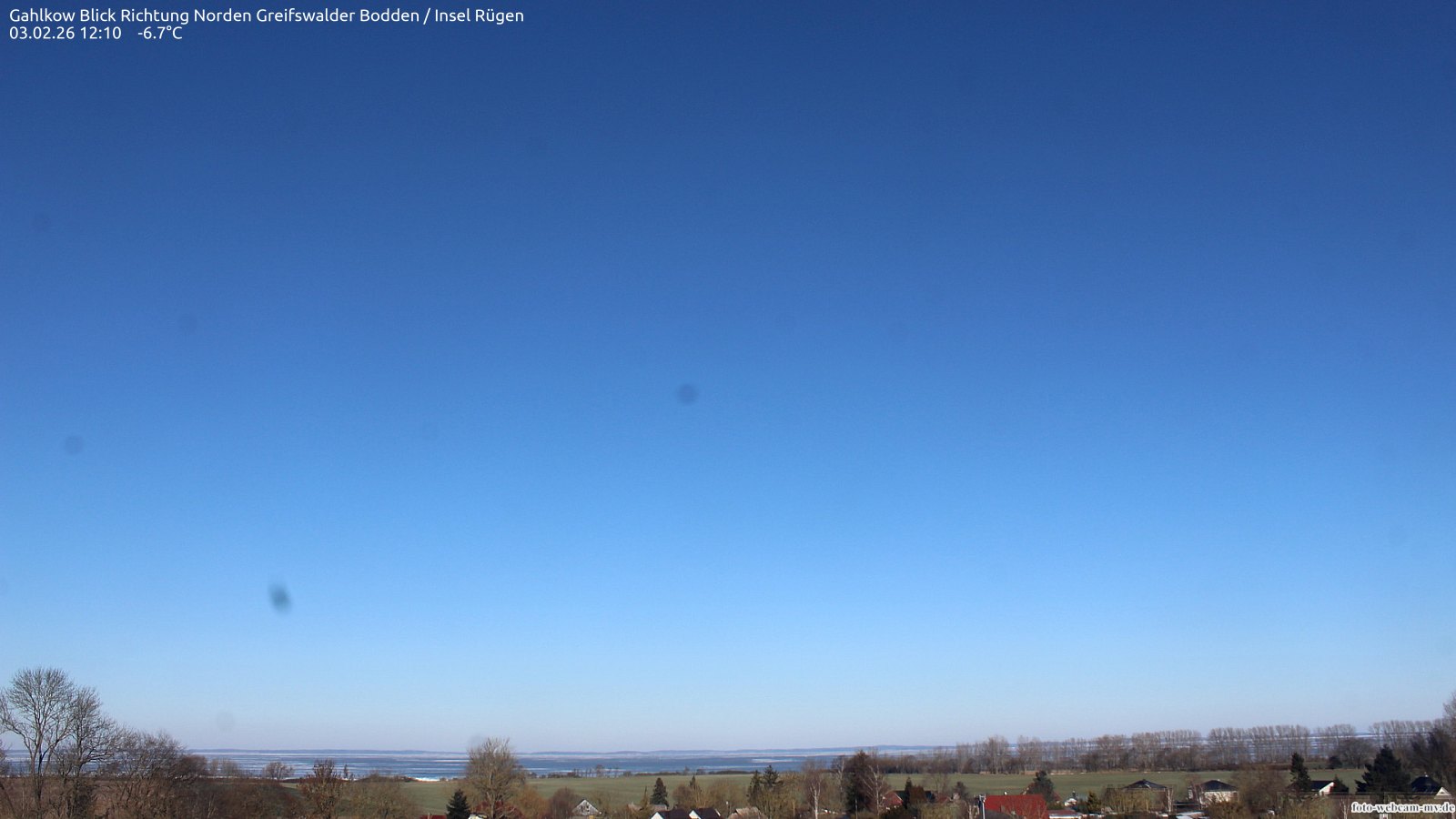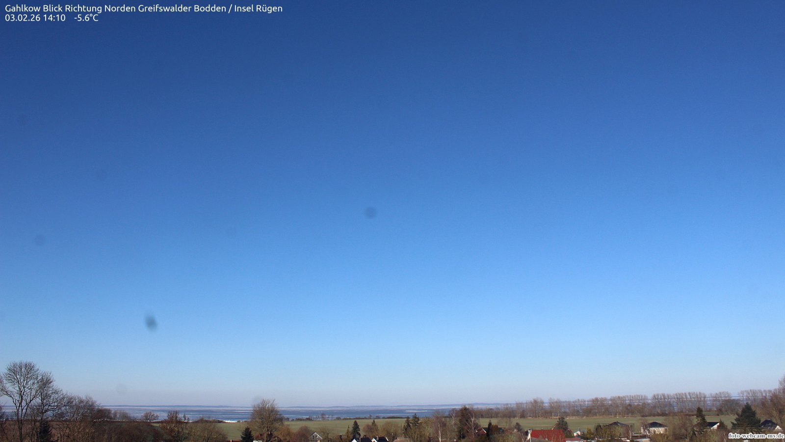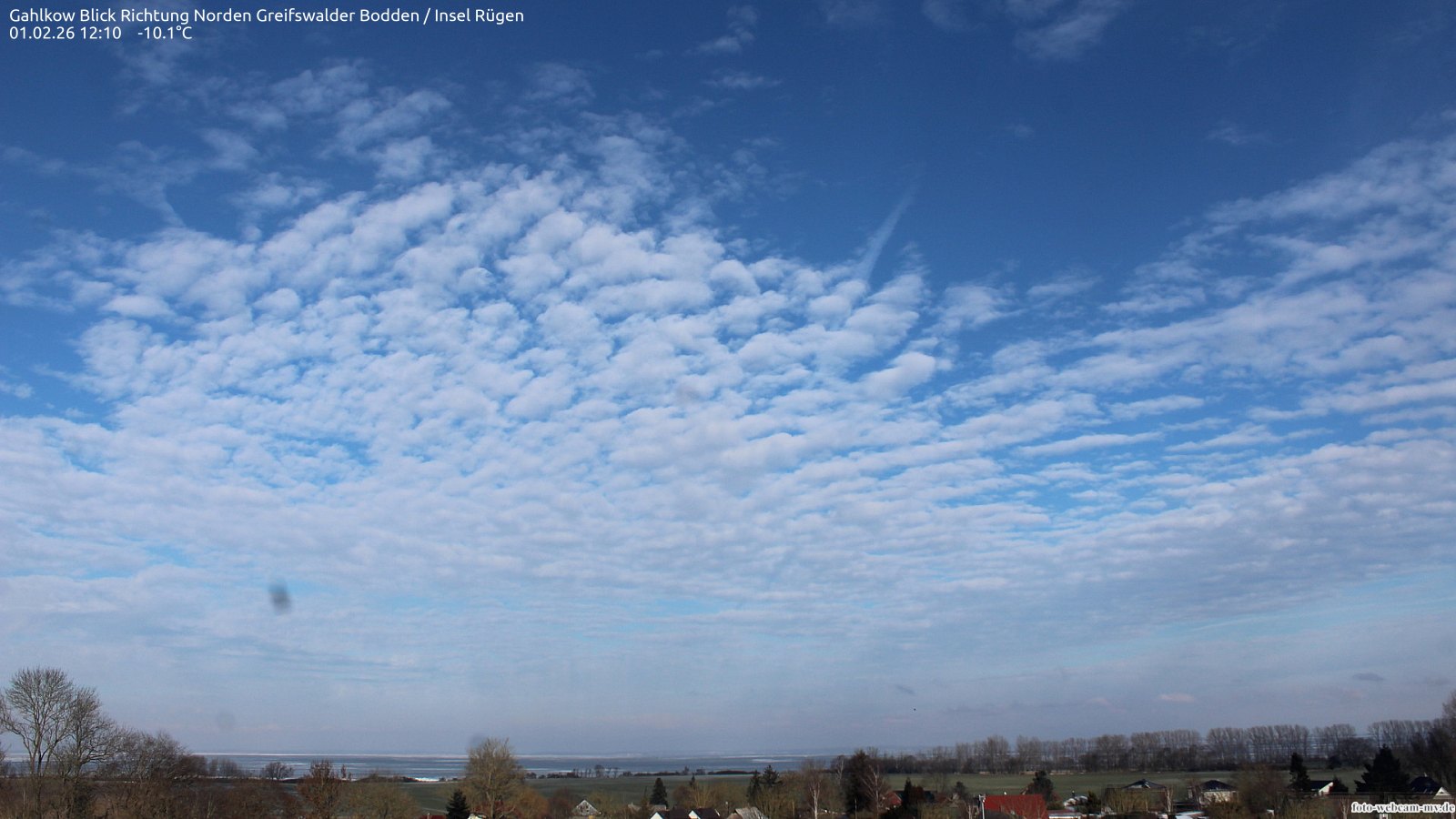 Usedom, Deutschland - 21.8 km von Alt Teterin: Blick Richtung Peenestrom - Die Webcam befindet sich in der Stadt Usedom. Angebracht ist sie in Höhe des Uhrwerkes der Marienkirche. Die Blickrichtung ist über den Dächern Usedoms hinweg in Richtung Peenestrom.
