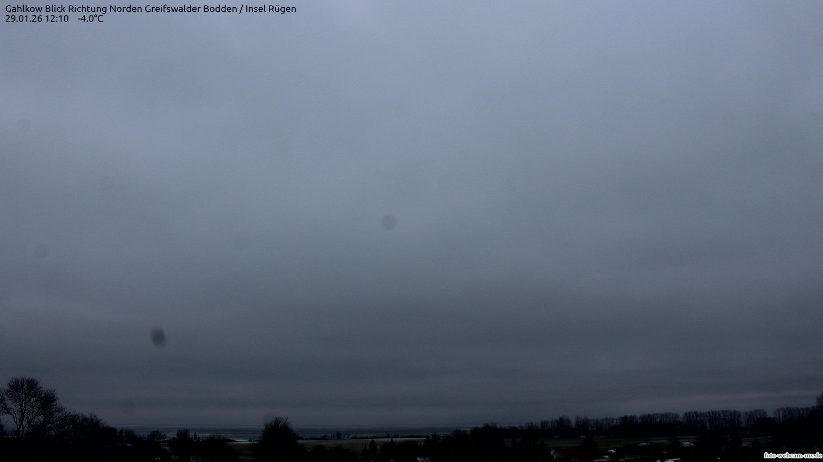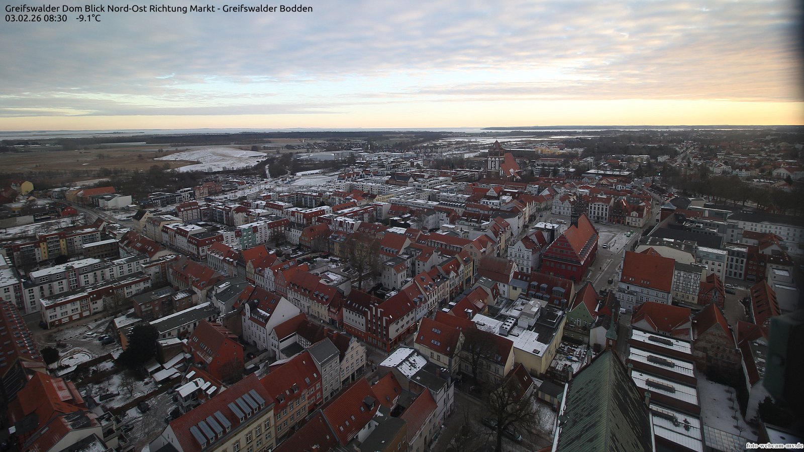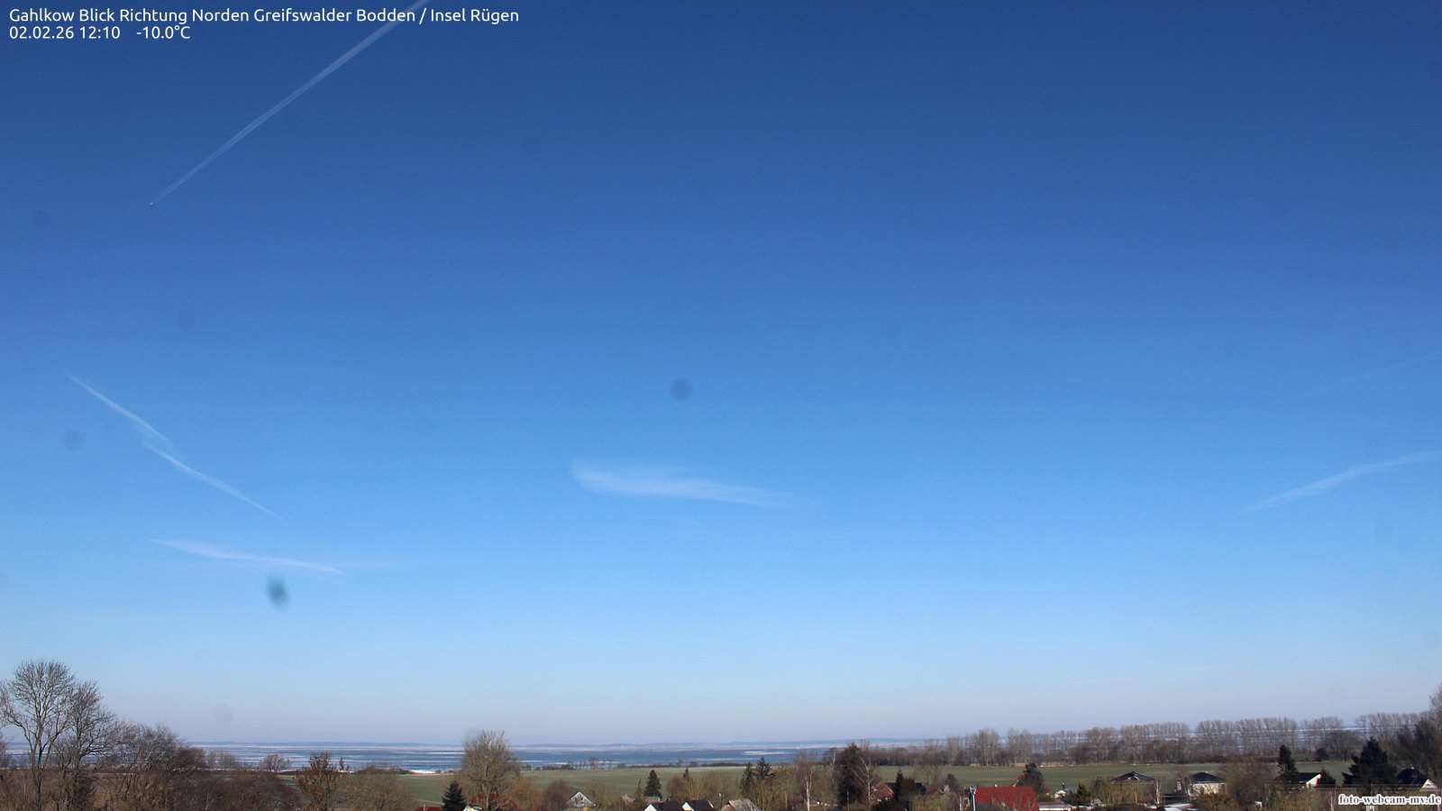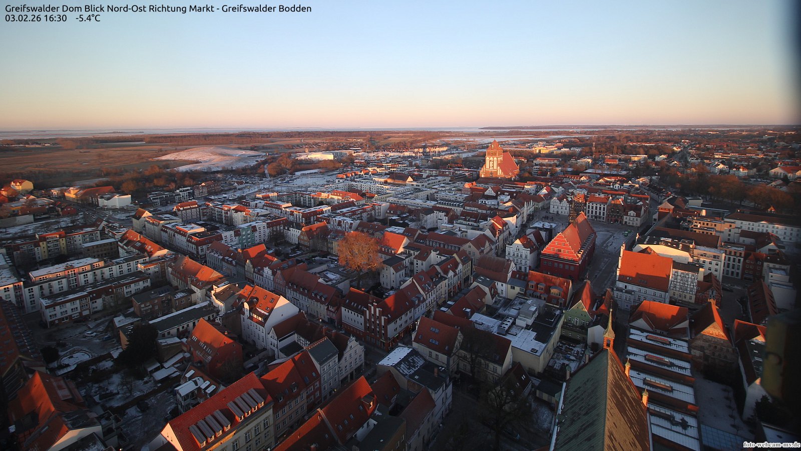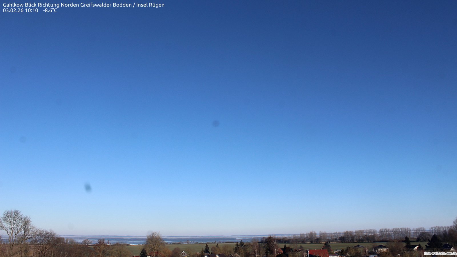 Usedom, Deutschland - 21.8 km von Alt Teterin: Blick Richtung Peenestrom - Die Webcam befindet sich in der Stadt Usedom. Angebracht ist sie in Höhe des Uhrwerkes der Marienkirche. Die Blickrichtung ist über den Dächern Usedoms hinweg in Richtung Peenestrom.