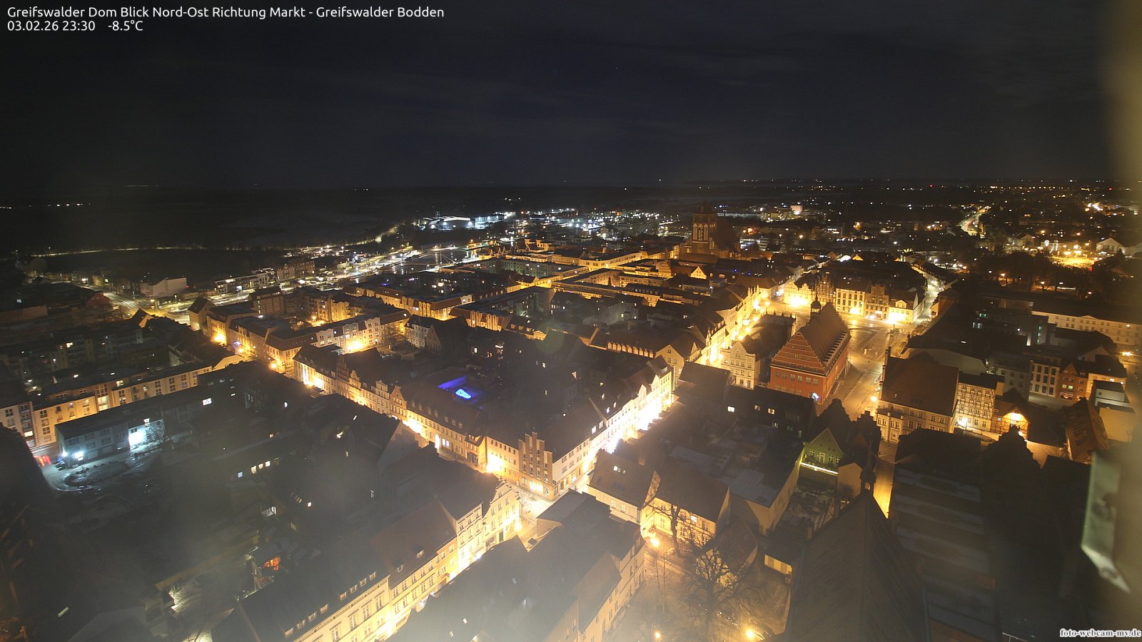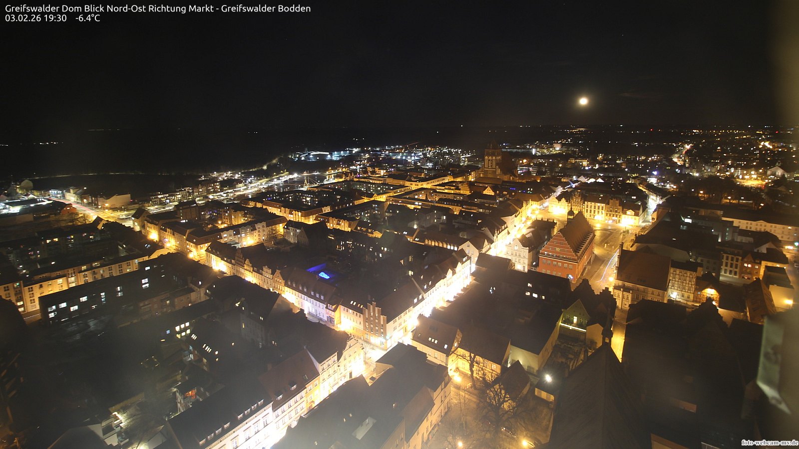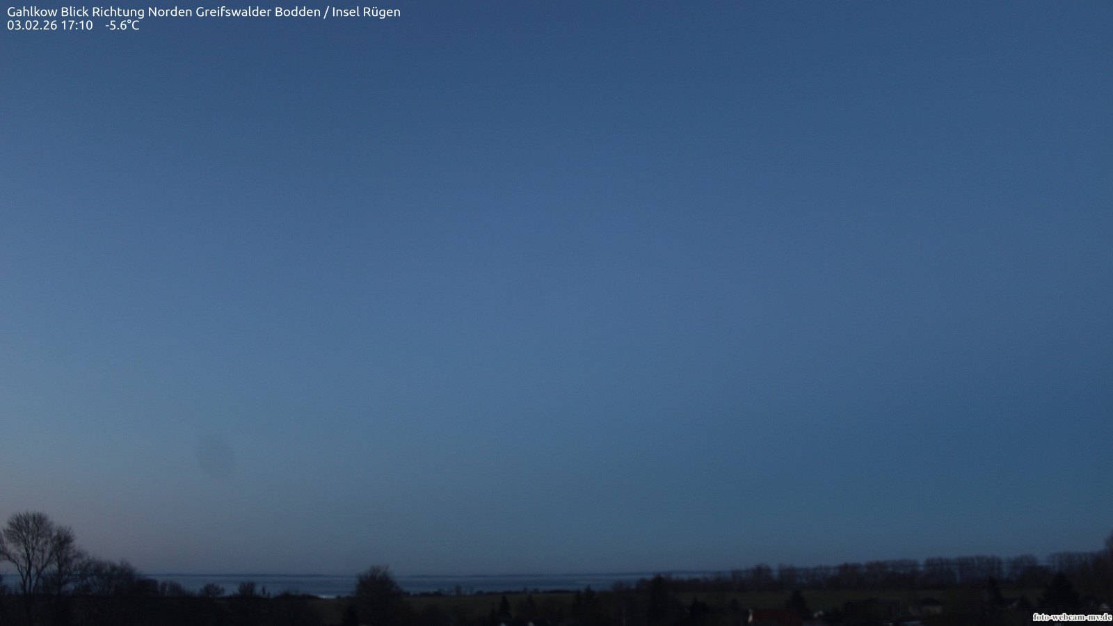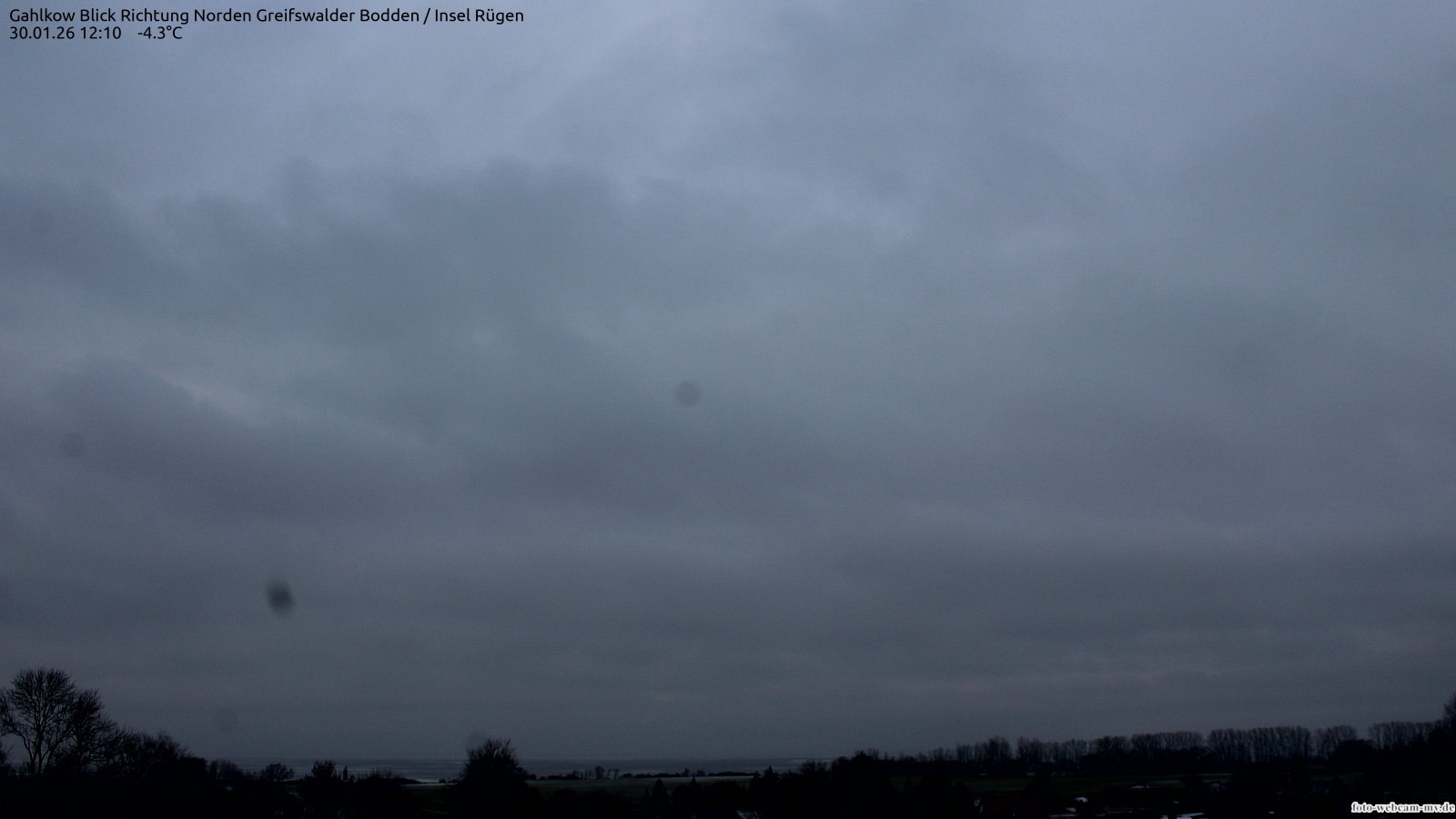 Usedom, Deutschland - 21.8 km von Alt Teterin: Blick Richtung Peenestrom - Die Webcam befindet sich in der Stadt Usedom. Angebracht ist sie in Höhe des Uhrwerkes der Marienkirche. Die Blickrichtung ist über den Dächern Usedoms hinweg in Richtung Peenestrom.