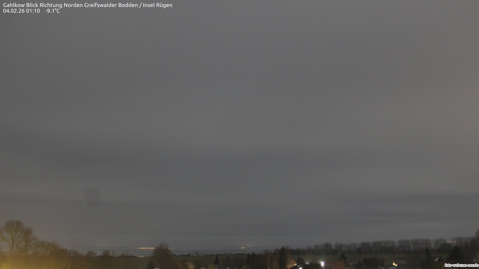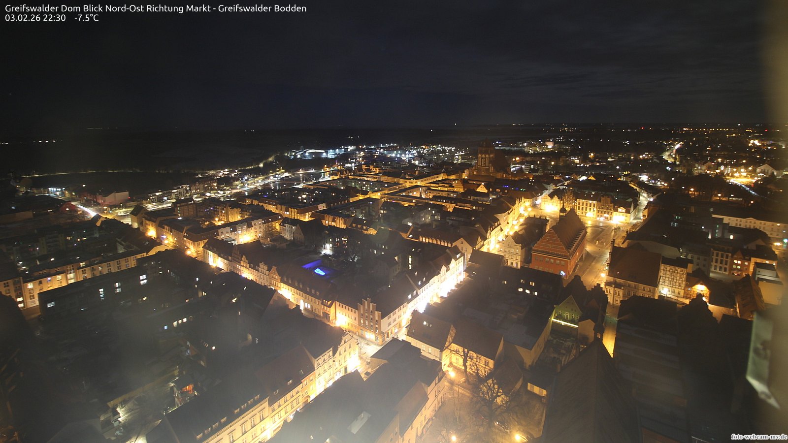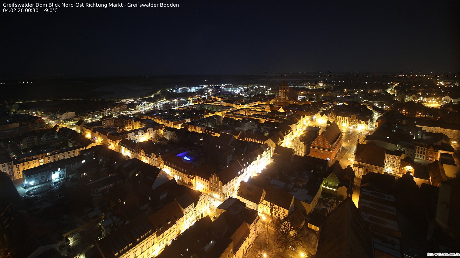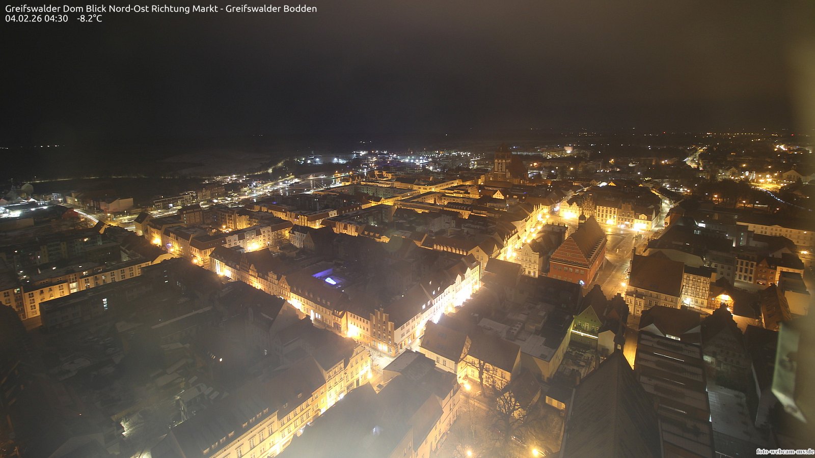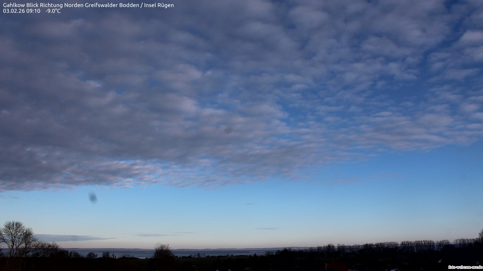 Usedom, Deutschland - 21.8 km von Alt Teterin: Blick Richtung Peenestrom - Die Webcam befindet sich in der Stadt Usedom. Angebracht ist sie in Höhe des Uhrwerkes der Marienkirche. Die Blickrichtung ist über den Dächern Usedoms hinweg in Richtung Peenestrom.