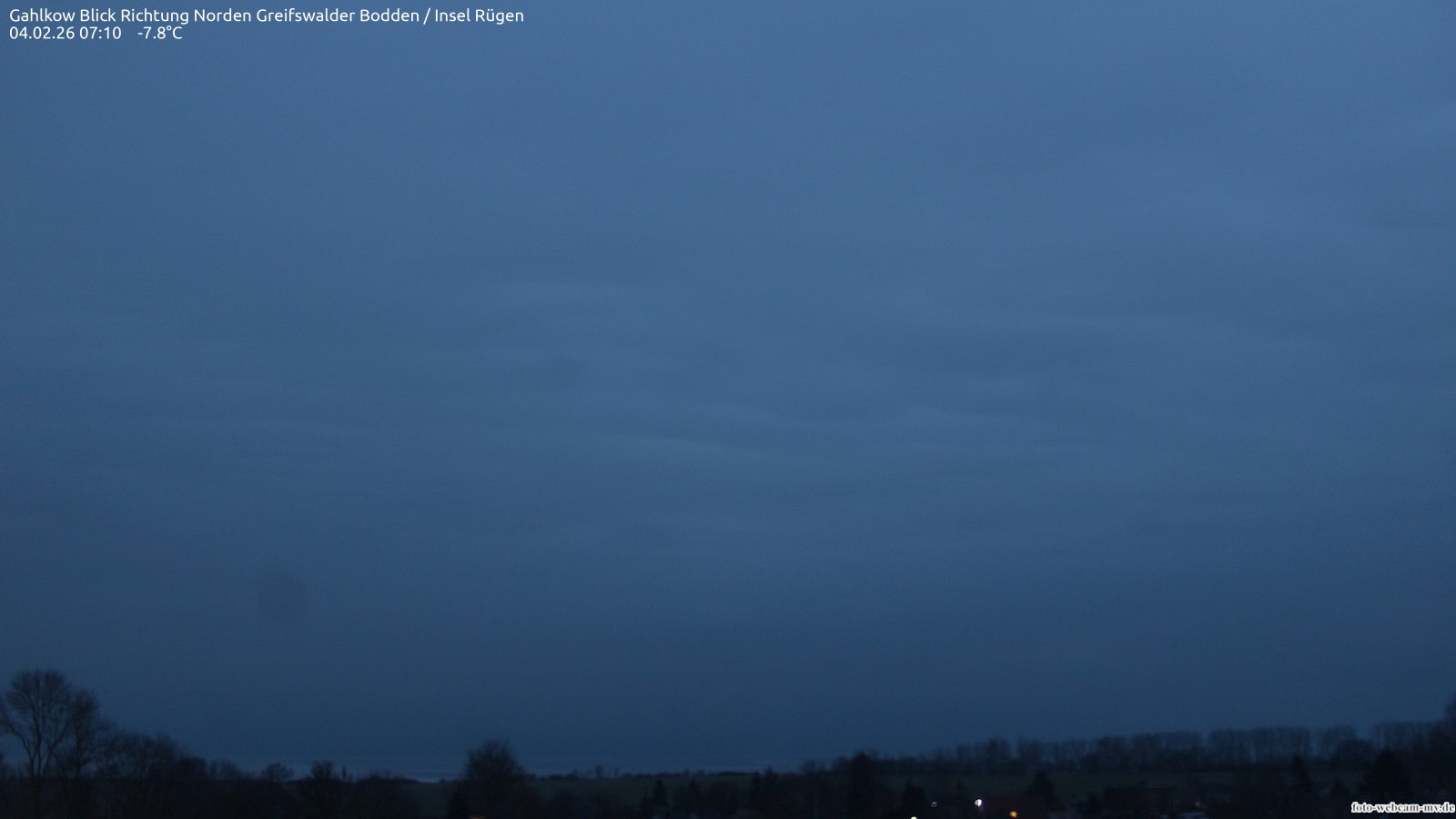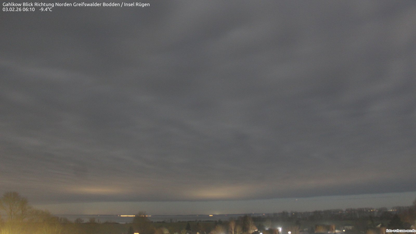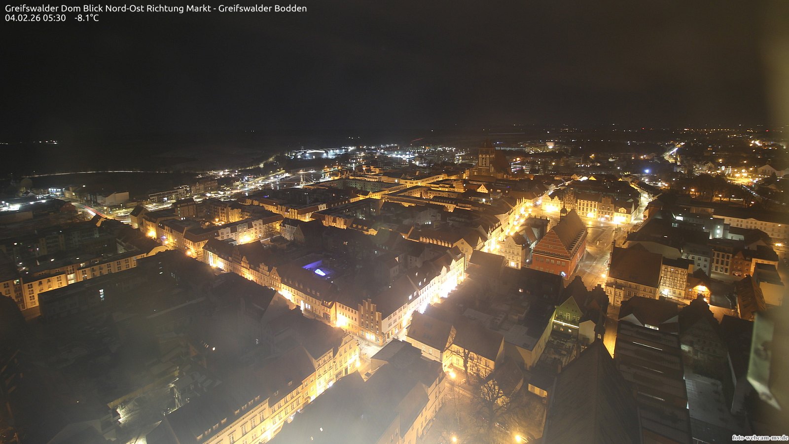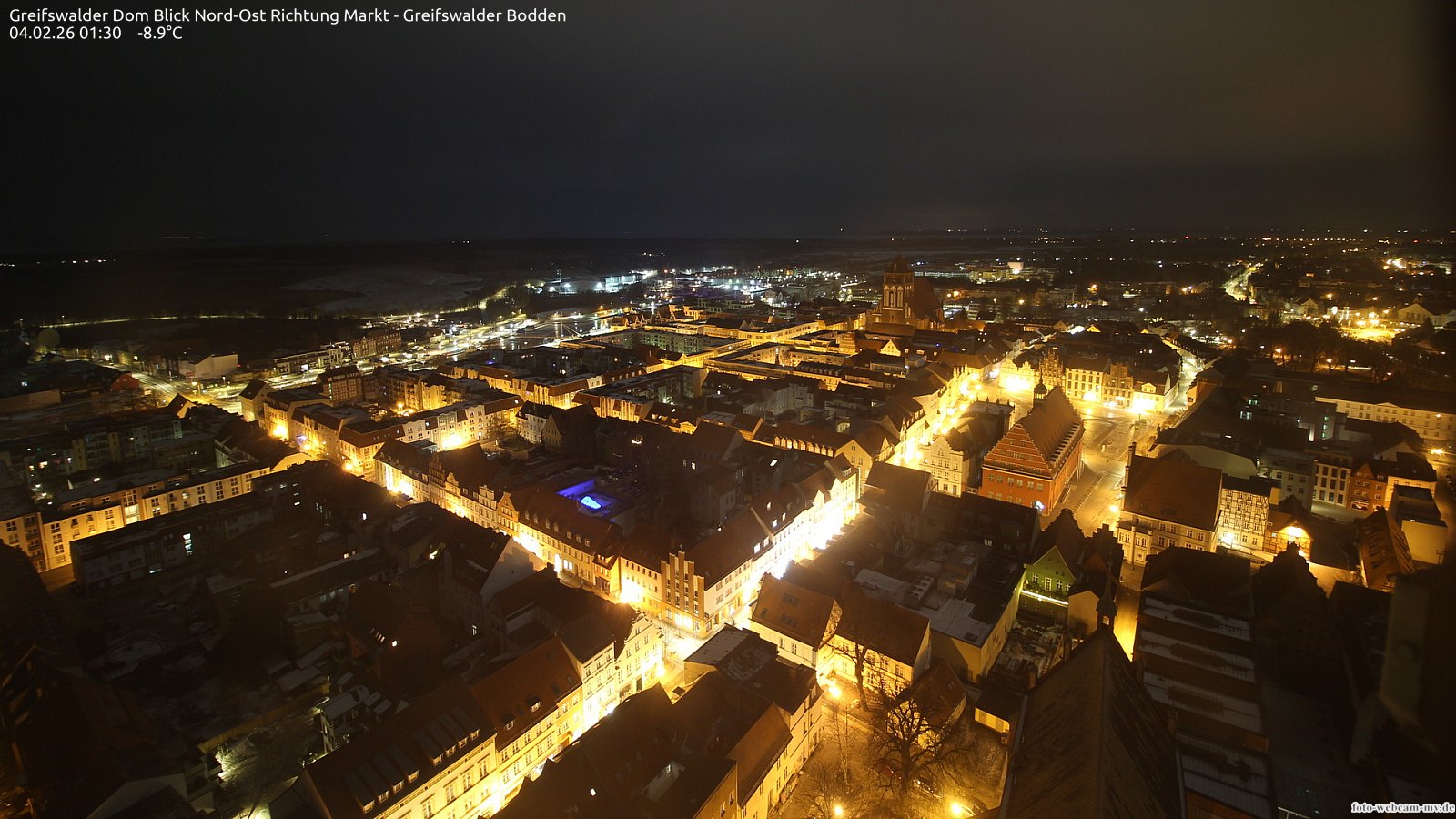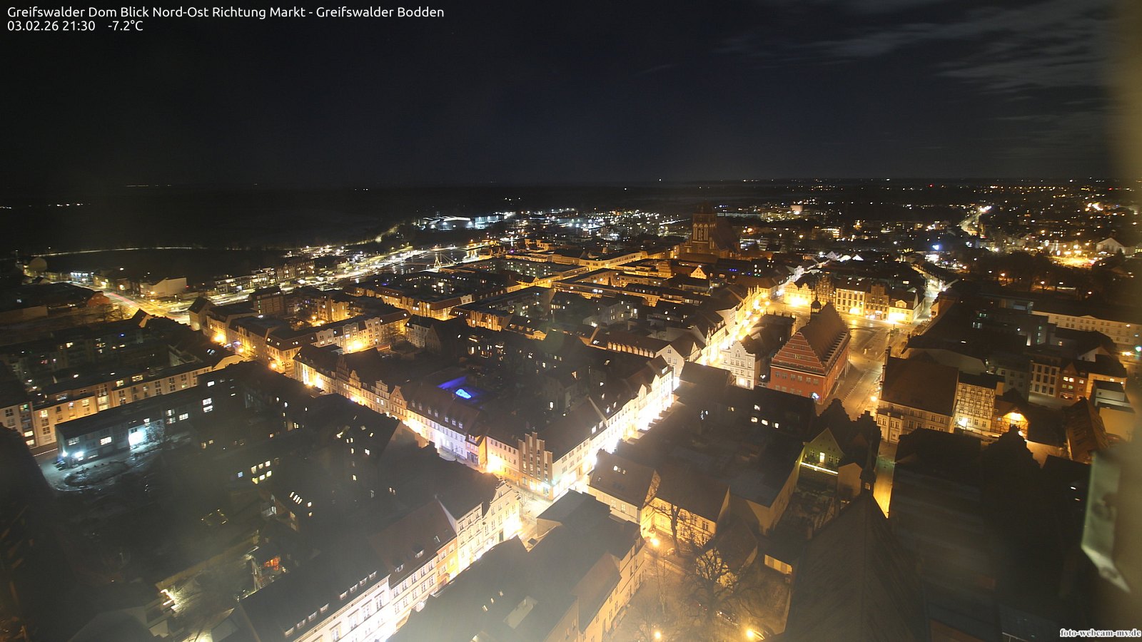 Usedom, Deutschland - 21.8 km von Alt Teterin: Blick Richtung Peenestrom - Die Webcam befindet sich in der Stadt Usedom. Angebracht ist sie in Höhe des Uhrwerkes der Marienkirche. Die Blickrichtung ist über den Dächern Usedoms hinweg in Richtung Peenestrom.