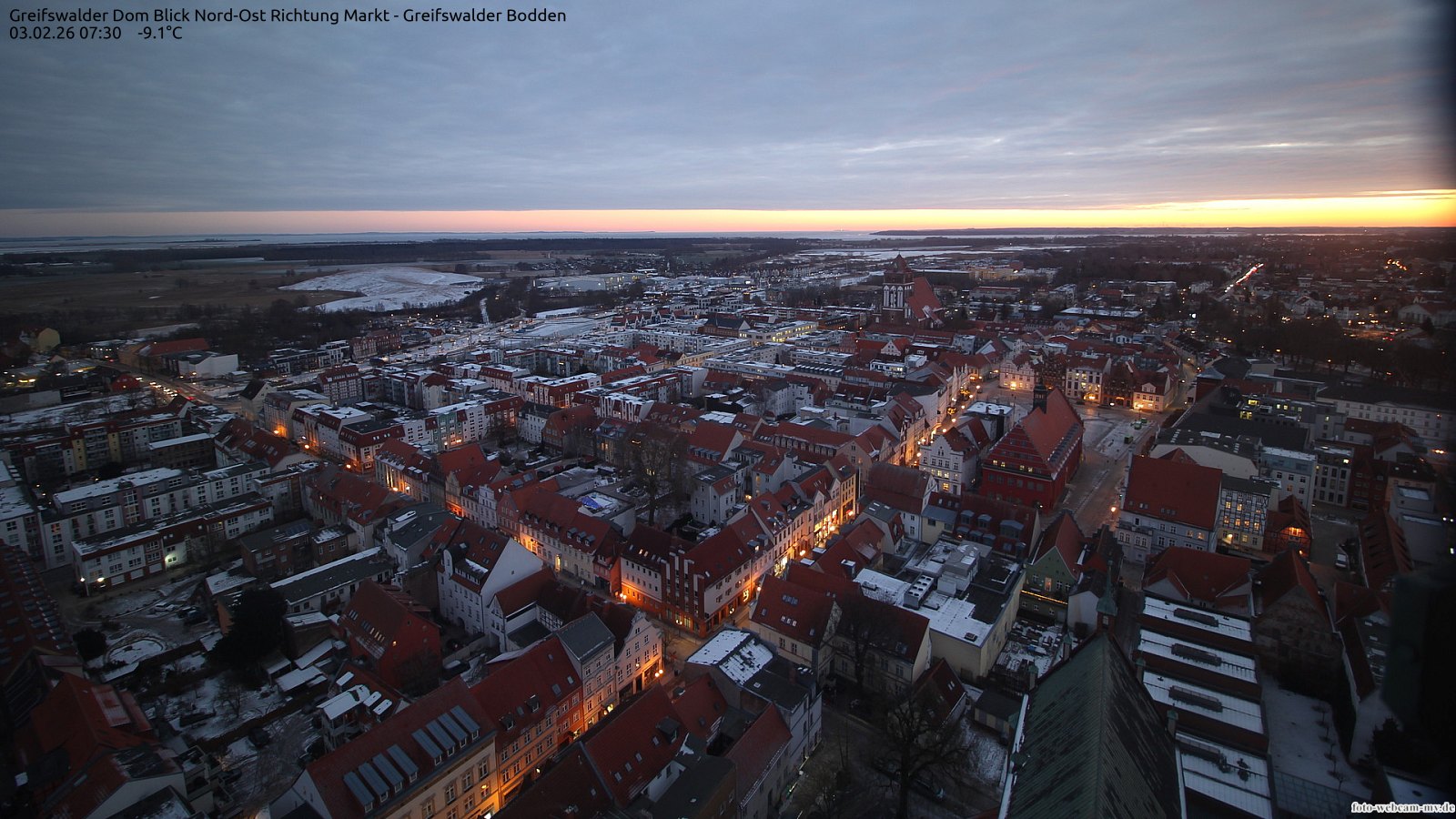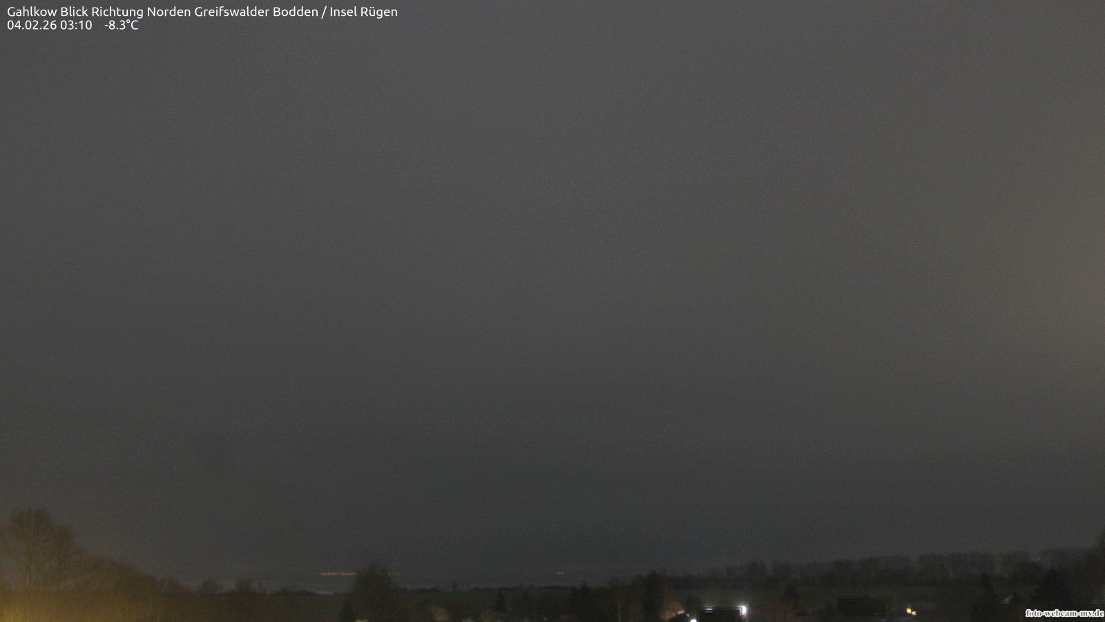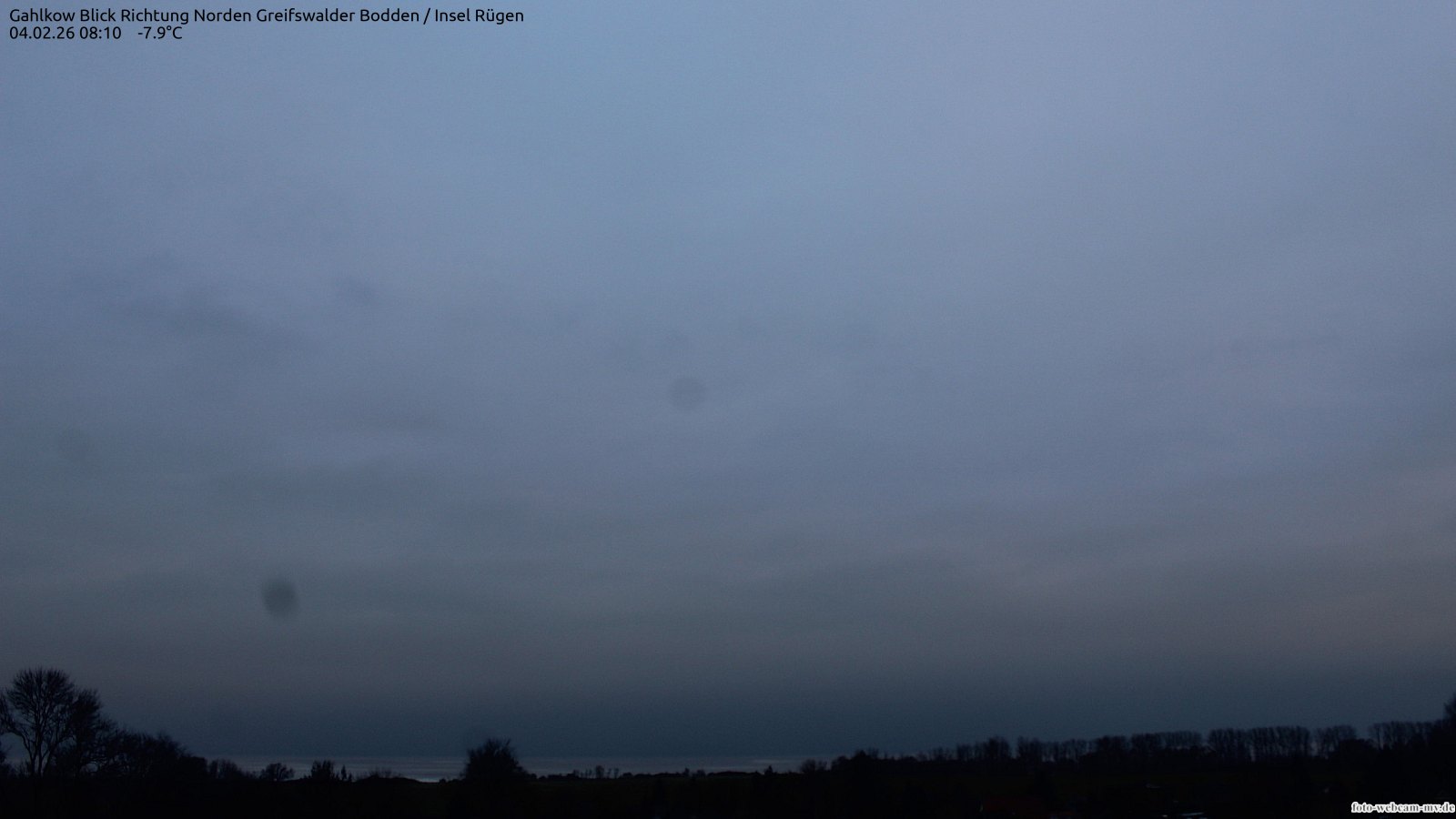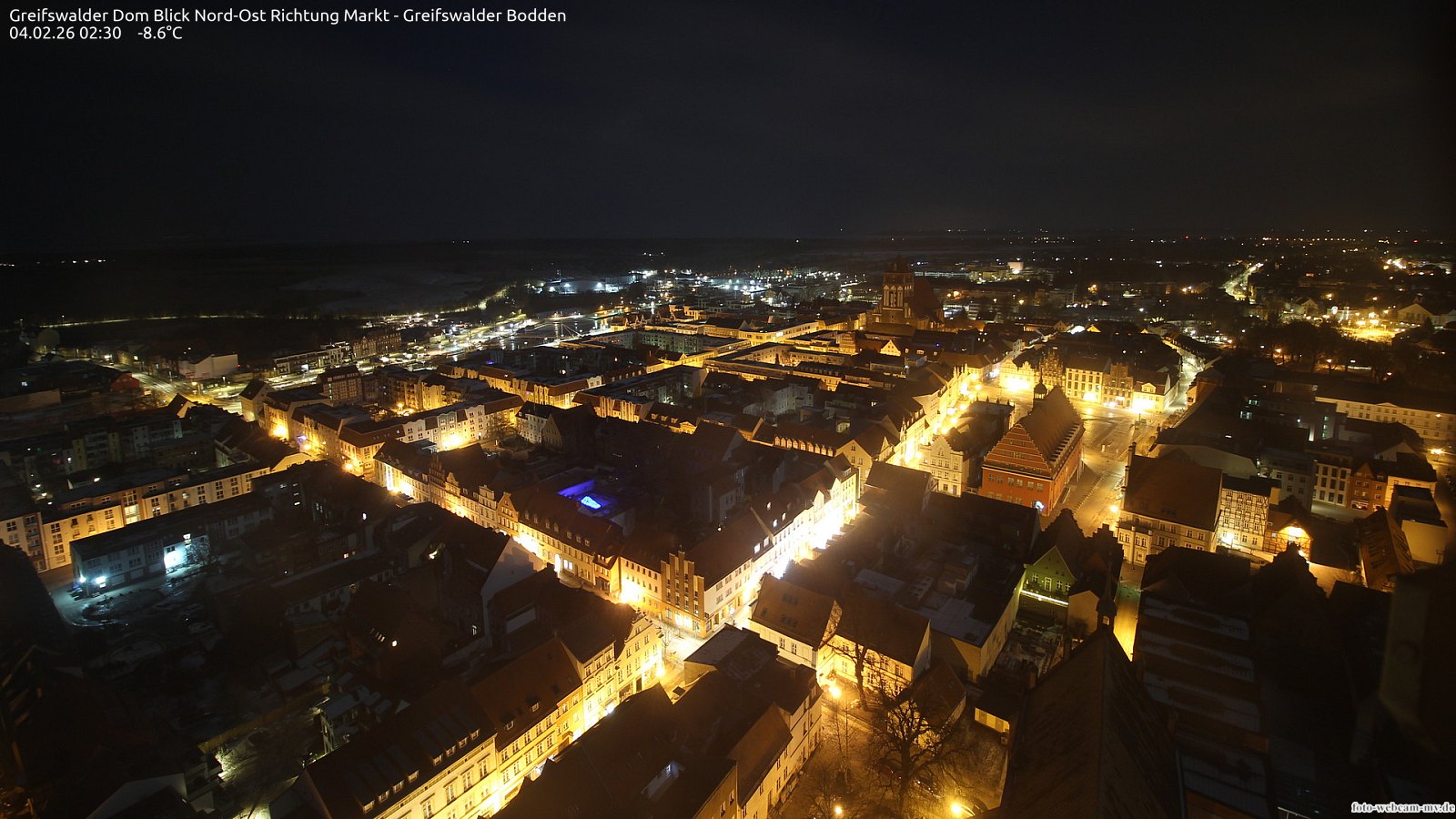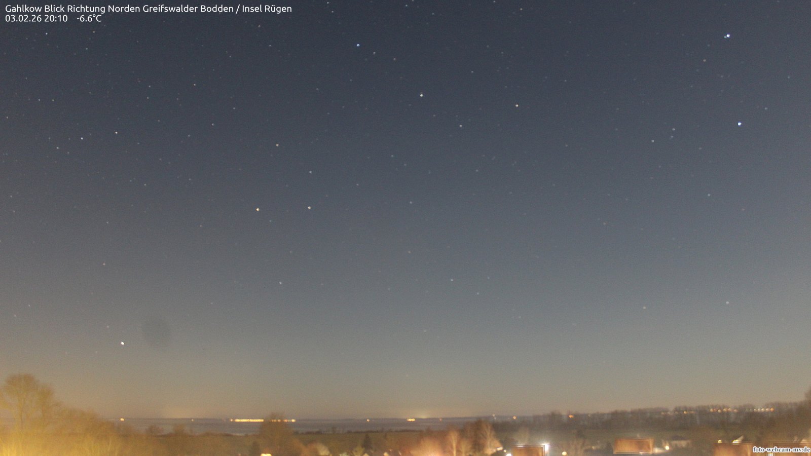 Usedom, Deutschland - 21.8 km von Alt Teterin: Blick Richtung Peenestrom - Die Webcam befindet sich in der Stadt Usedom. Angebracht ist sie in Höhe des Uhrwerkes der Marienkirche. Die Blickrichtung ist über den Dächern Usedoms hinweg in Richtung Peenestrom.