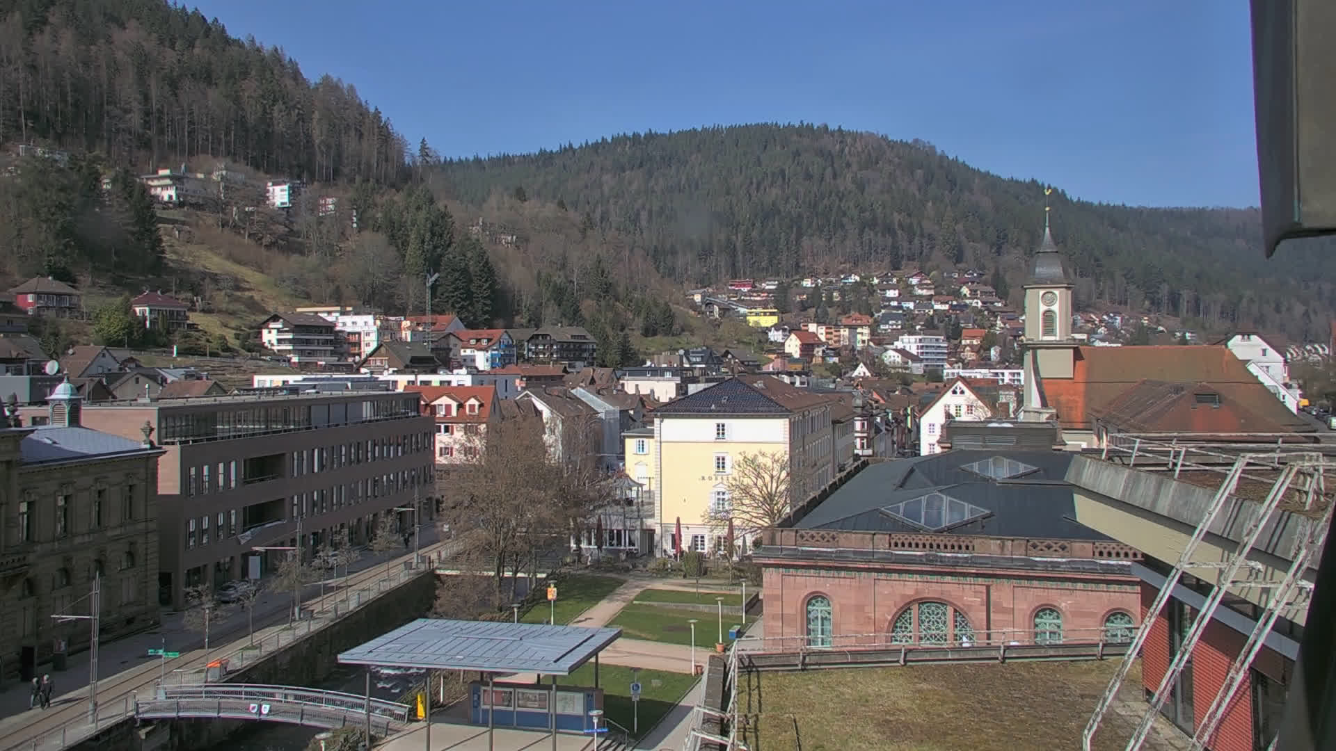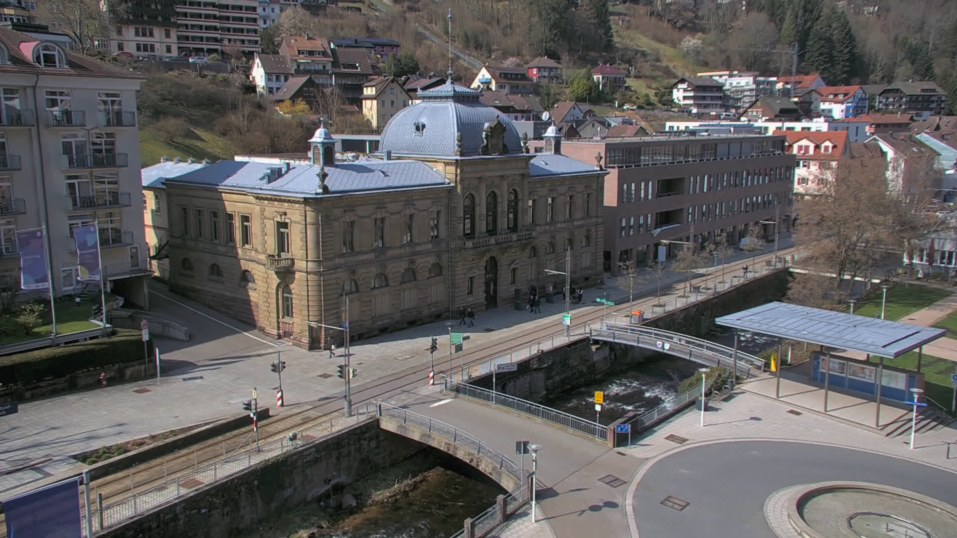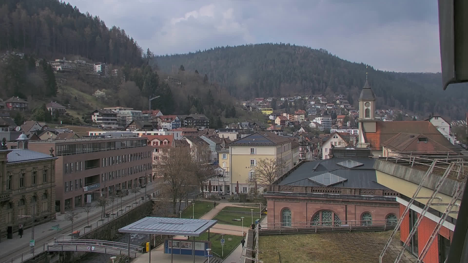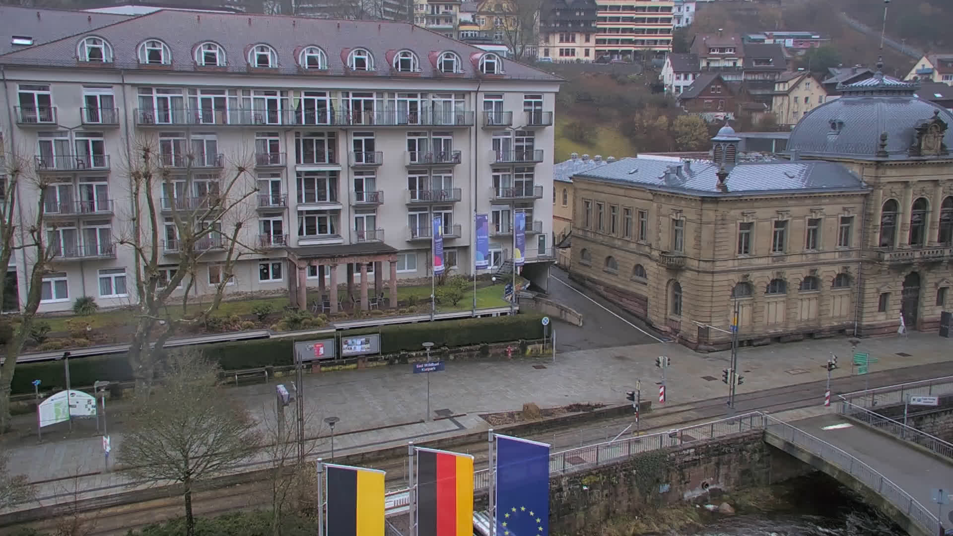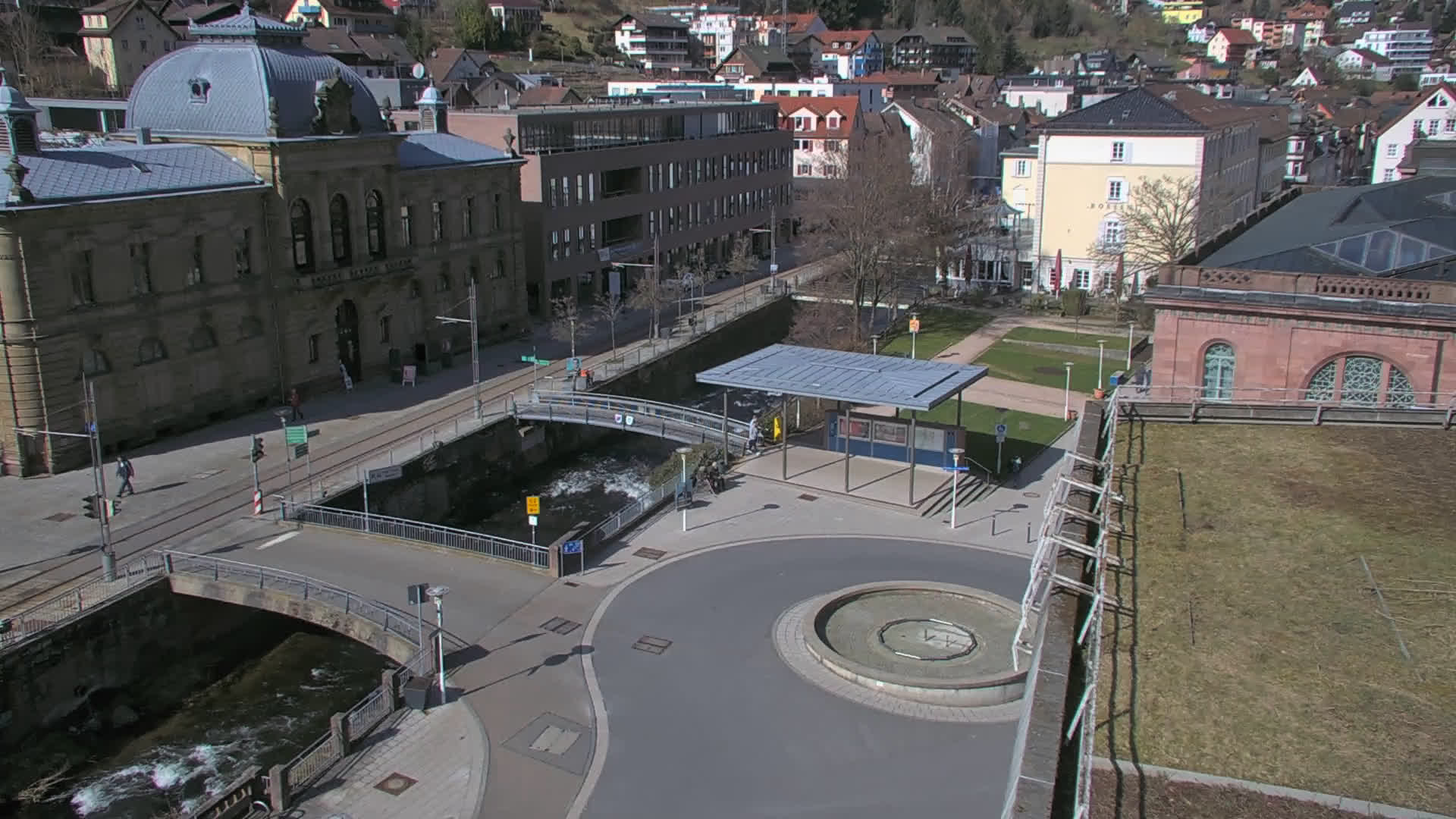 Bad Wildbad, Deutschland - 11.7 km von Altburg: Blick auf den Kurplatz - Live-Stream auf den Kurplatz und die S-Bahnhaltestelle (Flashstream oder Active-X).