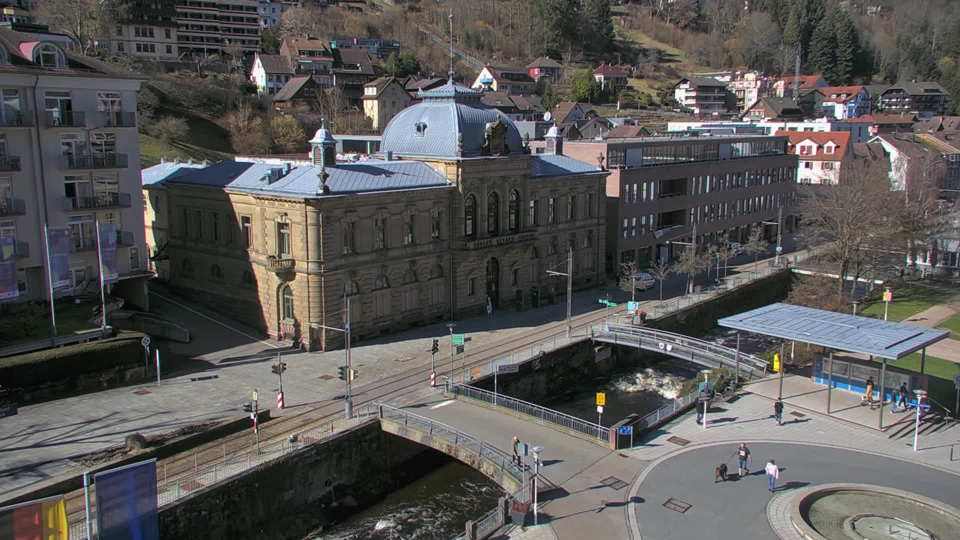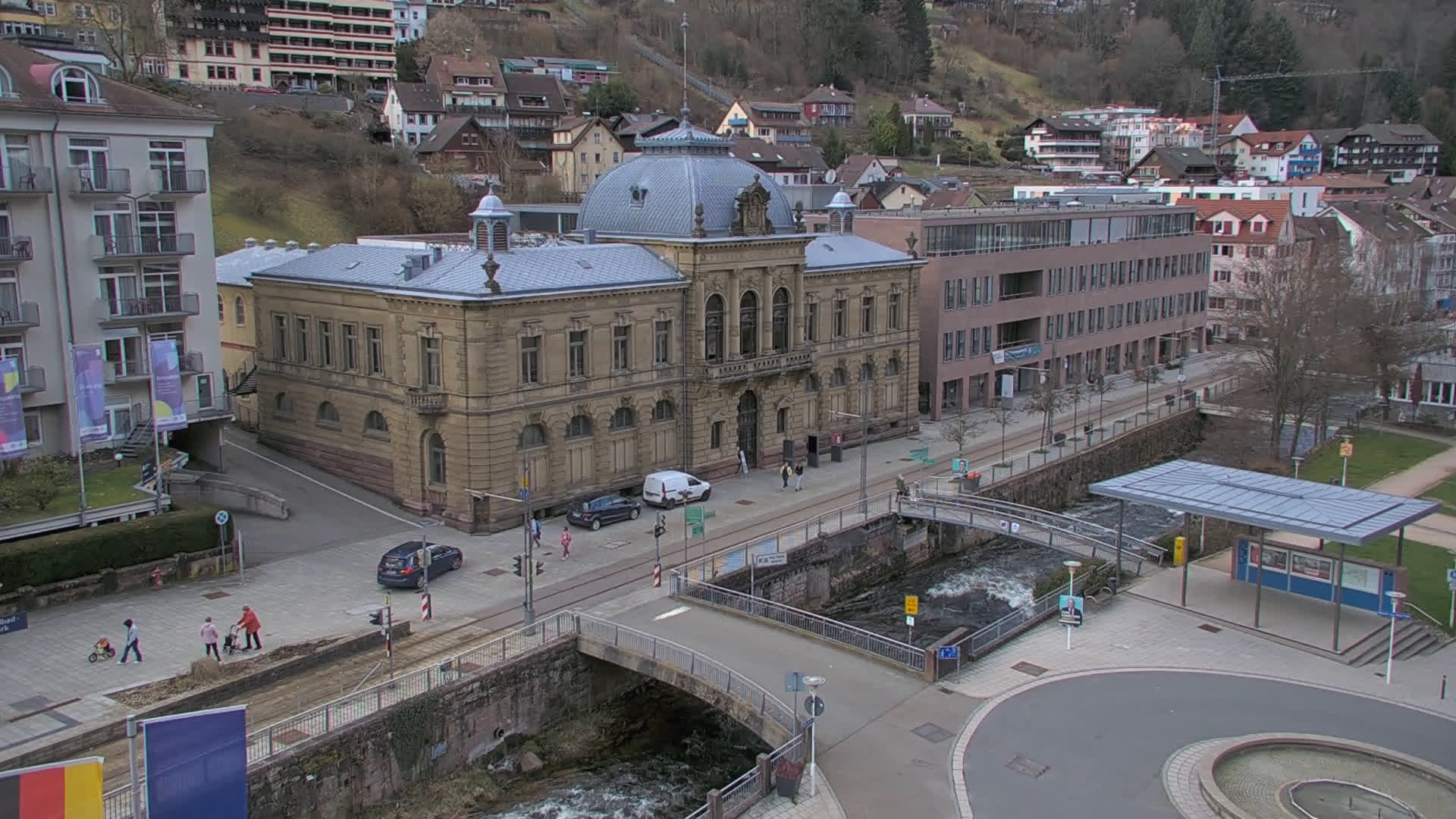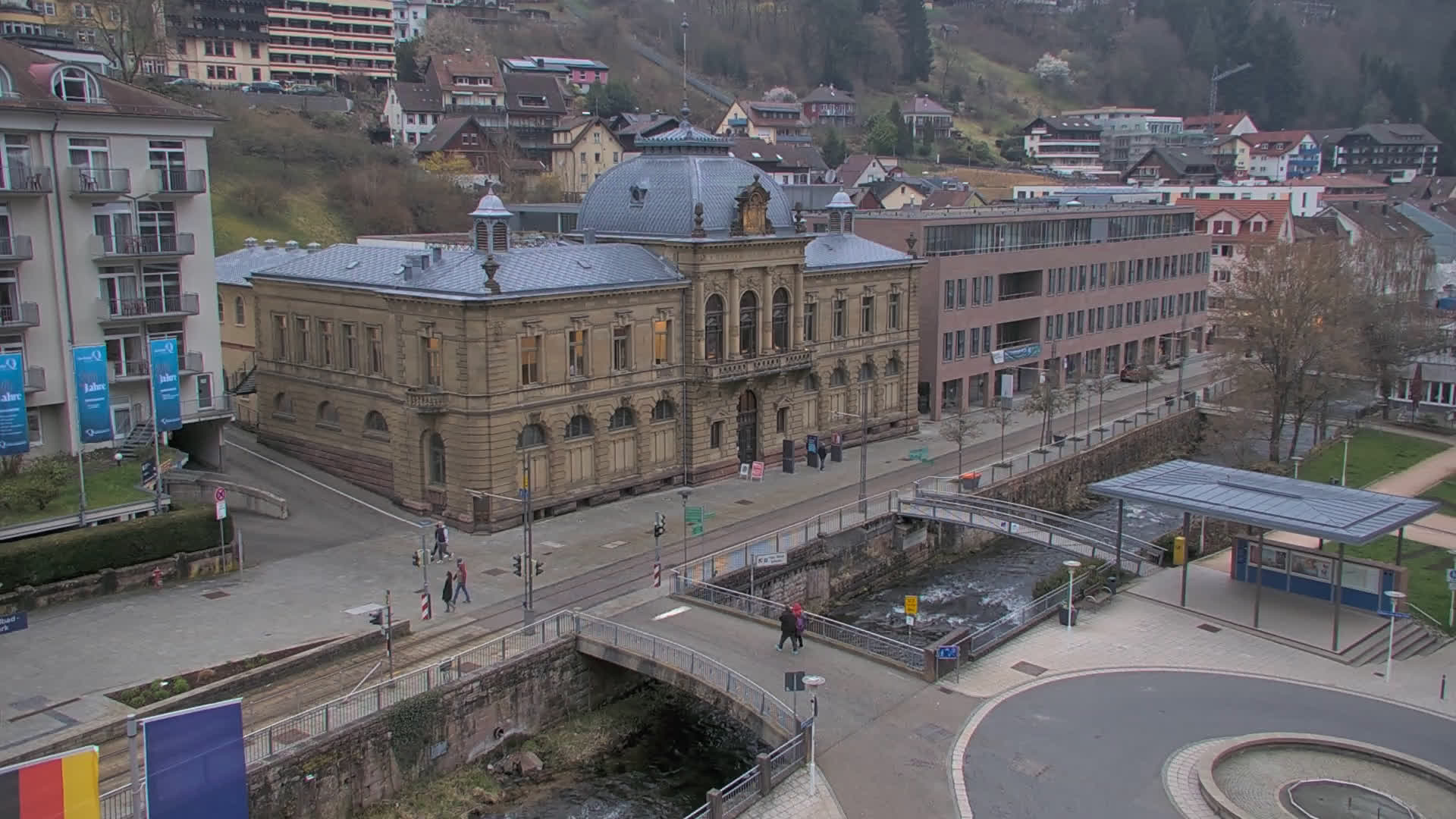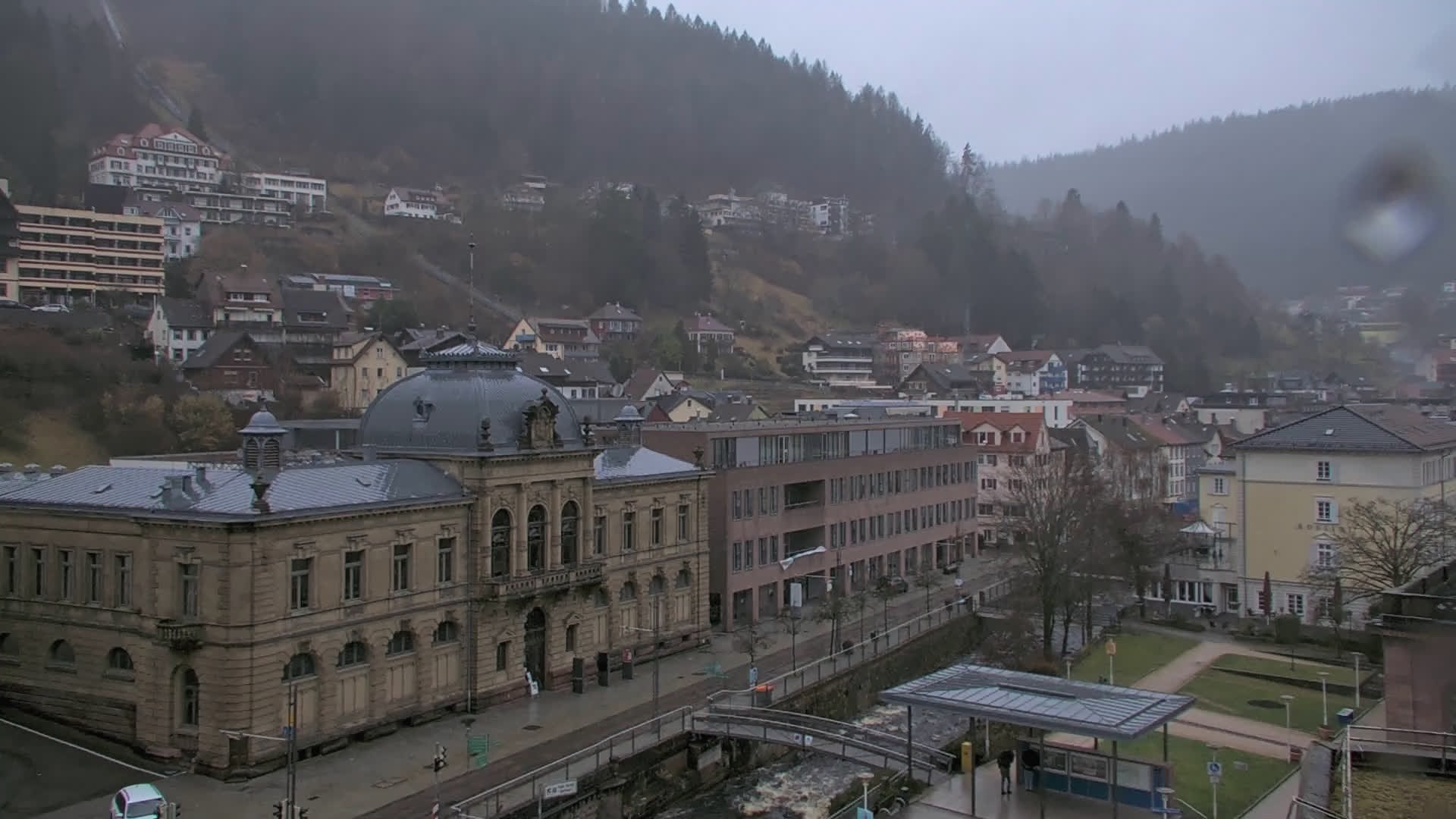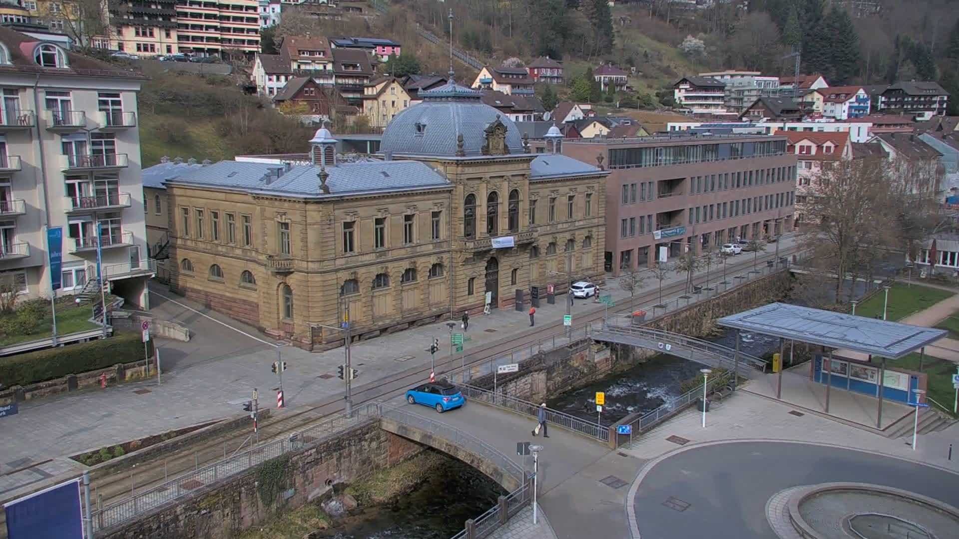 Bad Wildbad, Deutschland - 11.7 km von Altburg: Blick auf den Kurplatz - Live-Stream auf den Kurplatz und die S-Bahnhaltestelle (Flashstream oder Active-X).