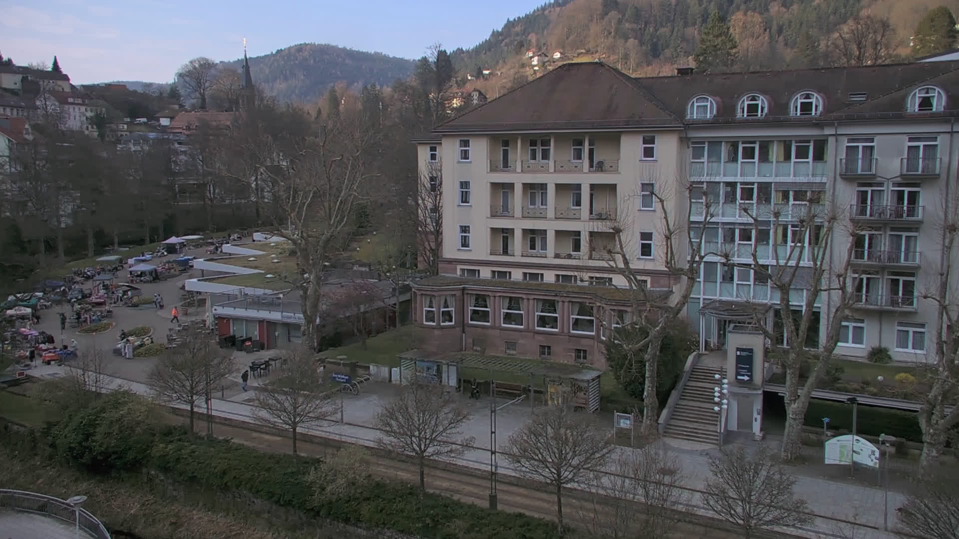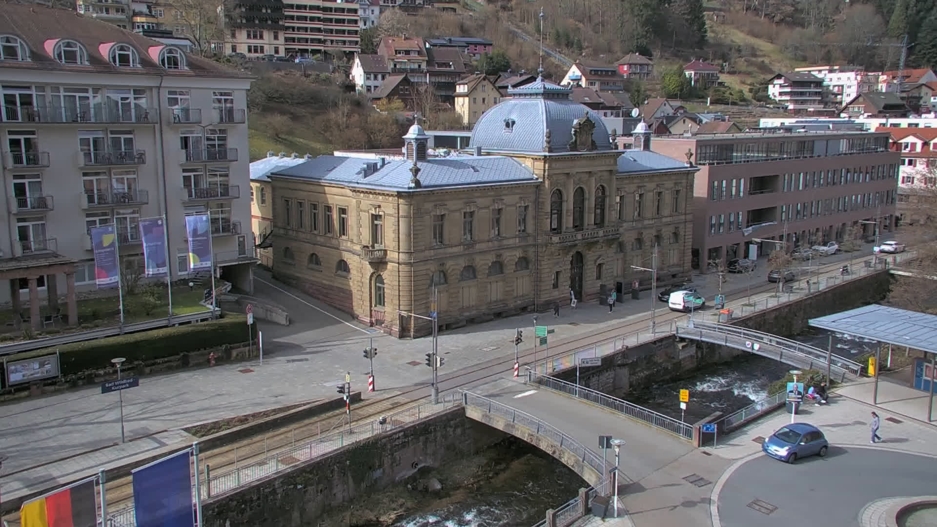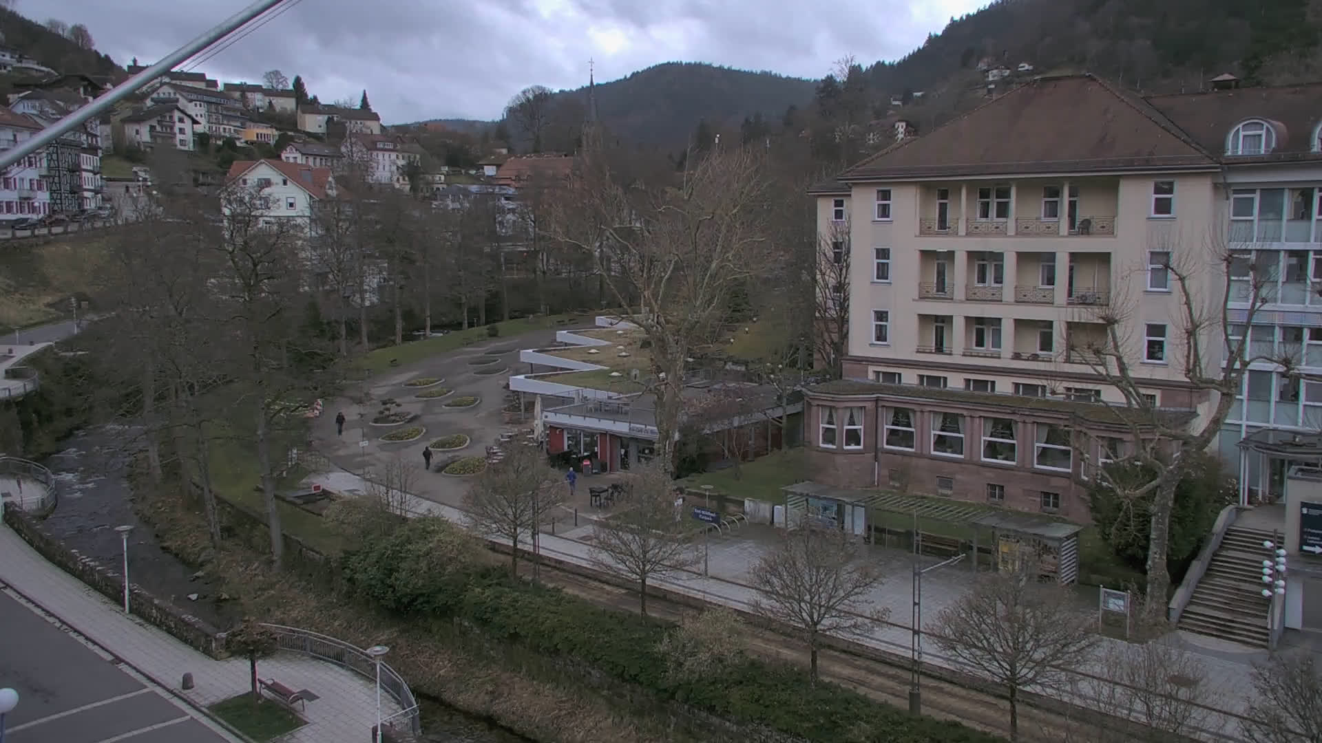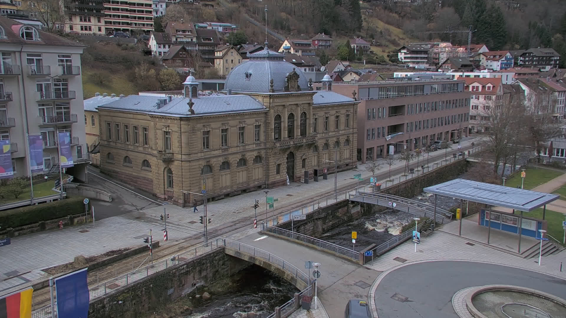 Bad Wildbad, Deutschland - 11.7 km von Altburg: Blick auf den Kurplatz - Live-Stream auf den Kurplatz und die S-Bahnhaltestelle (Flashstream oder Active-X).