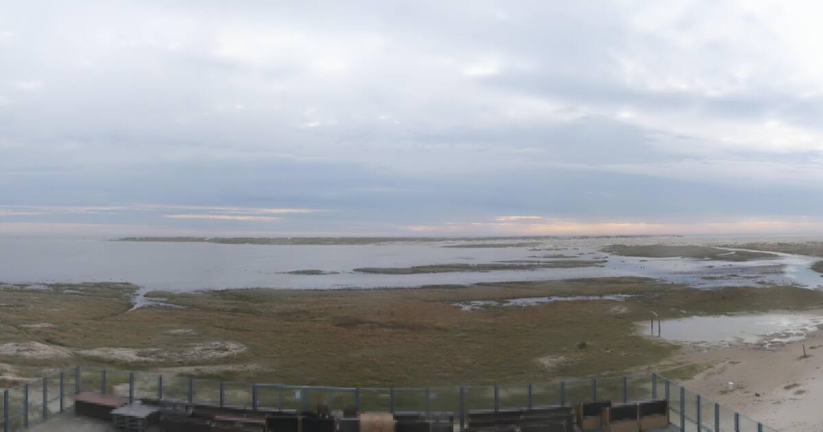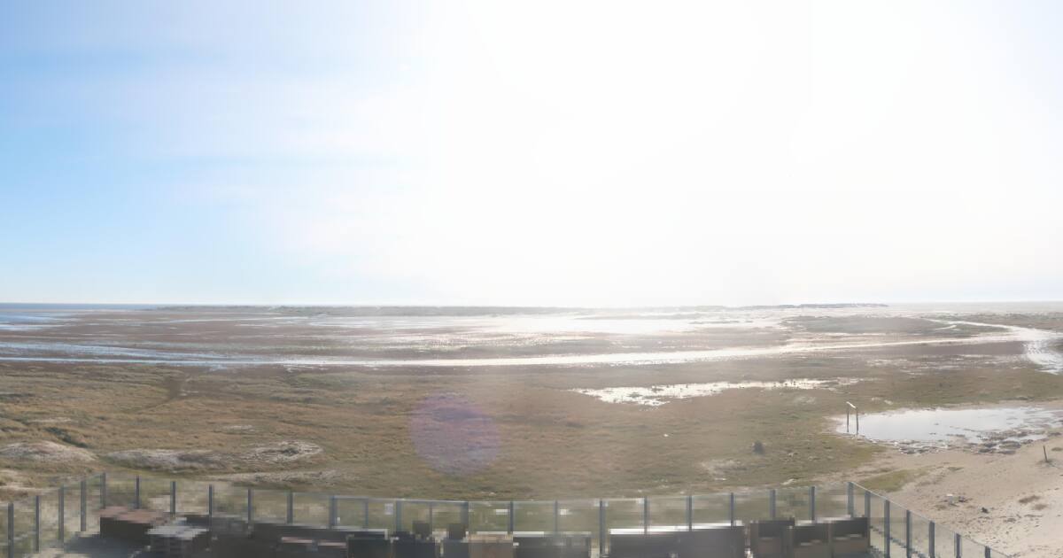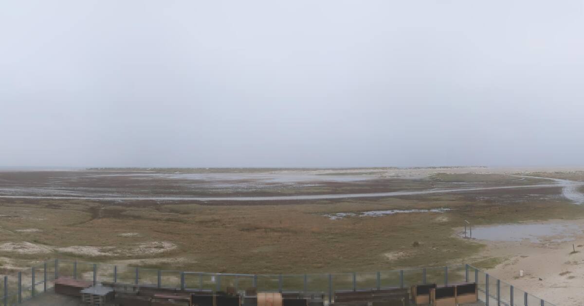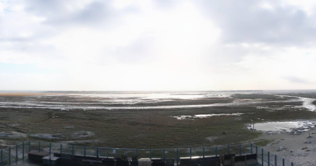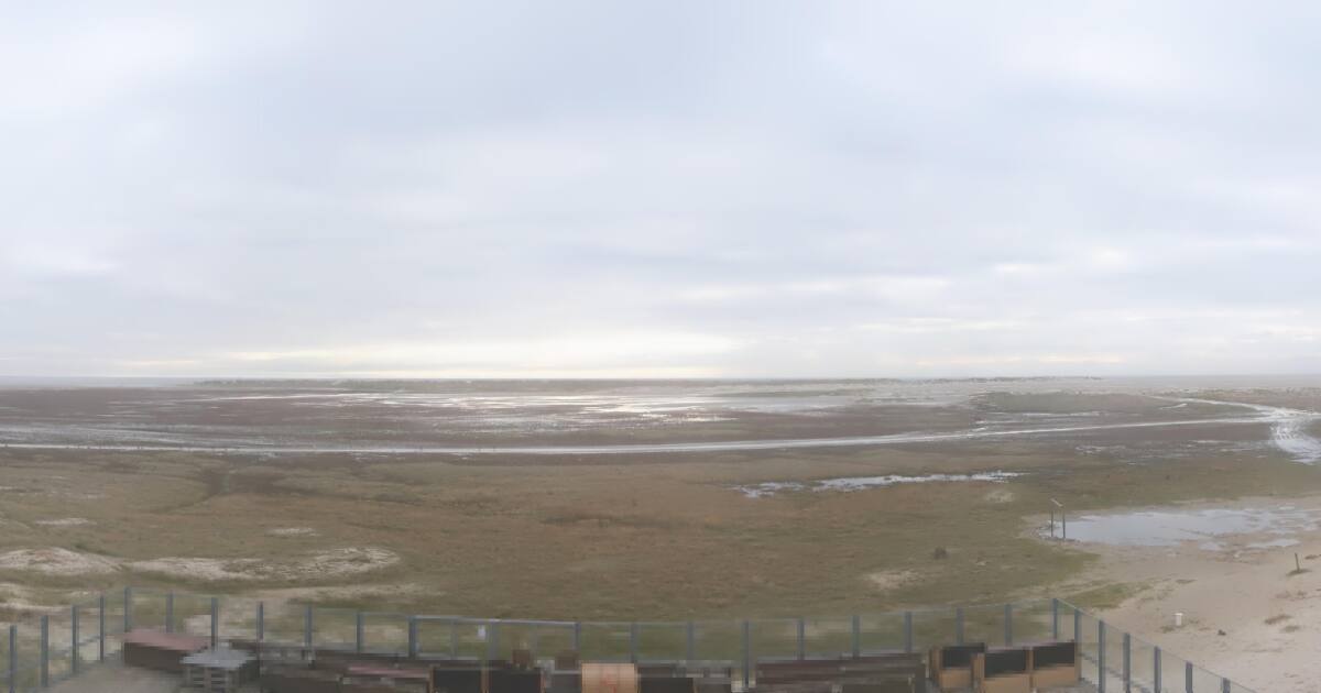 Langeneß, Deutschland - 13.7 km von Alte Kirche: Blick auf Nordsee und Hallig Gröde - Blick von der Neuwarft auf der Hallig Langeneß in Richtung Osten über die Nordsee und das Wattenmeer zur Nachbarhallig Gröde