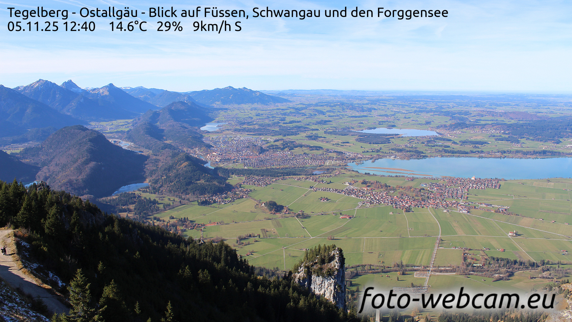 Füssen, Deutschland - 2.5 km von Alterschrofen: Panocam Kinker - Die Kamera zeigt das Allgäu von seiner schönsten Seite. Der Blick streicht vom Berghof Kinker über das liebliche Voralpenland bis zum Forggensee. Im Hintergrund erheben sich majestätisch die Allgäuer- und Lechtaler Alpen. Bekannte Sehenswürdigkeiten sind das Schloss Neuschwanstein, das Schloss Hohenschwangau und das Hohe Schloss von Füssen.
